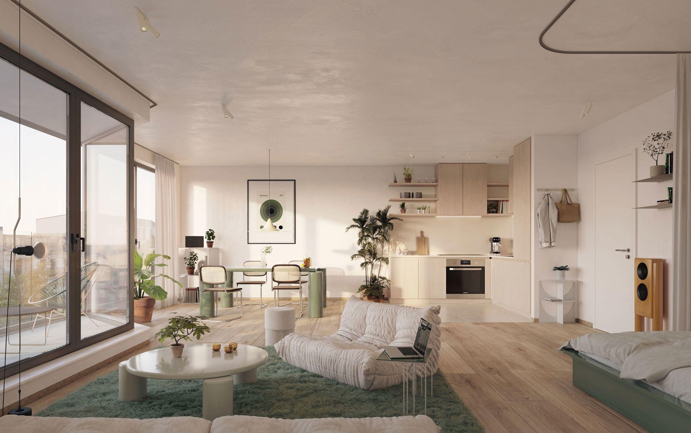 EVERE - Located in the conversion of an Art Deco style building, in a quiet, residential area, close to numerous amenities (schools, shops, airport, NATO, bus, Evere train station, Ring, E40, ...), beautiful new STUDIO (1shower) of 41.6 m² with a TERRACE. Located on the 3rd floor, it comprises an entrance hall, a 23 m² living room with bay windows opening onto the terrace, a super-equipped open-plan kitchen, a shower room (washbasin, shower, WC) and a separate utility room. The site also features a shared GARDEN and a PETANQUE court. Carefully designed, the building offers a high standard of finish and equipment (heat pumps, underfloor heating, etc.), as well as high-performance insulation. EPB B+. Additional parking and cellar. Bicycle and cargo bike parking available. Secure shared room for pushchairs. Sale of the land subject to registration duty (12.5%) and of the building subject to VAT (21%). Find out more at L&P !