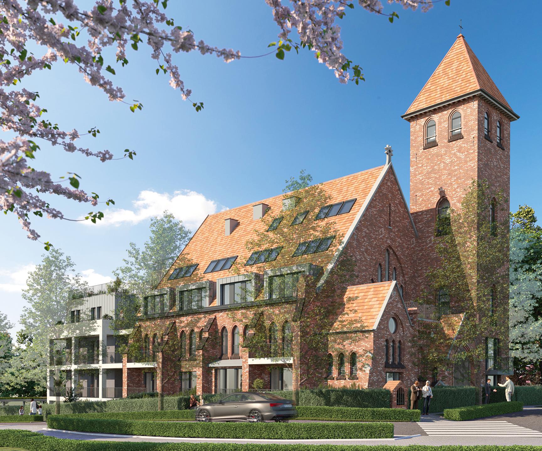 UCCLE - In the charming, quiet residential area of Parvis Chantecler (with numerous schools, playground, Linkebeek and Moensberg train stations and bus services), beautiful APARTMENT (2bed/1bath/1shower ) of 117 m² featuring a 5 m² TERRACE and a beautiful 120 m² GARDEN. Located on the ground floor, it includes an entrance hall with a separate toilet, a cloakroom, and a technical room, a spacious living room with an open-plan fully-equipped kitchen opening onto the terrace and garden, a laundry area, a master suite with a bedroom, dressing room, and bathroom (sink, bathtub, toilet), a second bedroom with an adjoining shower room (sink, shower). The apartment is part of an exceptional TOTAL REDEVELOPMENT project of the SAINT-JOSEPH CHURCH. This extensive renovation preserves the building's structure and character while offering contemporary and bright living spaces, high-quality finishes, and a high level of acoustic and thermal insulation. EPC from B to C. Cellar included. Parking required at an additional cost. Bicycle parking and secure bike storage area provided. Sale of the land subject to registration fees (12.5%) and the construction subject to VAT (21%). Possibility of 6% VAT, subject to conditions. Discover it now with L&P!