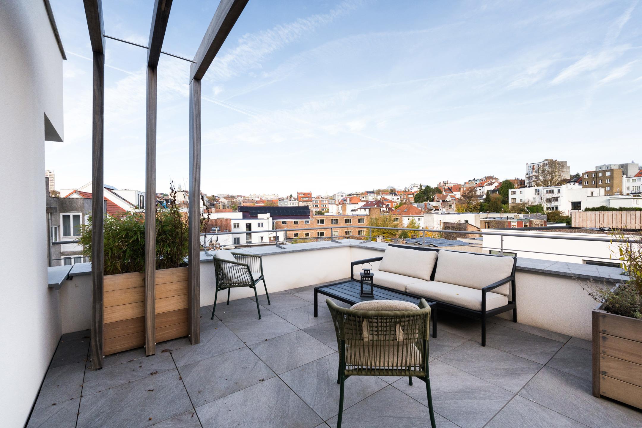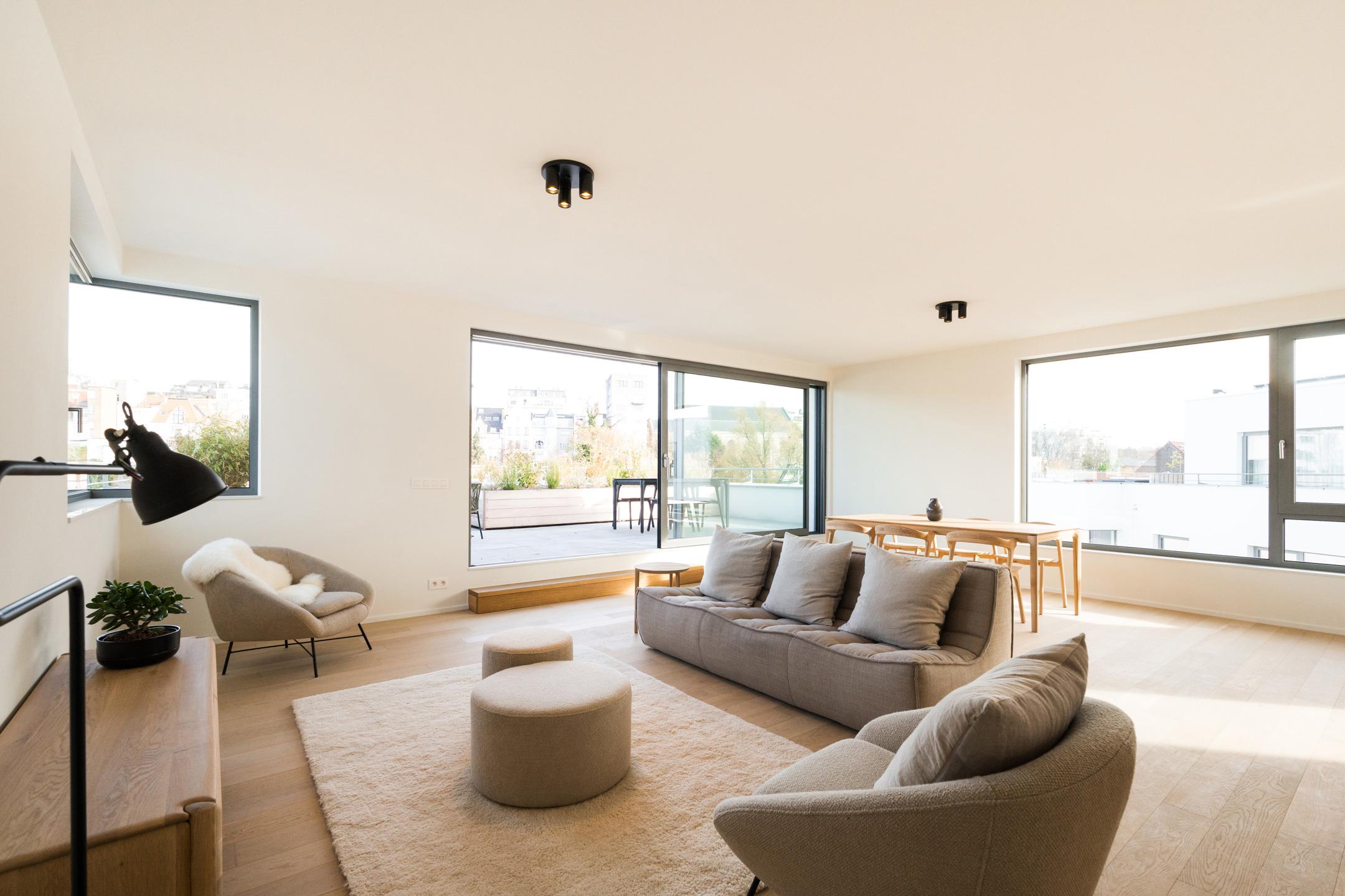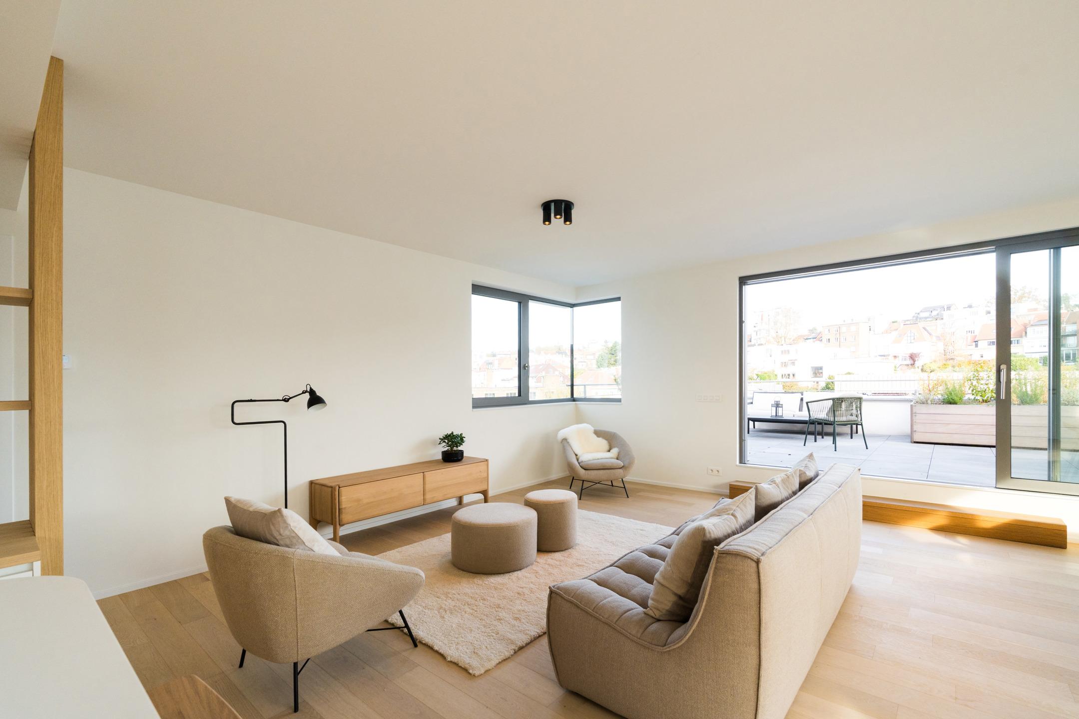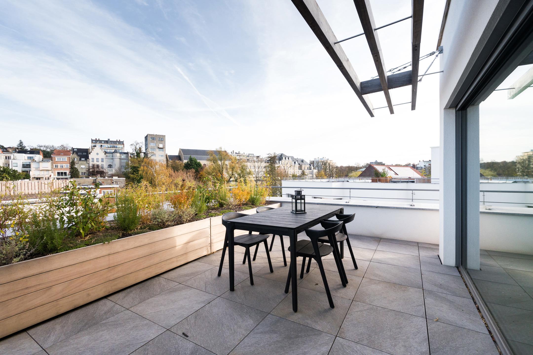 UCCLE - located between Square Coghen and rue du Doyenné, a stone's throw from the Parvis Saint-Pierre, magnificent NEW 140 m² PENTHOUSE (2bed/1sdd/1bath) with TERRACE of 30 m². Located on the 3rd floor of a small, modernist-inspired building, it comprises an entrance hall with guest WC, a bright living room with super-equipped open-plan kitchen opening onto the terrace, a utility room, a night hall, a bedroom with en suite bathroom (washbasin, shower, bath, bronze taps), a master bedroom with en suite bathroom (washbasin, bath, bronze taps) and separate WC.It also benefits from a superb, secure SHARED GARDEN and boasts high-quality interior finishes and excellent energy performance (HEAT PUMP, UNDERGROUND HEATING, high levels of insulation). EPB A. Cellar included. Car and cargo bike parking available at extra cost. Sale subject to 21% VAT. Possibility of 6% VAT, subject to conditions. Find out more at L&P !