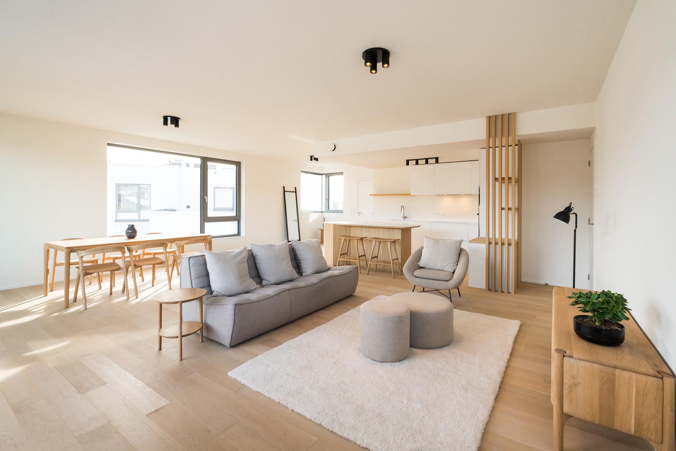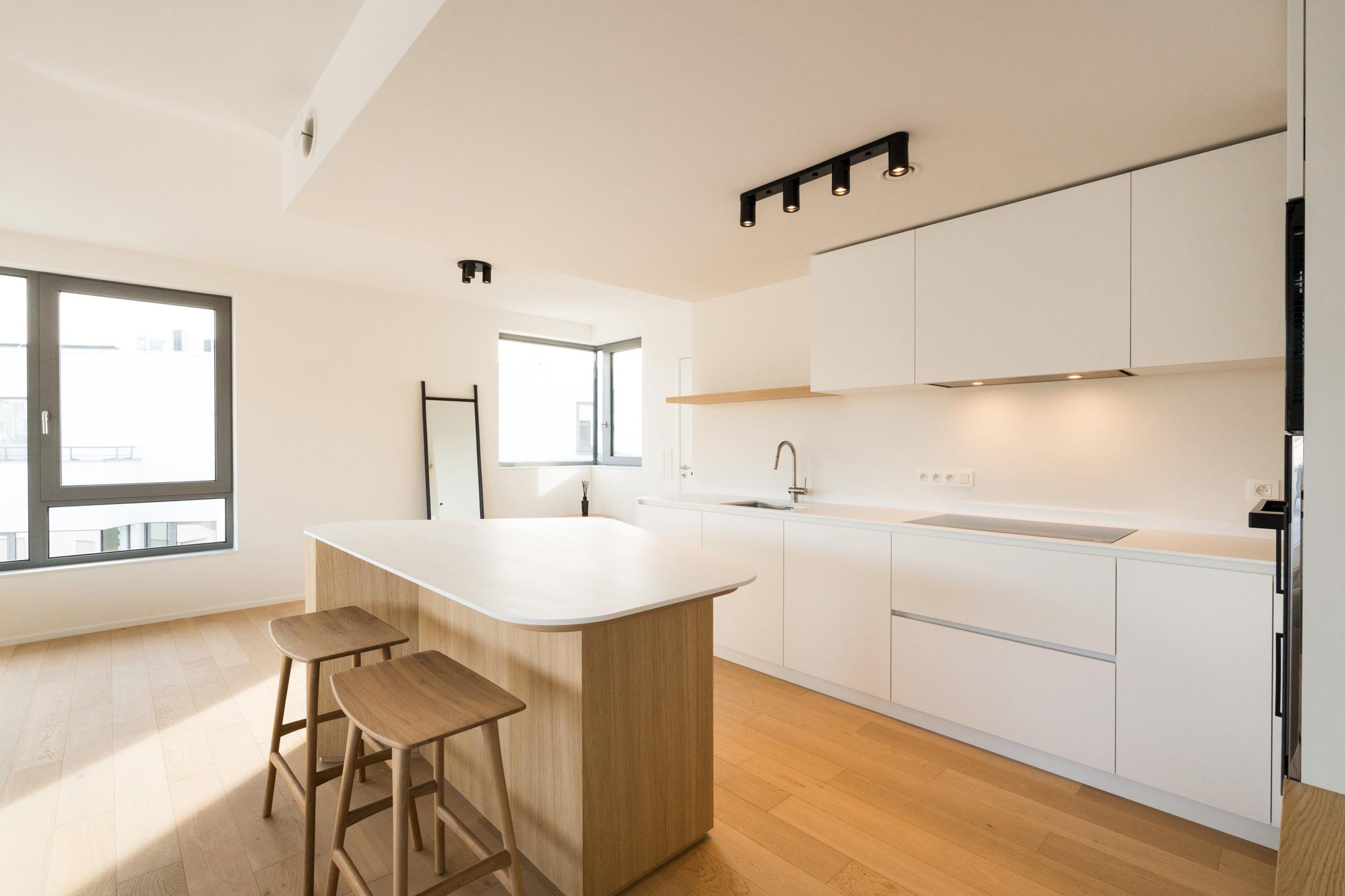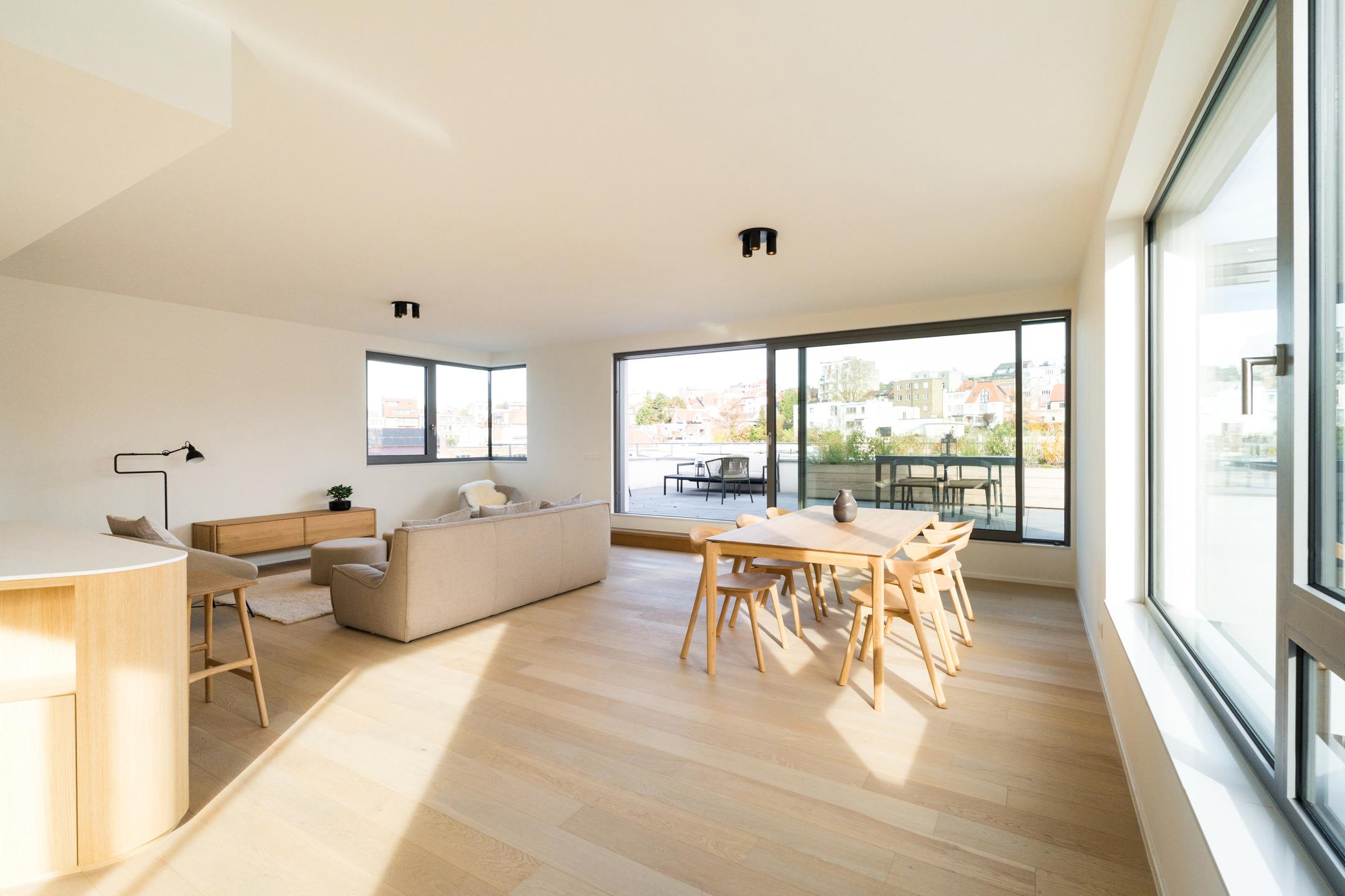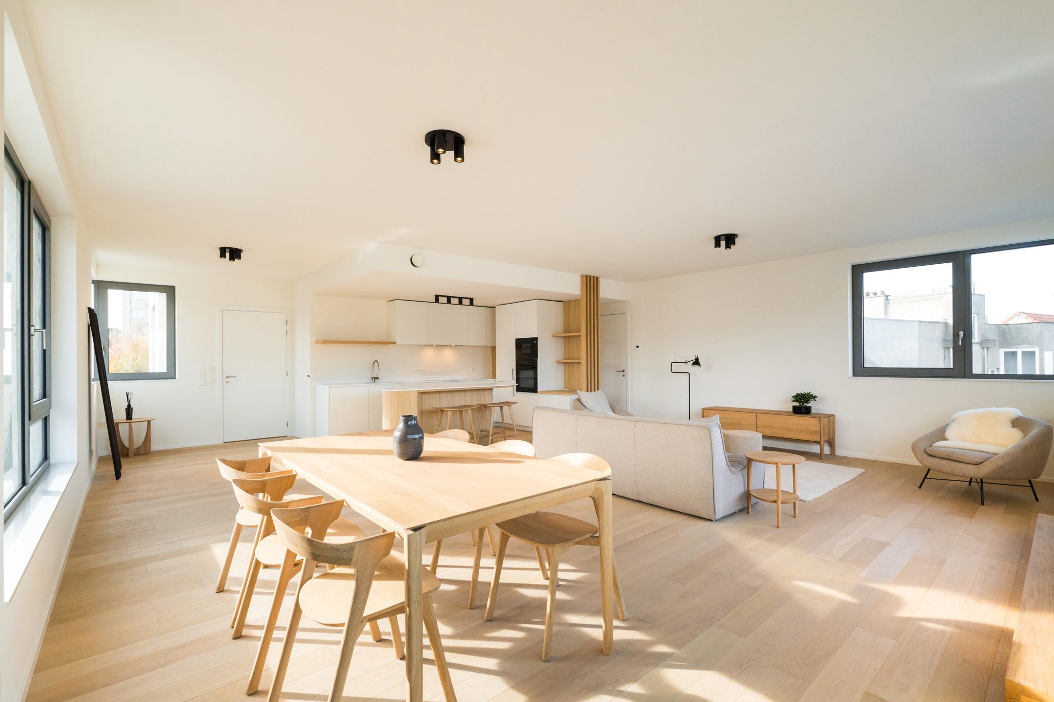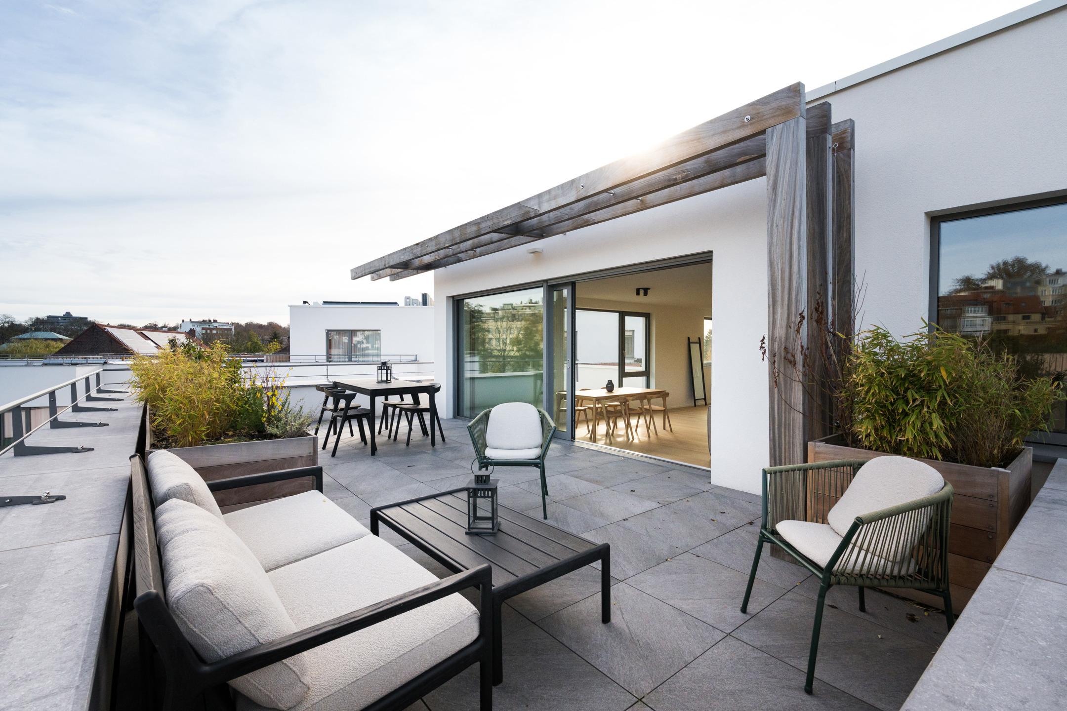 UCCLE - located between Square Coghen and rue du Doyenné, a stone's throw from the Parvis Saint-Pierre, magnificent NEW 140 m² PENTHOUSE (2bed/1sdd/1bath) with TERRACE of 30 m². Located on the 3rd floor of a small, modernist-inspired building, it comprises an entrance hall with guest WC, a bright living room with super-equipped open-plan kitchen opening onto the terrace, a utility room, a night hall, a bedroom with en suite bathroom (washbasin, shower, bath, bronze taps), a master bedroom with en suite bathroom (washbasin, bath, bronze taps) and separate WC.It also benefits from a superb, secure SHARED GARDEN and boasts high-quality interior finishes and excellent energy performance (HEAT PUMP, UNDERGROUND HEATING, high levels of insulation). EPB A. Cellar included. Car and cargo bike parking available at extra cost. Sale subject to 21% VAT. Possibility of 6% VAT, subject to conditions. Find out more at L&P !