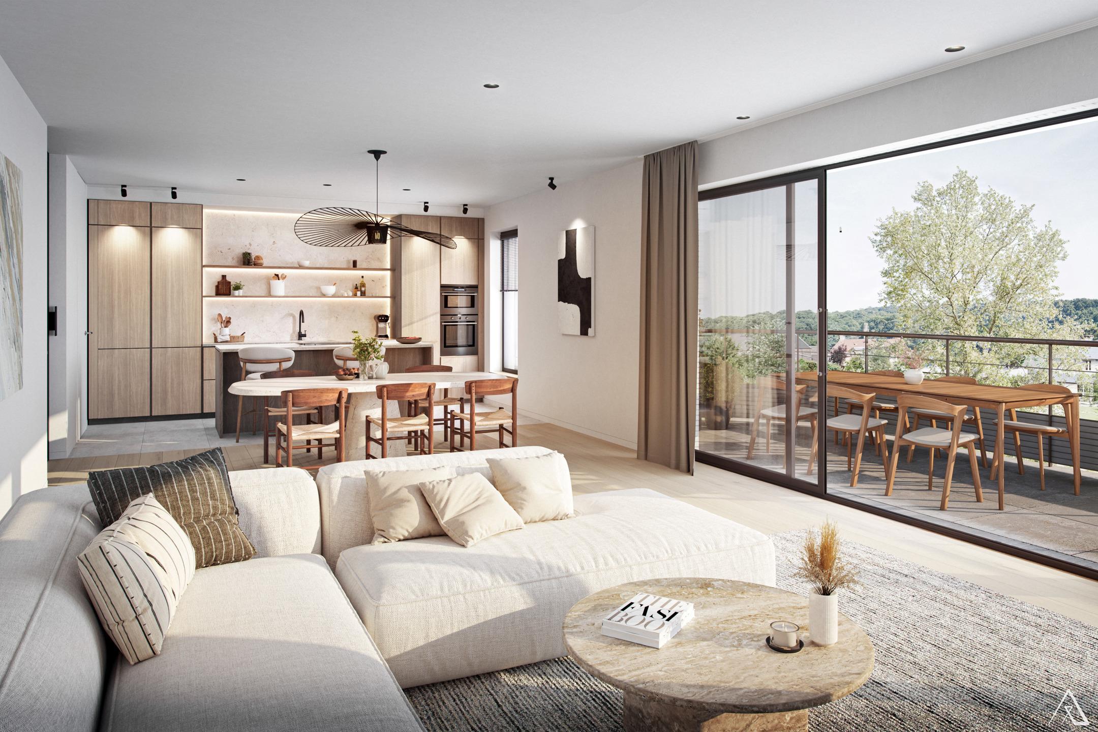 WOLUWE-SAINT-LAMBERT – Ideally located in a sought-after neighborhood, on the edge of a Natura 2000 zone along the Woluwe and just steps away from the charming Chemin de Vellemolen, Parc Malou, the Woluwe Shopping Center, and all amenities (Roodebeek Metro, Bus, Tram 8, RO/E40, airport, Cliniques St Luc,...), beautiful NEW LUXURY APARTMENT (3bed/1bath/1shower) with a surface area of 166 m², featuring a large CORNER TERRACE of 34.7 m² (facing SW to NW) and access to a spacious SHARED GARDEN. Located on the first floor, it comprises an entrance hall with cloakroom area, guest WC, technical room and laundry room, a bright 53.8 m² living room with a fully equipped open kitchen opening onto the terrace (garden view), a pantry, a master bedroom of 19 m² with en-suite bathroom (double sink, bathtub, walk-in shower, WC), two additional bedrooms (14.6 and 14.8 m²), and a shower room (sink, walk-in shower). This apartment, with its modern and timeless architecture, stands out for its high level of finishes (custom-made woodwork and kitchen by ModulNova by FLAMANT, underfloor heating, video surveillance,...). Special attention has also been paid to the use of sustainable materials and technologies ensuring excellent energy and acoustic performance (private solar panels, advanced insulation, triple glazing, rainwater harvesting,...). EPC A to A+. Cellar and parking mandatory at extra cost. Sale of the land under registration duties (12.5%) and of the constructions under VAT (21%). To discover at L&P!