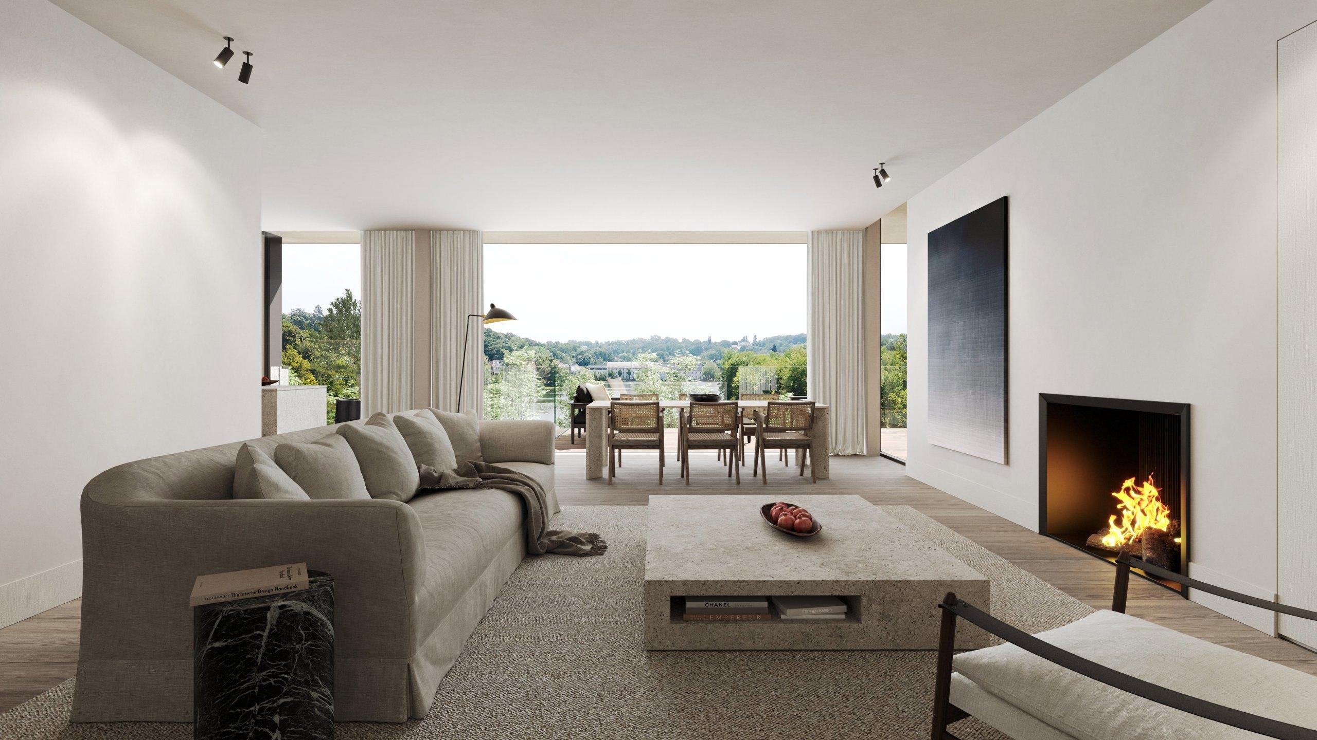 LA HULPE – Located in an EXCEPTIONAL SETTING on the edge of a Natura 2000 area with a breathtaking view of the Grand Etang de La Hulpe, stunning new STANDING APARTMENT (3bed/1bath/2shower) of 288 m² with a VAST 71 m² south-facing TERRACE. Located on the ground floor, the flat comprises an entrance hall with built-in cupboards, guest WC and access to the laundry room, a large, bright 87 m² living room with a gas fireplace opening onto the terrace, a super-equipped open-plan kitchen, a pantry, a night hall, a master suite comprising a 20.9 m² bedroom opening onto the terrace, a 21.9 m² dressing room and a bathroom (washbasin, bath, shower, separate WC), a 2nd and 3rd bedroom (22.5 and 14.6 m²) and their en suite shower room (washbasin, shower, WC). This contemporary luxury flat, designed by world-renowned architect Marc CORBIAU, offers expansive, light-filled living spaces with an exceptional level of finishes (alarm system, home automation and customisation options). It also boasts optimal energy performance (advanced insulation, GEOTHERMAL heat pump, solar panels, underfloor heating). EPB A. Cellar and parking box included in the price. Sale of the land subject to registration duties (12.5%) and the construction under VAT regime (21%). Discover this unique opportunity with L&P!