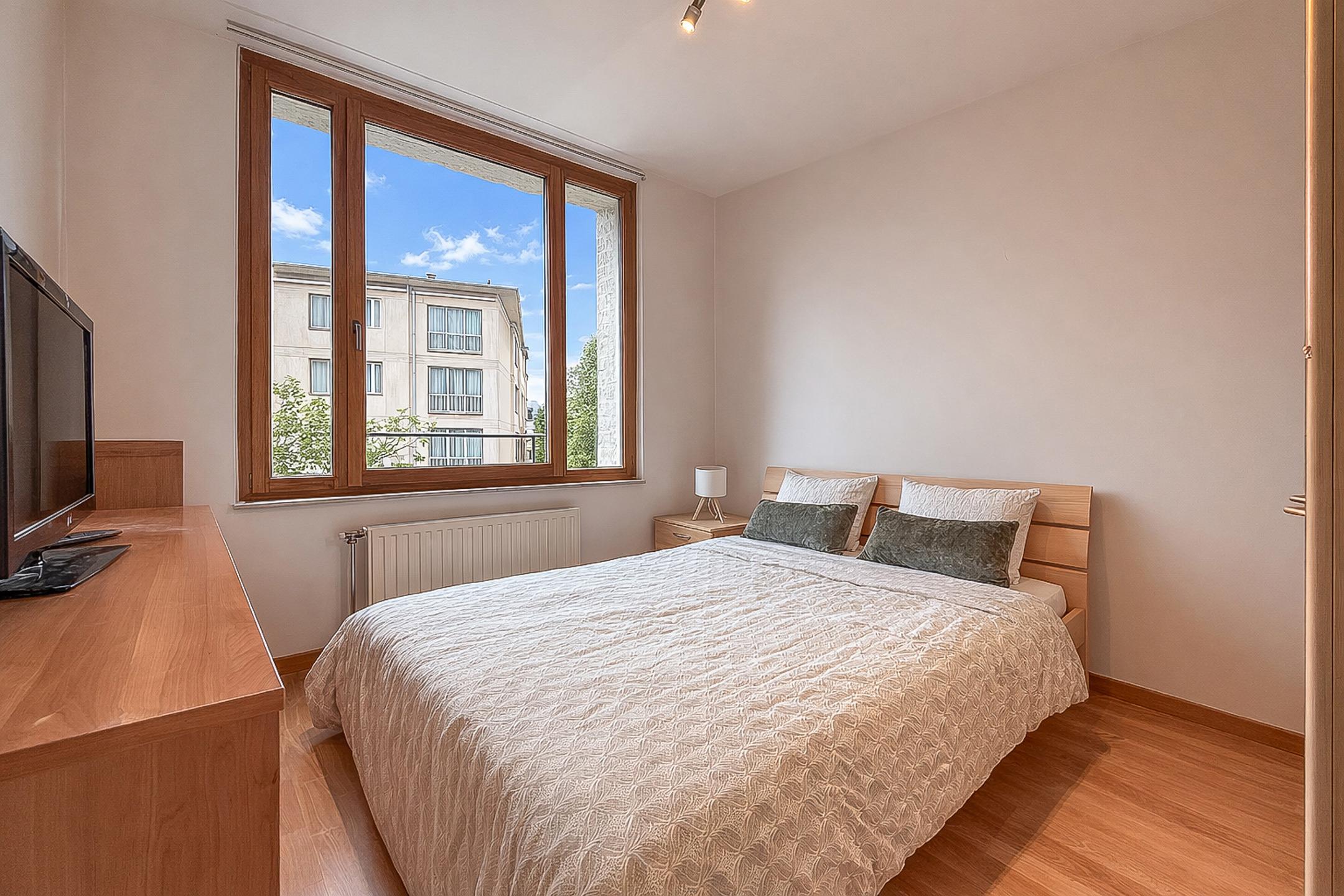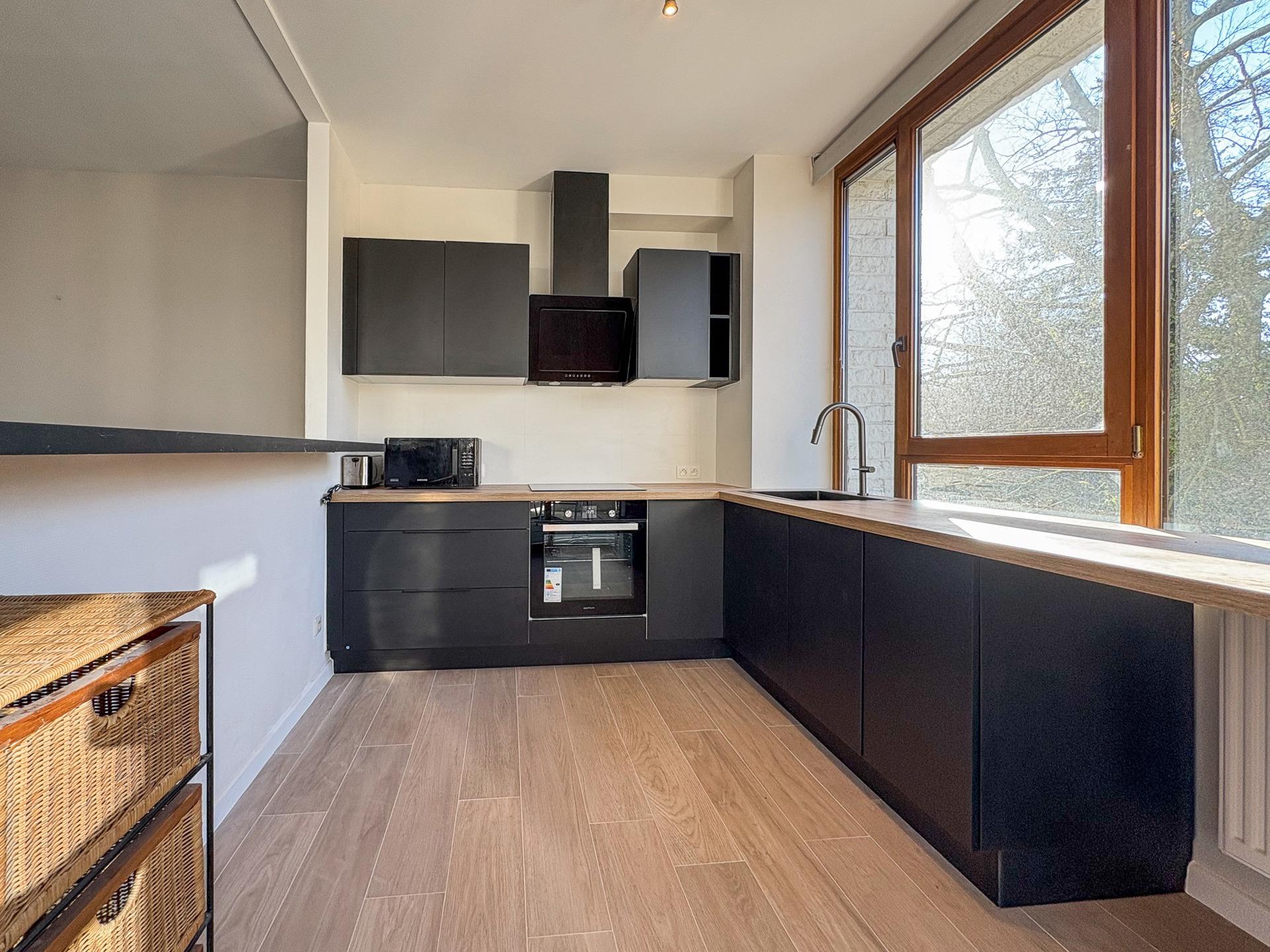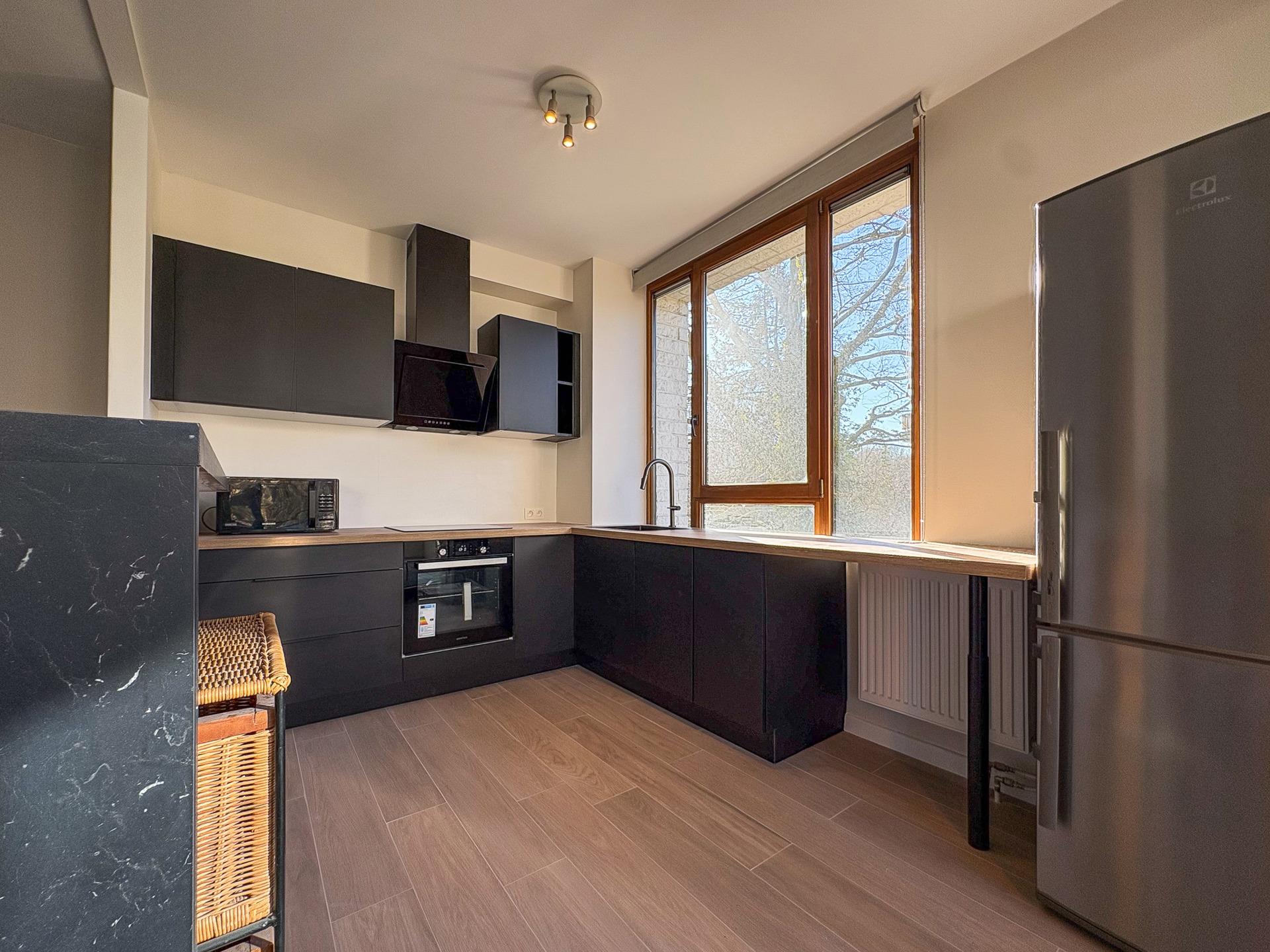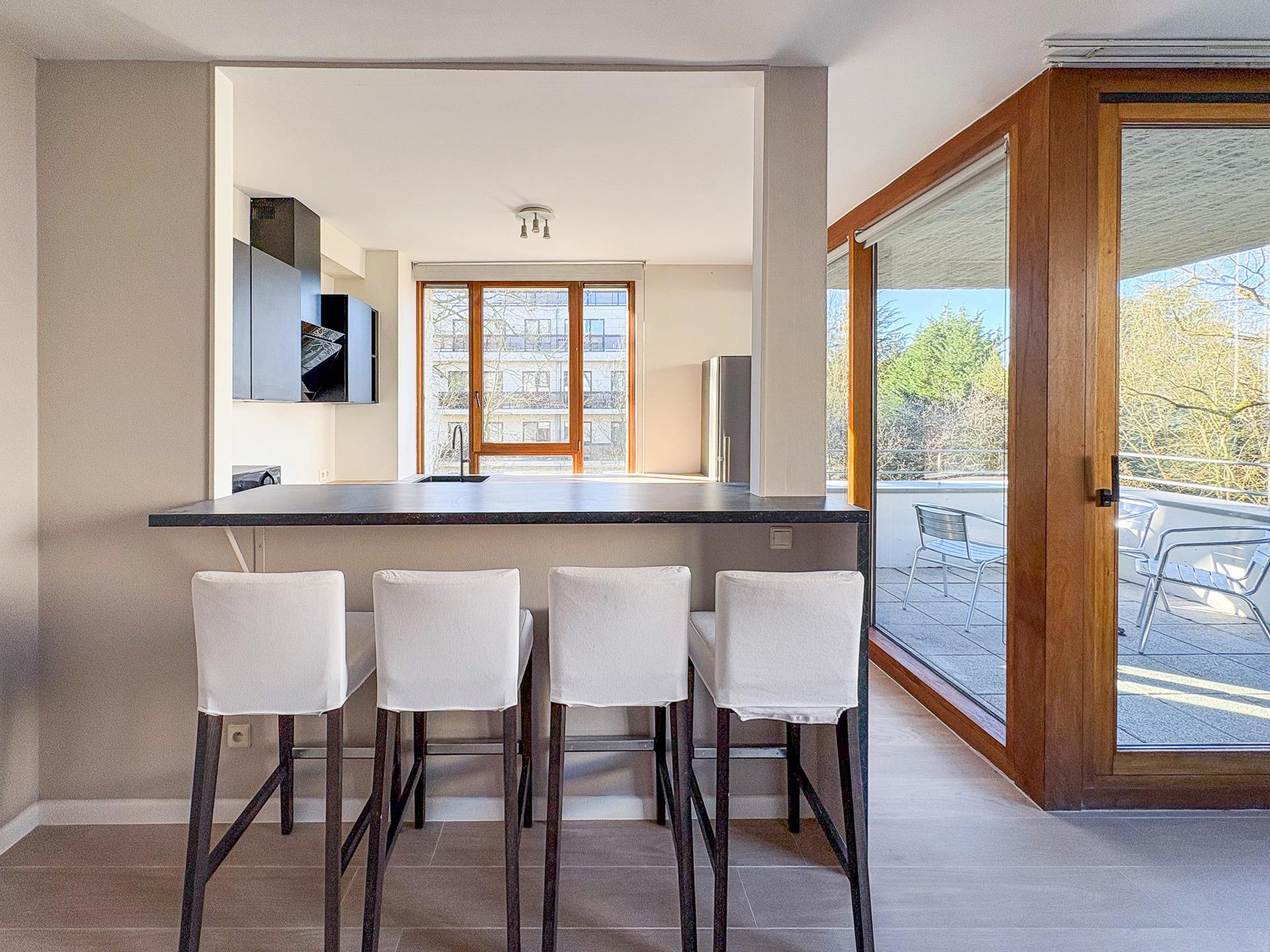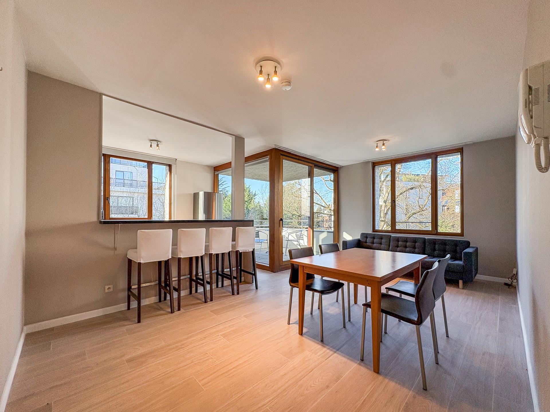 IXELLES – Hippodrome. On the edge of the Bois de la Cambre, the Forêt de Soignes and the Brussels Golf Club, bright furnished APARTMENT (2bed/1shower room), freshly renovated, with a terrace and parking. It is located on the 3rd floor and consists of an entrance hall with cloakroom and separate WC, pleasant living room of ±32 m², fully equipped open kitchen with access to the ±7 m² terrace, two bedrooms of ±14 m² and ±9 m², shower room, equipped laundry room and numerous storage spaces. A parking space completes this property. Provision for charges: +160 €/month (common areas & cold water). EPB: D+. To discover exclusively at L&P.