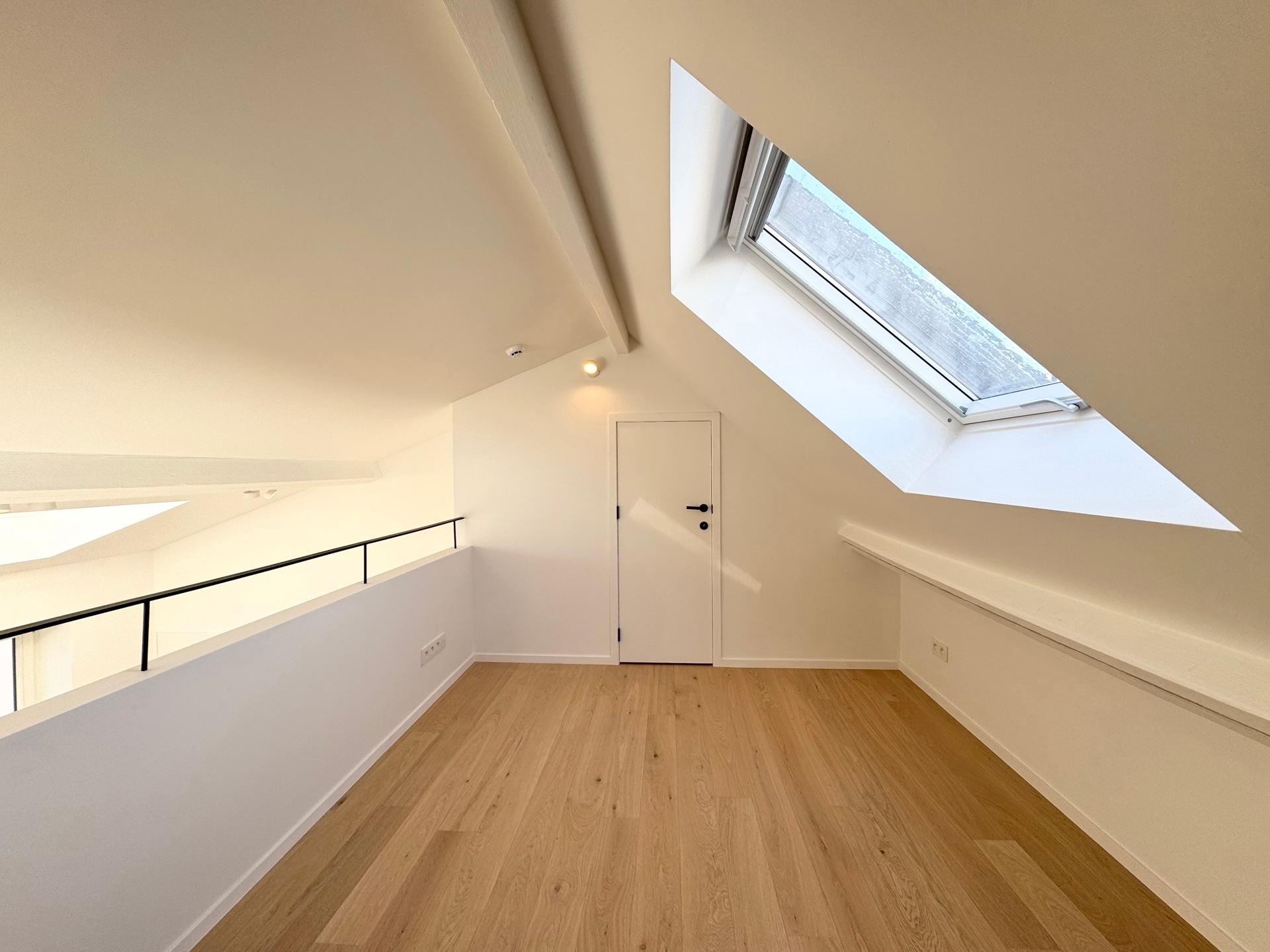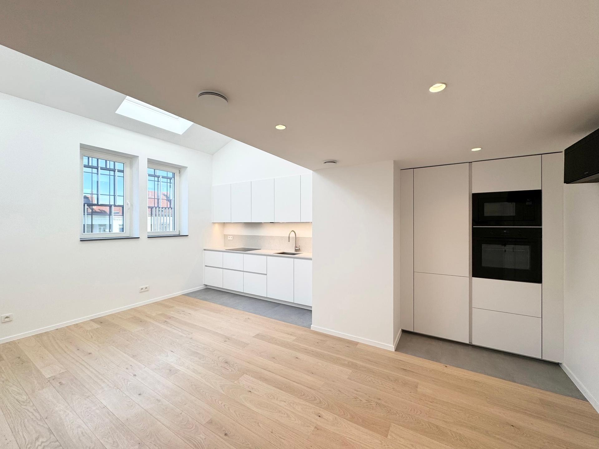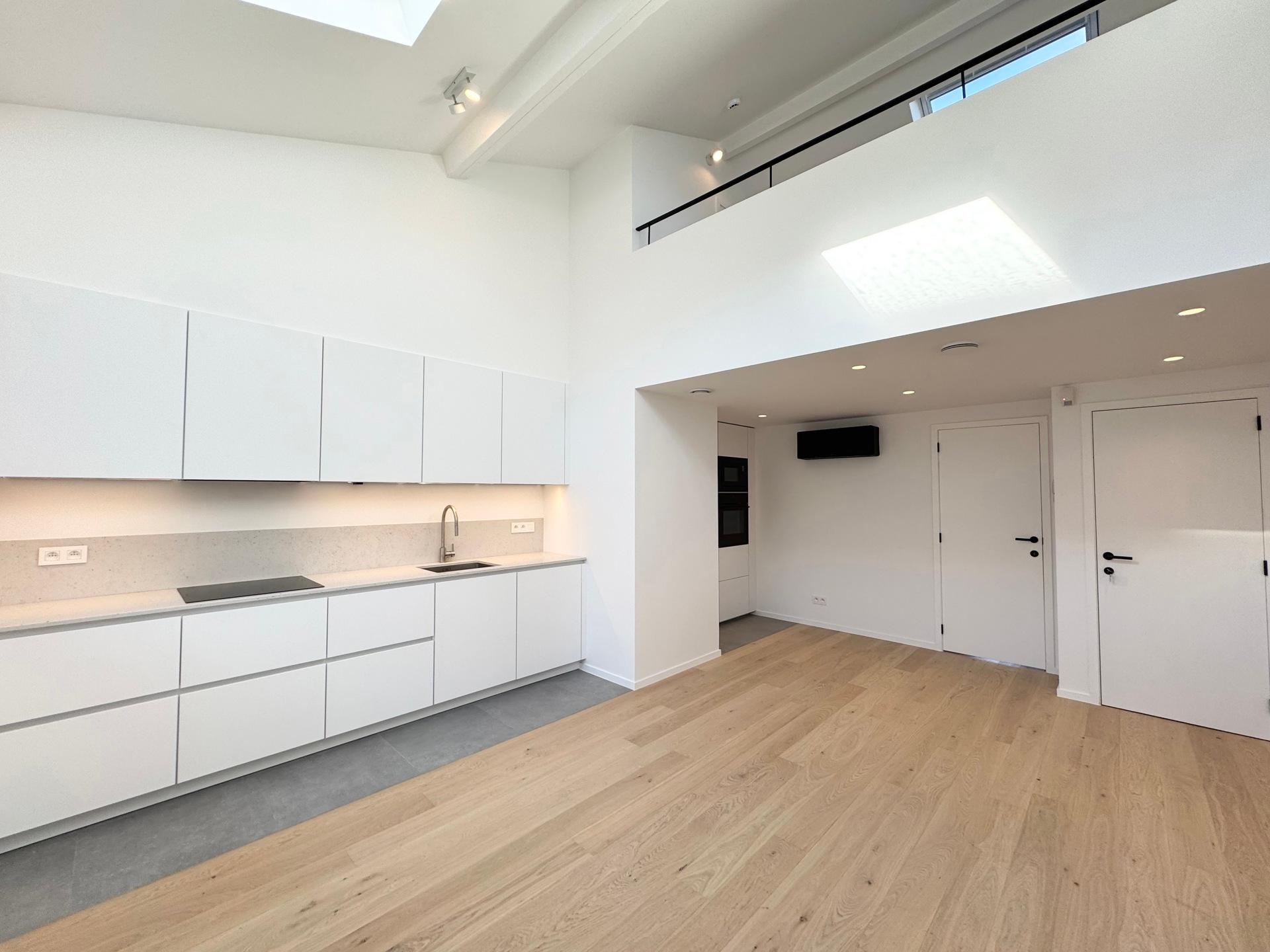 ETTERBEEK – Close to the European Institutions and the Chasse district. Superb DUPLEX APARTMENT, fully and tastefully renovated of ±60m² (1BR/1SH) with terrace – first occupancy. Located on the 2nd floor of a mansion house, it comprises a bright living area of 30m² with an open, fully equipped kitchen and built-in cupboards, a mezzanine of ±10 m² with storage space. One bedroom of ±15 m² with an open shower room and a separate toilet. South-facing terrace of ±8m² adjoining the bedroom. Air conditioning. Heat pump, double-flow ventilation system, alarm system, bicycle storage and a cellar complete this property. EPC: B-. Flat-rate charges: +50€/month (common charges + alarm). To be discovered at L&P!