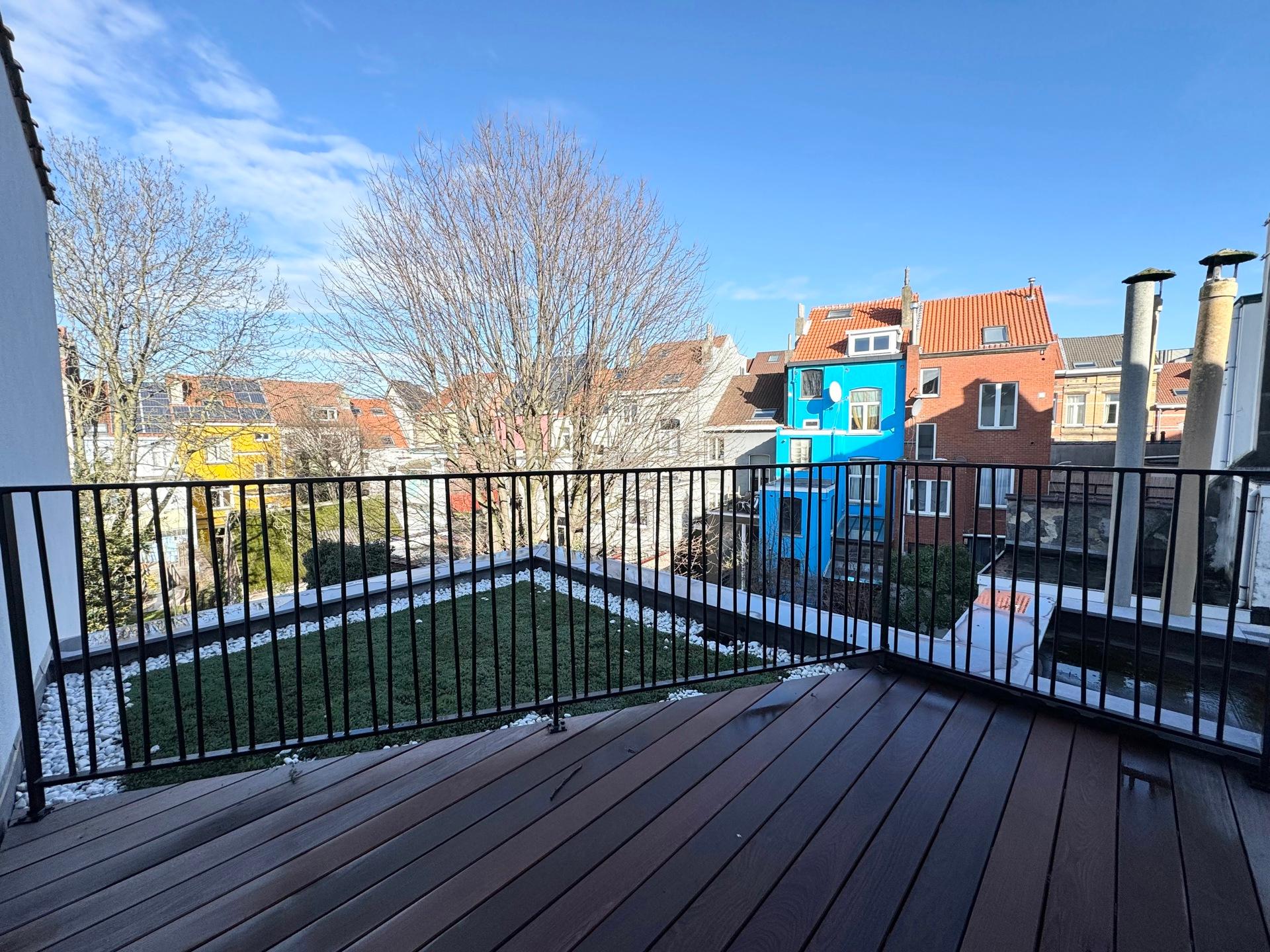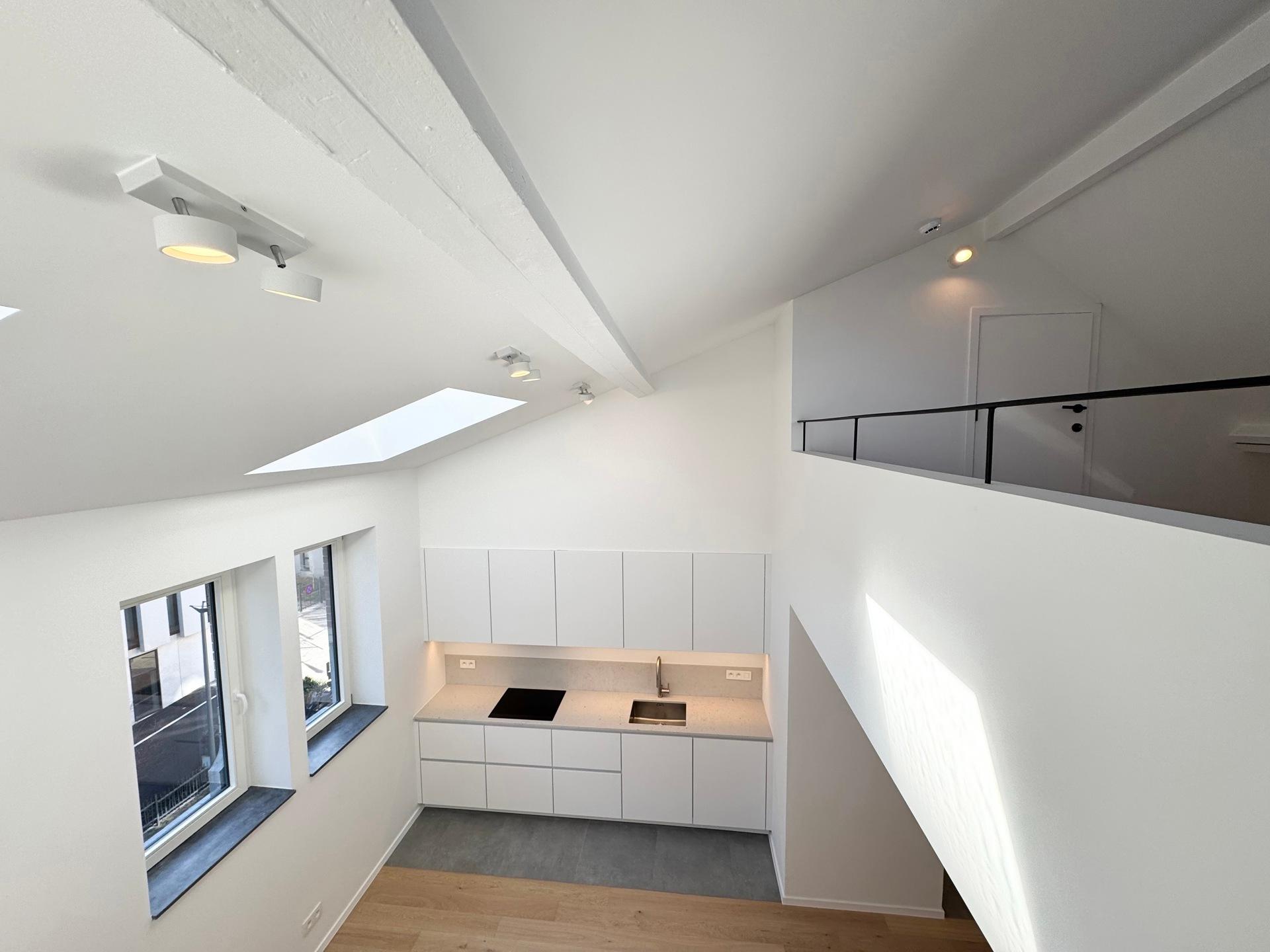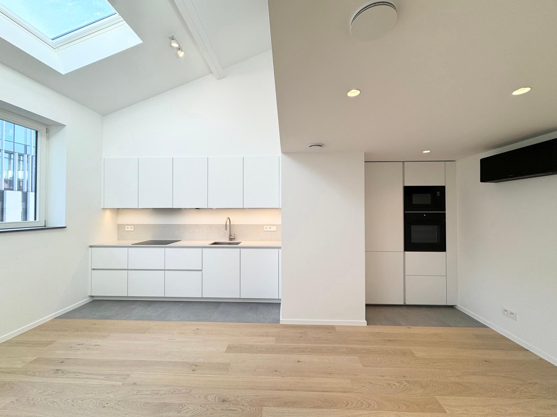 ETTERBEEK – Close to the European Institutions and the Chasse district. Superb DUPLEX APARTMENT, fully and tastefully renovated of ±60m² (1BR/1SH) with terrace – first occupancy. Located on the 2nd floor of a mansion house, it comprises a bright living area of 30m² with an open, fully equipped kitchen and built-in cupboards, a mezzanine of ±10 m² with storage space. One bedroom of ±15 m² with an open shower room and a separate toilet. South-facing terrace of ±8m² adjoining the bedroom. Air conditioning. Heat pump, double-flow ventilation system, alarm system, bicycle storage and a cellar complete this property. EPC: B-. Flat-rate charges: +50€/month (common charges + alarm). To be discovered at L&P!