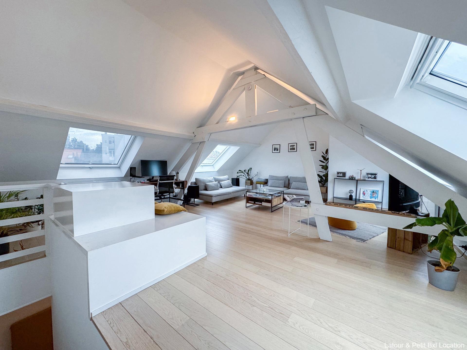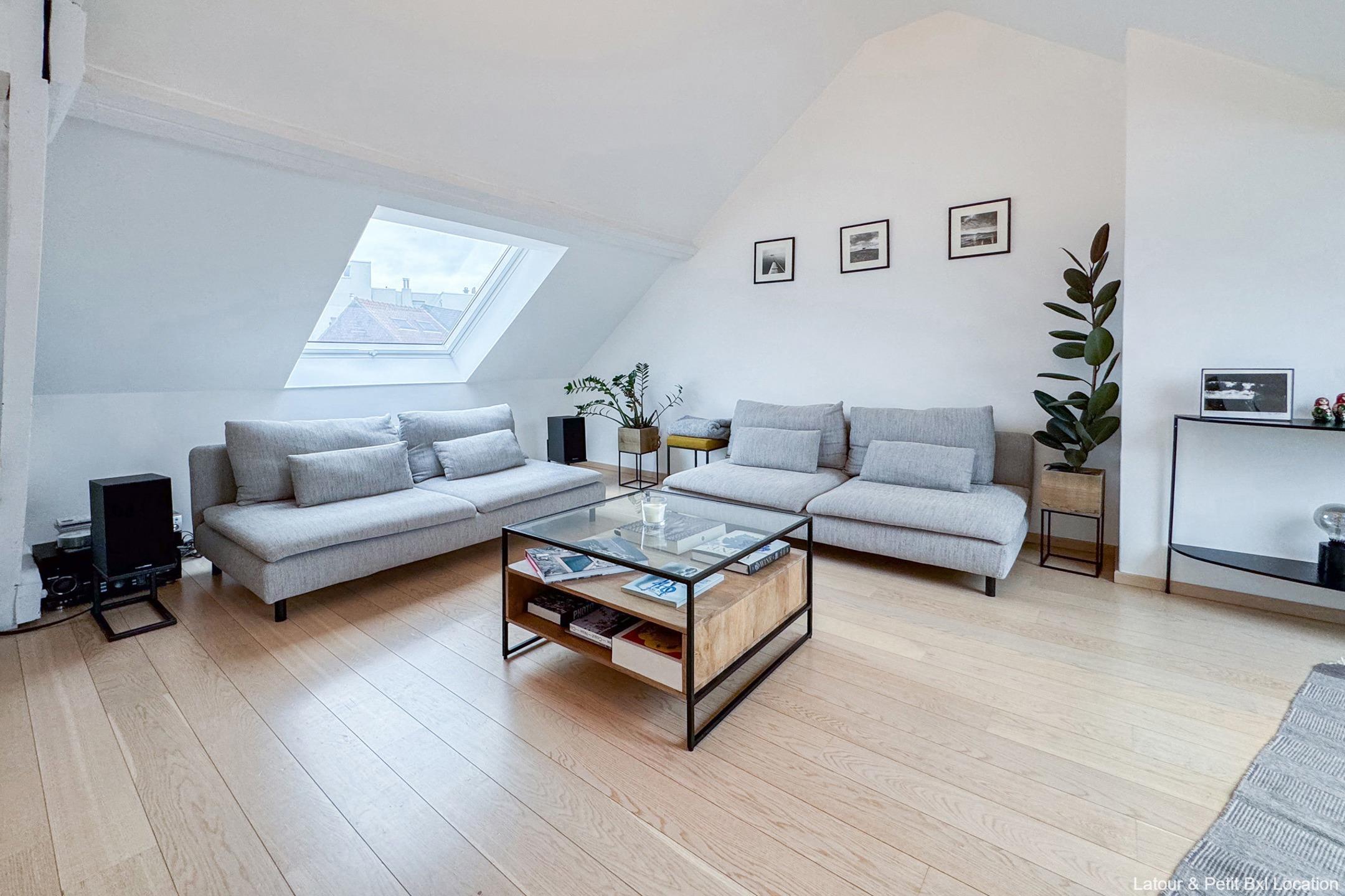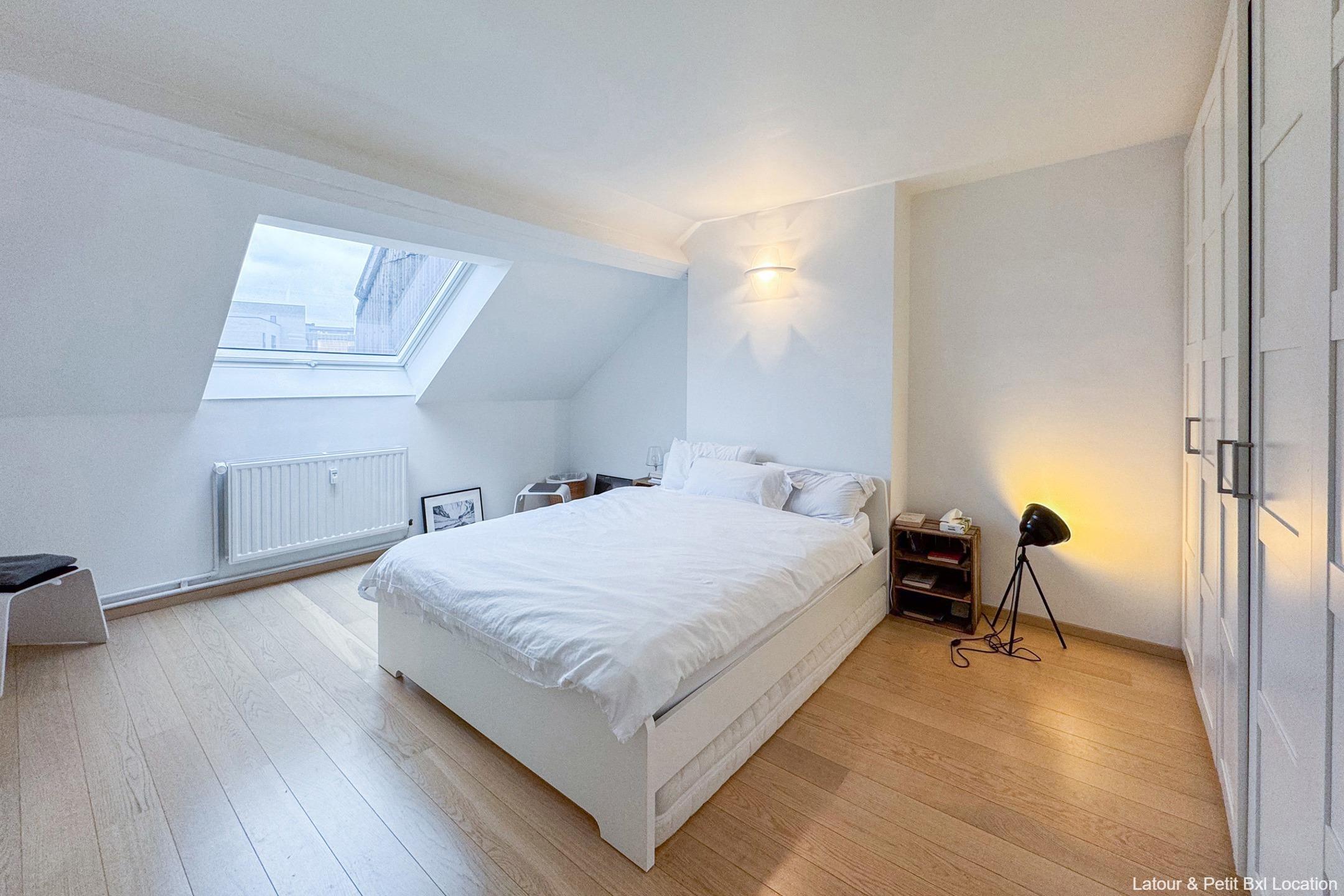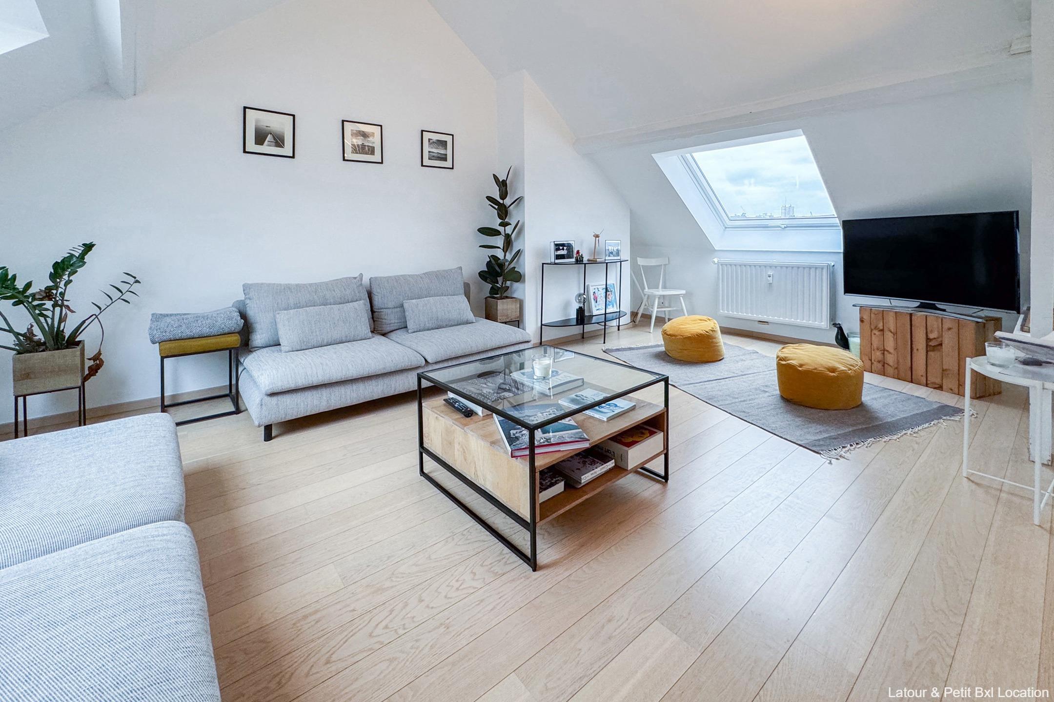 IXELLES - Ideally located between Place du Châtelain and Parc Tenbosch, magnificent duplex APARTMENT (2bed/1bath/1sdd) in a building with elevator. It comprises an entrance hall, separate toilet, dining room ±12sqm, open-plan fitted kitchen ±12sqm, master bedroom ±20sqm with wardrobe, bedroom ±16sqm, bathroom, shower room with washing machine available, upstairs, beautiful living space ±45sqm. Cellar. Parking space. Bike storage room. Service charges: 300€ (common, heating, water). Discover it at L&P!
