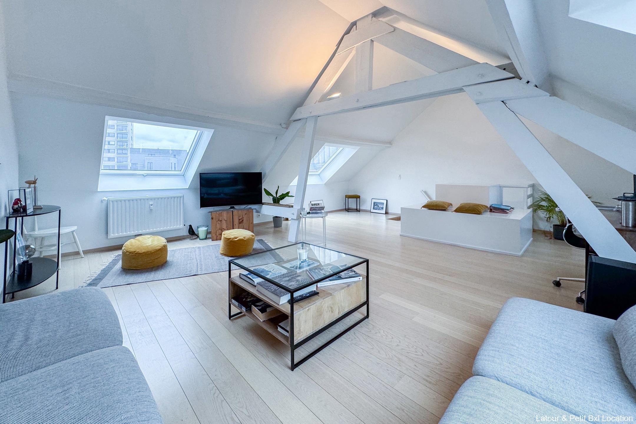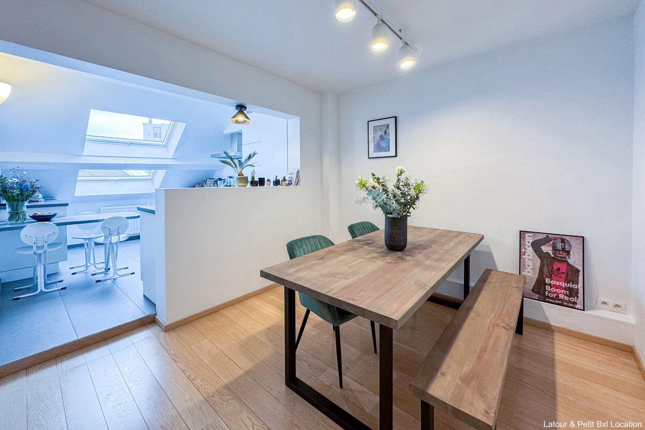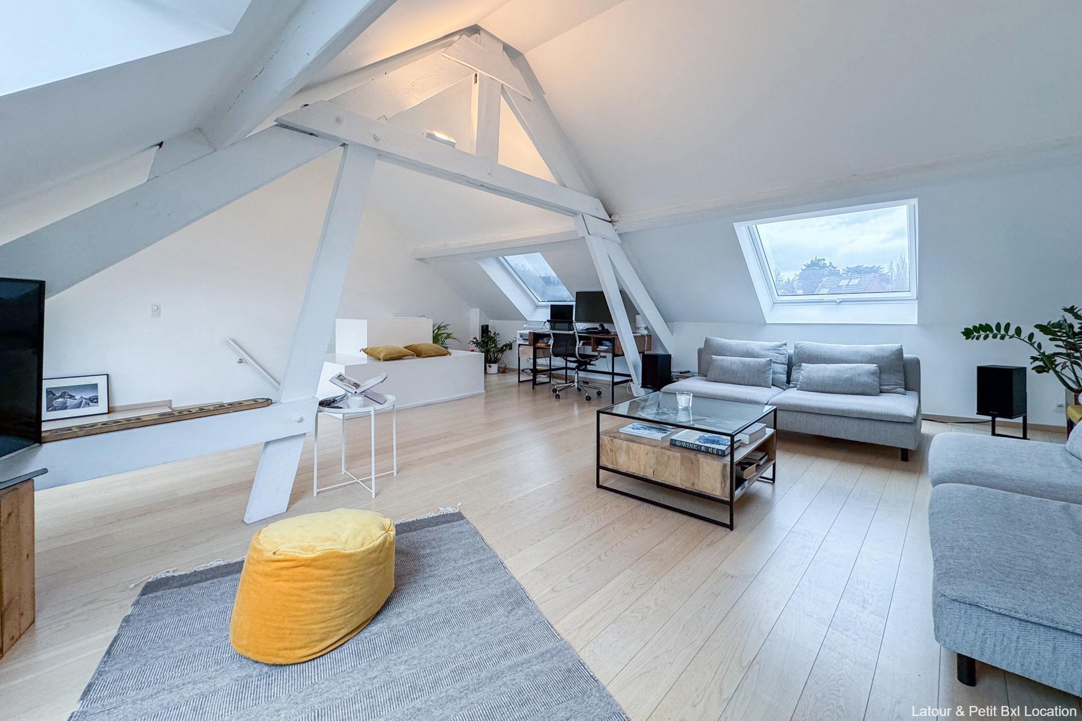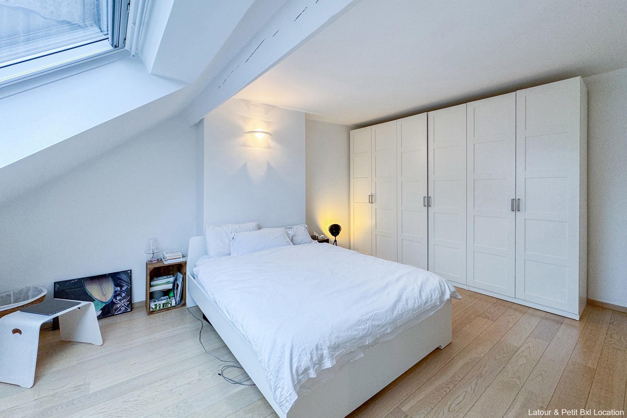 IXELLES - Ideally located between Place du Châtelain and Parc Tenbosch, magnificent duplex APARTMENT (2bed/1bath/1sdd) in a building with elevator. It comprises an entrance hall, separate toilet, dining room ±12sqm, open-plan fitted kitchen ±12sqm, master bedroom ±20sqm with wardrobe, bedroom ±16sqm, bathroom, shower room with washing machine available, upstairs, beautiful living space ±45sqm. Cellar. Parking space. Bike storage room. Service charges: 300€ (common, heating, water). Discover it at L&P!