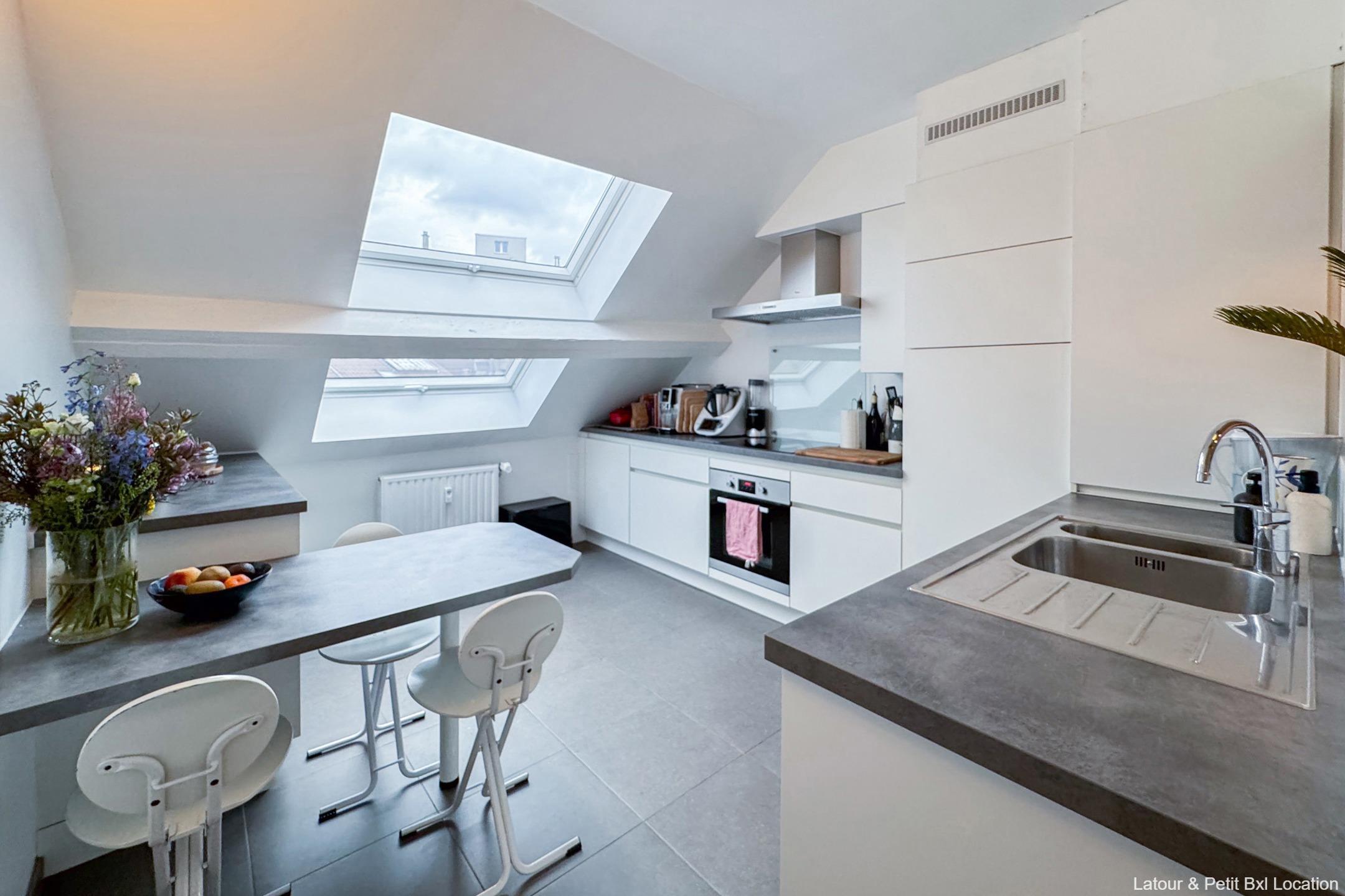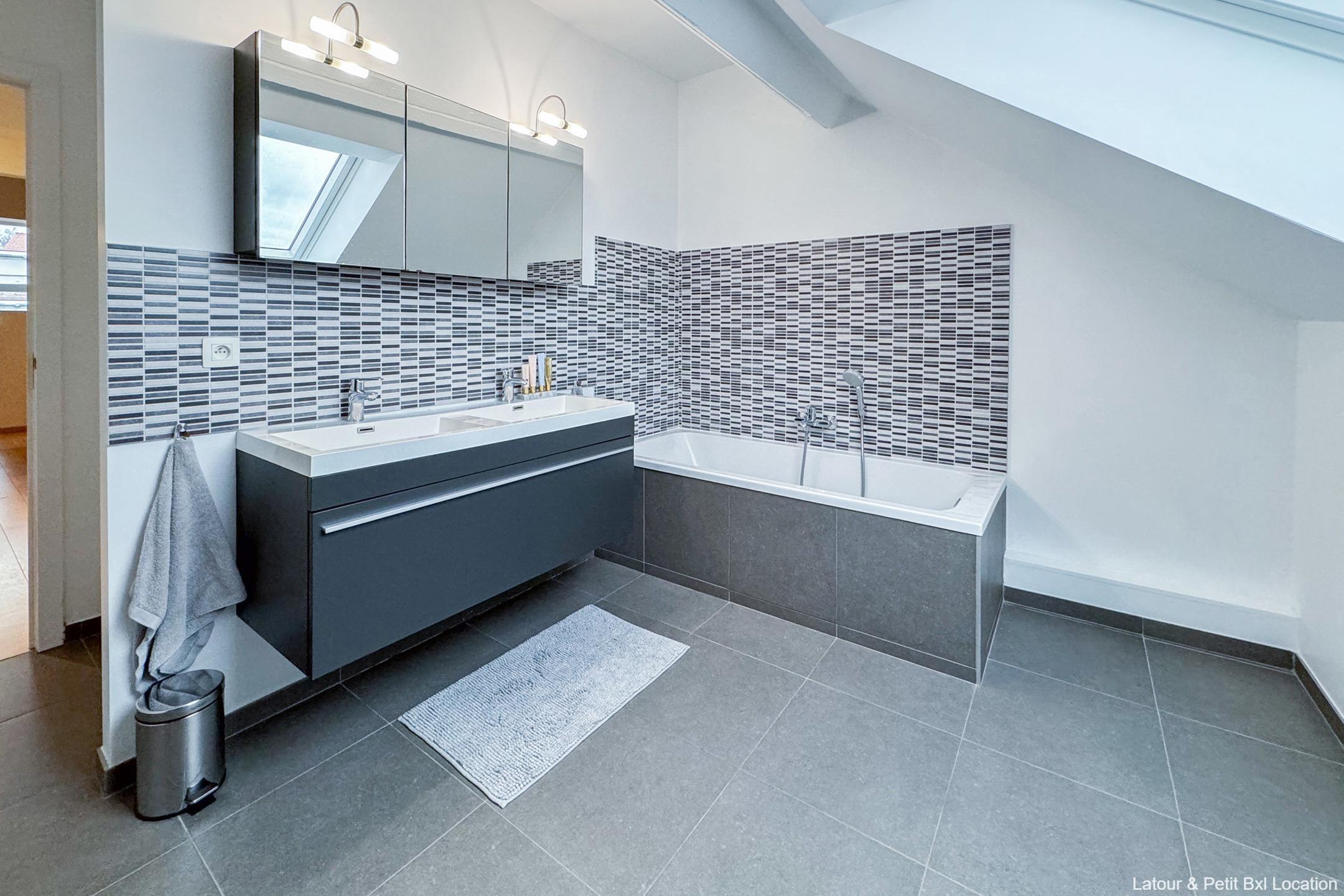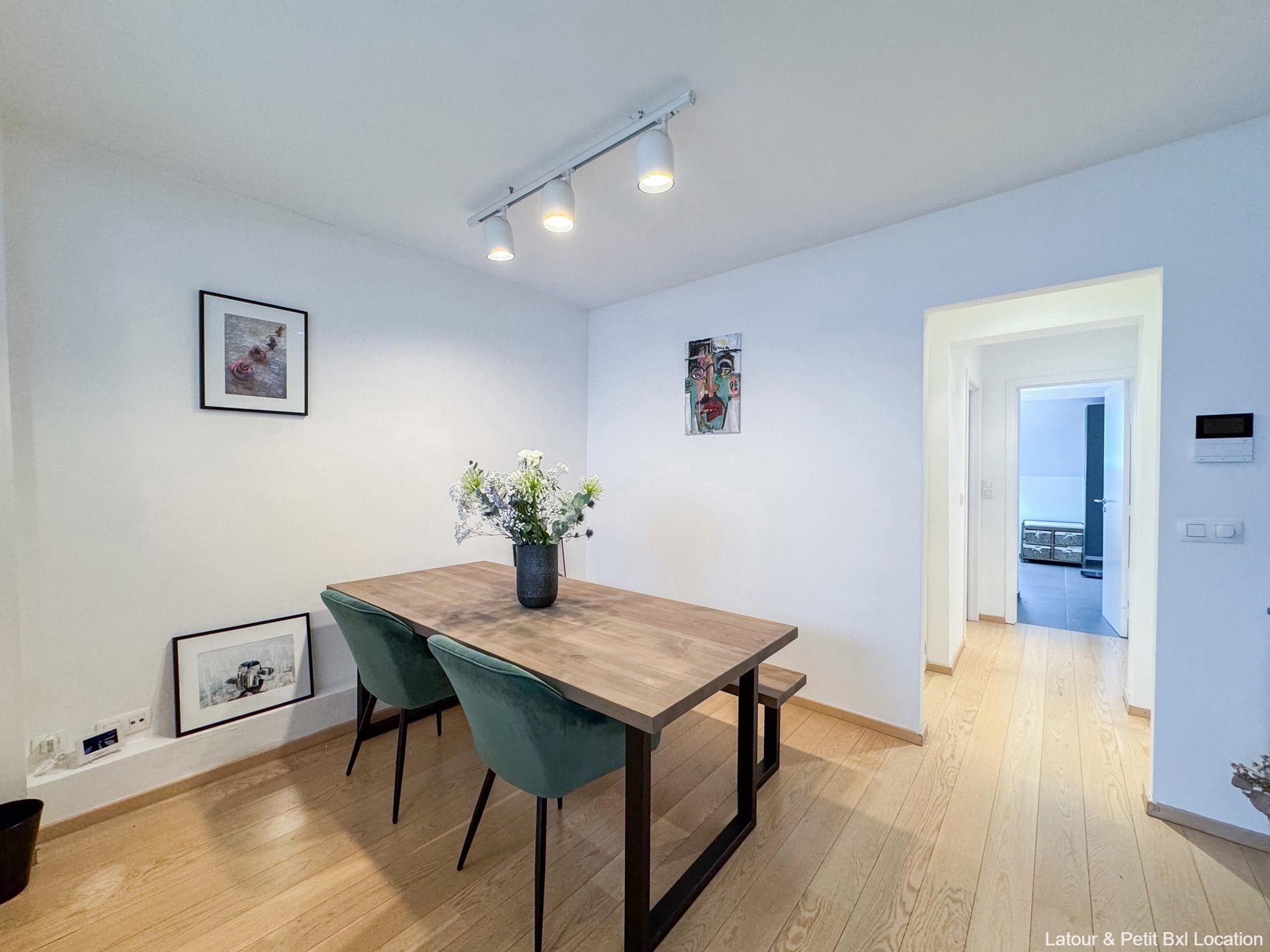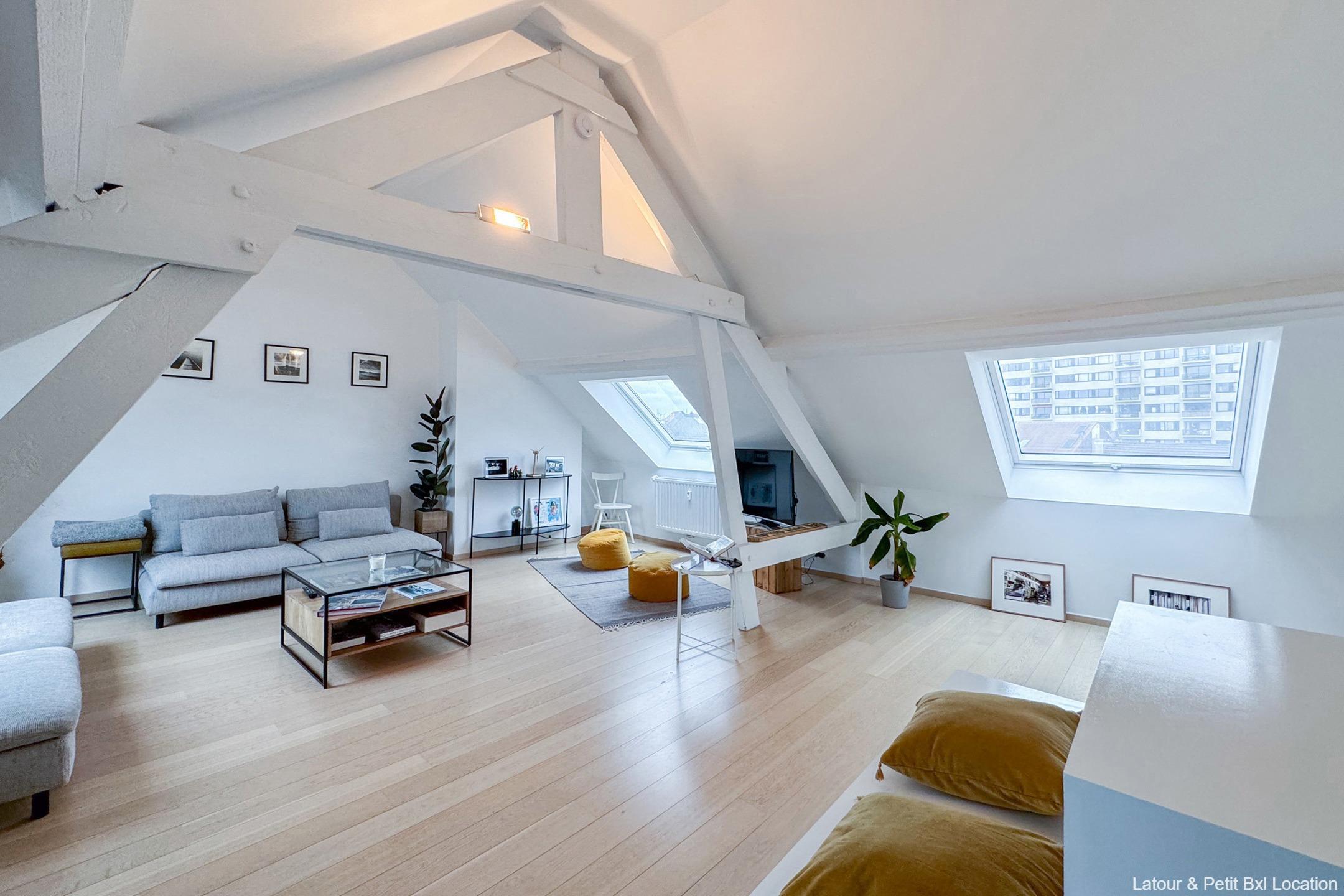 IXELLES - Ideally located between Place du Châtelain and Parc Tenbosch, magnificent duplex APARTMENT (2bed/1bath/1sdd) in a building with elevator. It comprises an entrance hall, separate toilet, dining room ±12sqm, open-plan fitted kitchen ±12sqm, master bedroom ±20sqm with wardrobe, bedroom ±16sqm, bathroom, shower room with washing machine available, upstairs, beautiful living space ±45sqm. Cellar. Parking space. Bike storage room. Service charges: 300€ (common, heating, water). Discover it at L&P!
