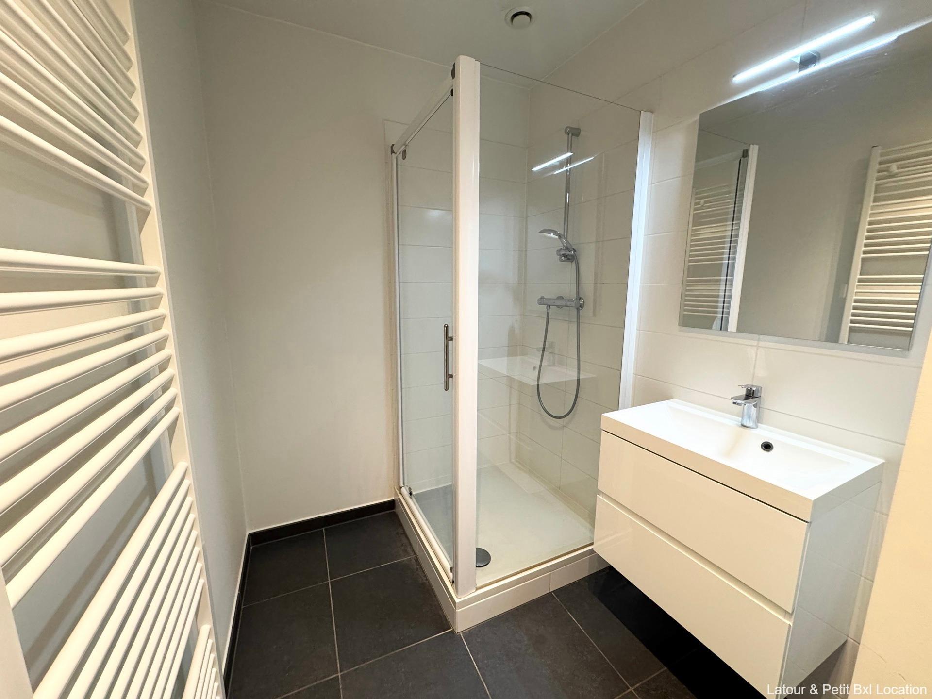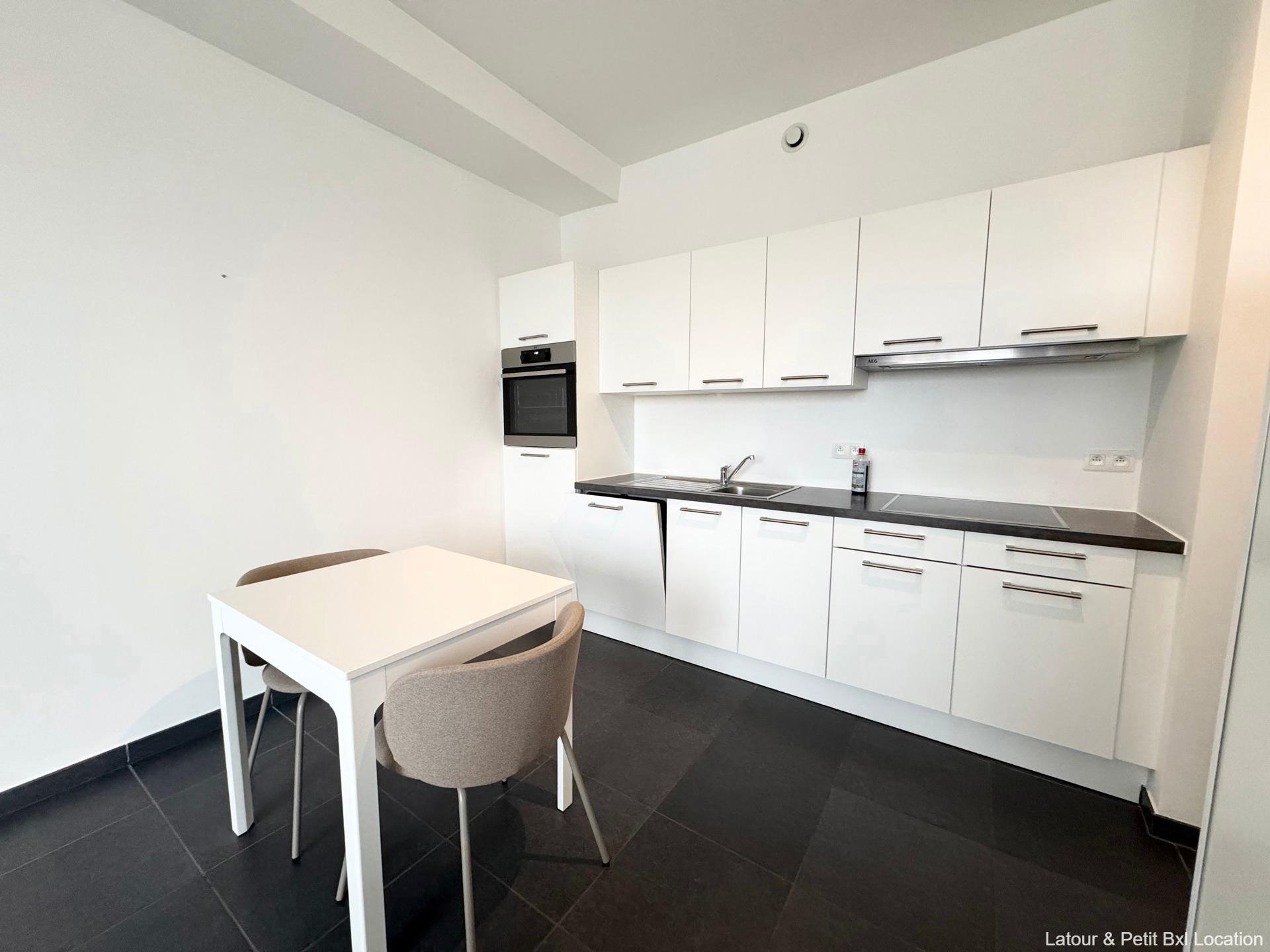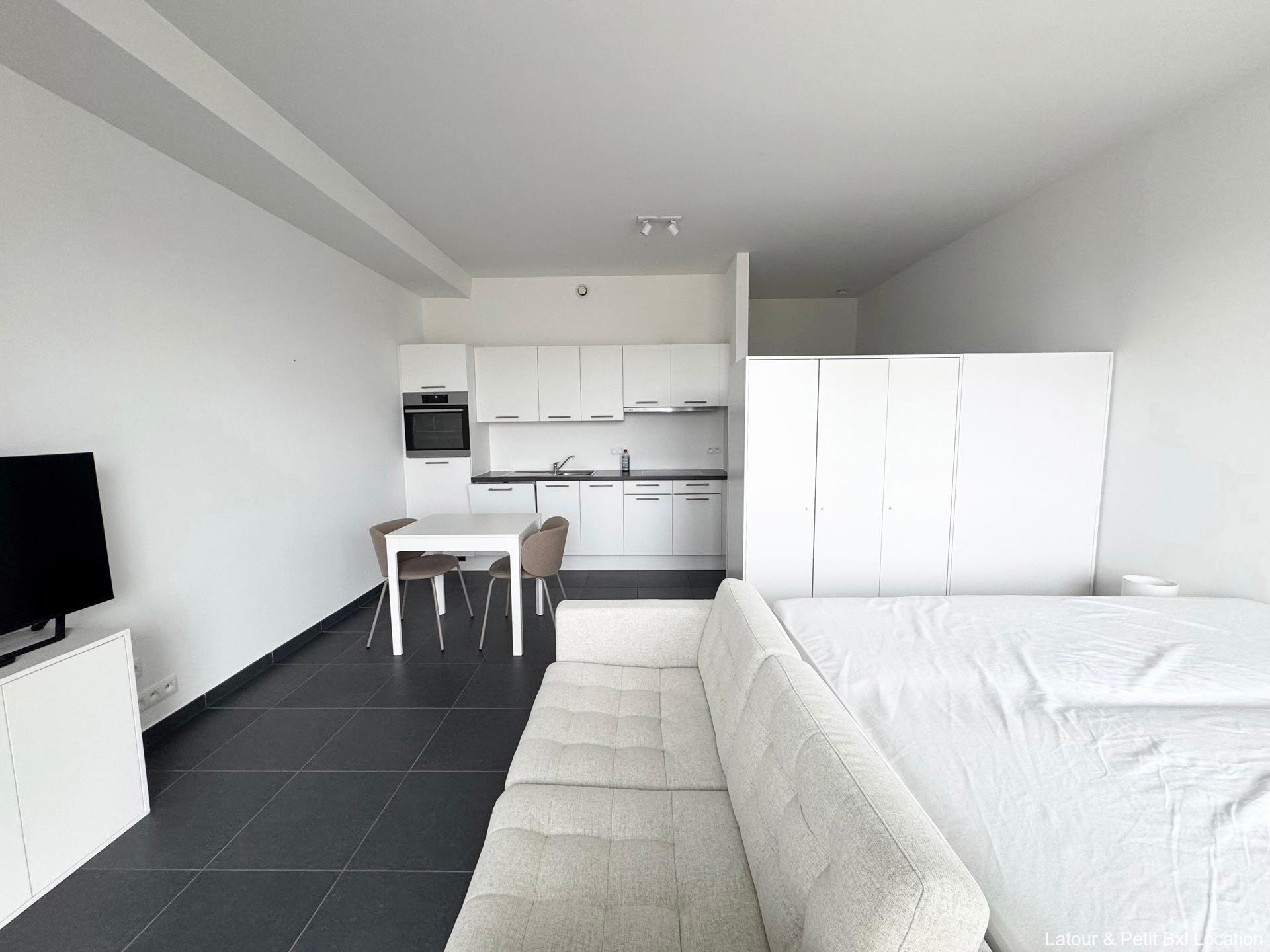 EVERE, in immediate proximity to NATO, the ring road, and local shops, beautiful FURNISHED STUDIO (0Br/1Shower) in excellent condition, measuring 43m², fully equipped, with a large terrace offering a great view. Located on the 2nd floor, it consists of an entrance hall, a bright living area of 32m² with access to a large 9m² terrace running the entire length of the apartment, a fully equipped open kitchen, a shower room, and a separate toilet. Two large communal terraces with an unobstructed view of all of Brussels on the 13th floor. Dual-flow ventilation system. Cellar. Concierge service. Bicycle storage. Charges: €100/month provision (common areas, heating, concierge). EPC B (74). Exclusively available at L&P!