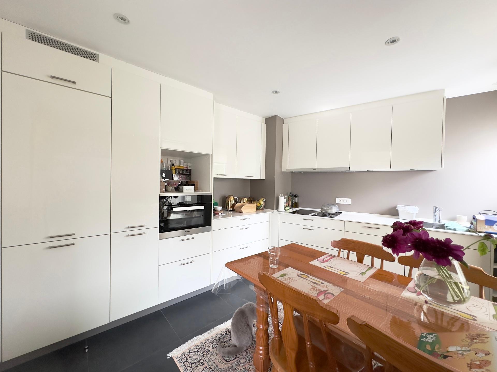 WOLUWE-SAINT-PIERRE, at Place Dumon (metro Stockel). Magnificent 172m² APARTMENT (3bed/2bath) with 2 parkings and terrace! Located on the 1st floor, it comprises an entrance hall with checkroom and separate toilet, spacious 45m² living room with parquet flooring and access to the terrace, super-equipped kitchen with breakfast nook, 3 bedrooms with parquet flooring, 2 with fitted wardrobes, dressing room, 2 shower rooms with toilet. Utility room. Cellar n°2. Two parking spaces n°10 and 11. Armored door. The apartment is equipped with light fittings and blinds. Charges of 200€/month (utilities, cold water). PEB : B-. Discover it at L&P!