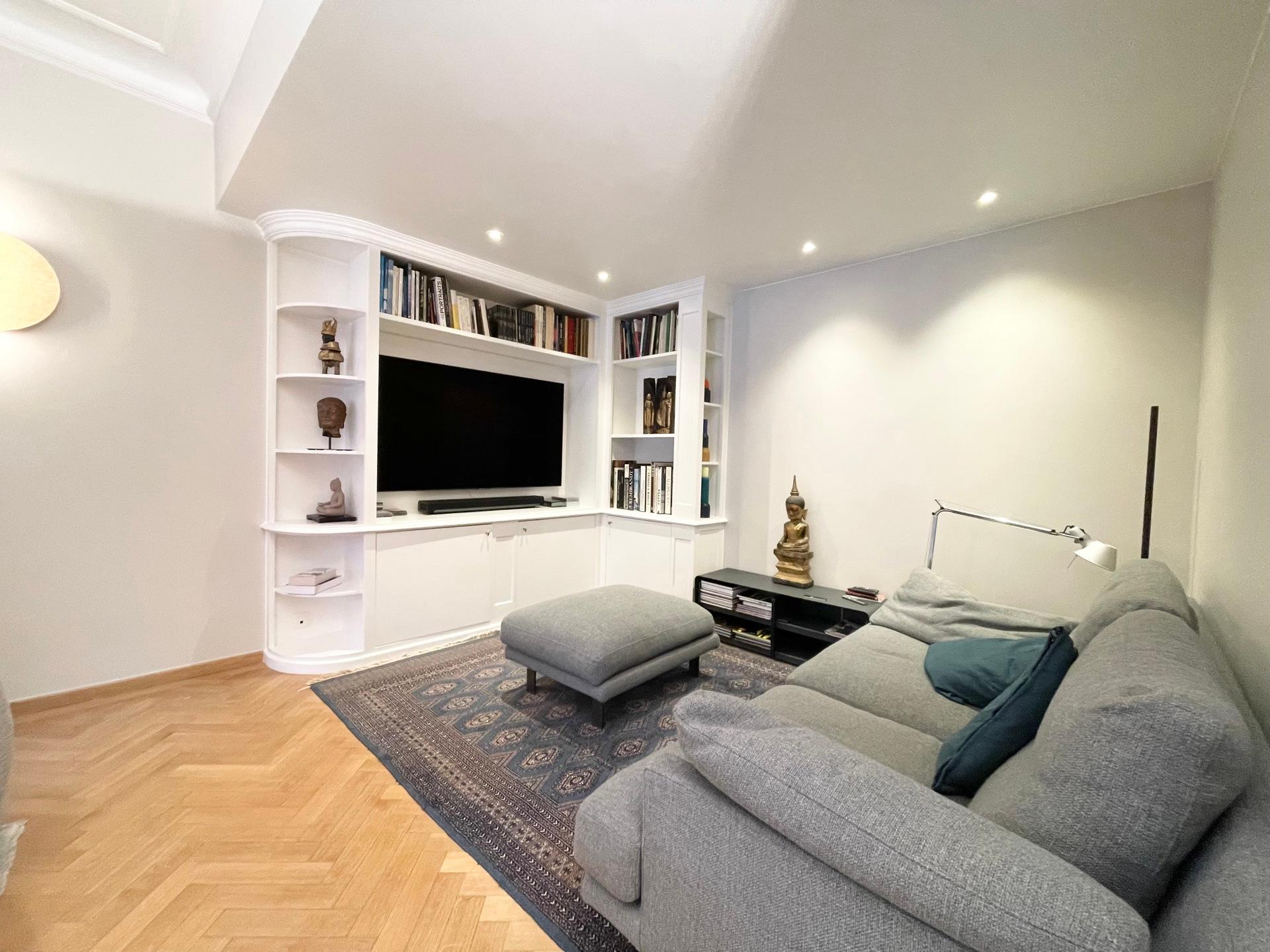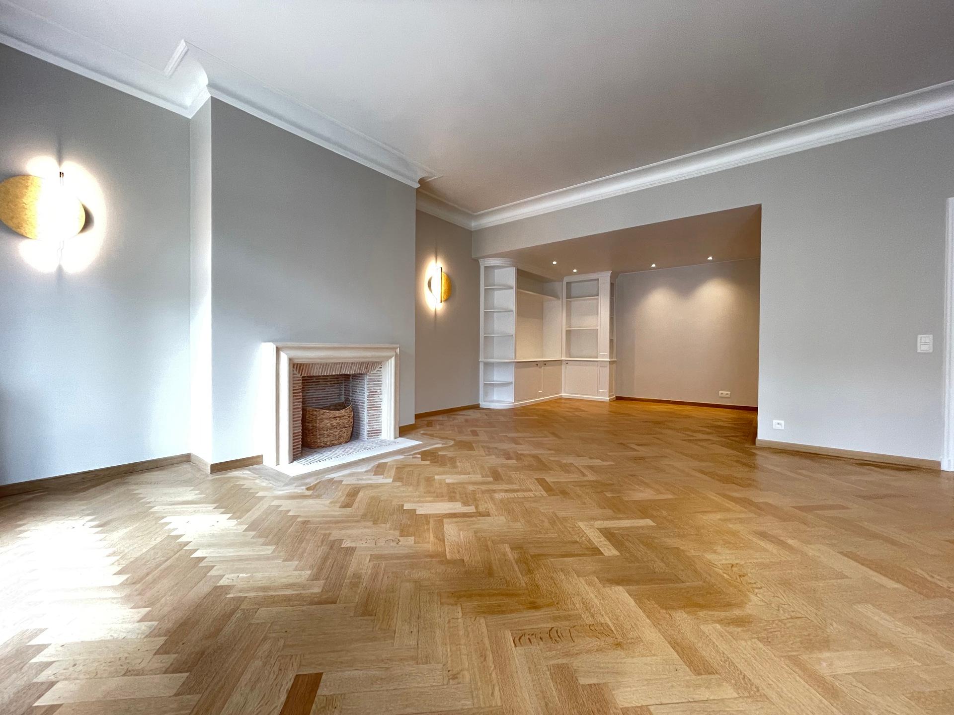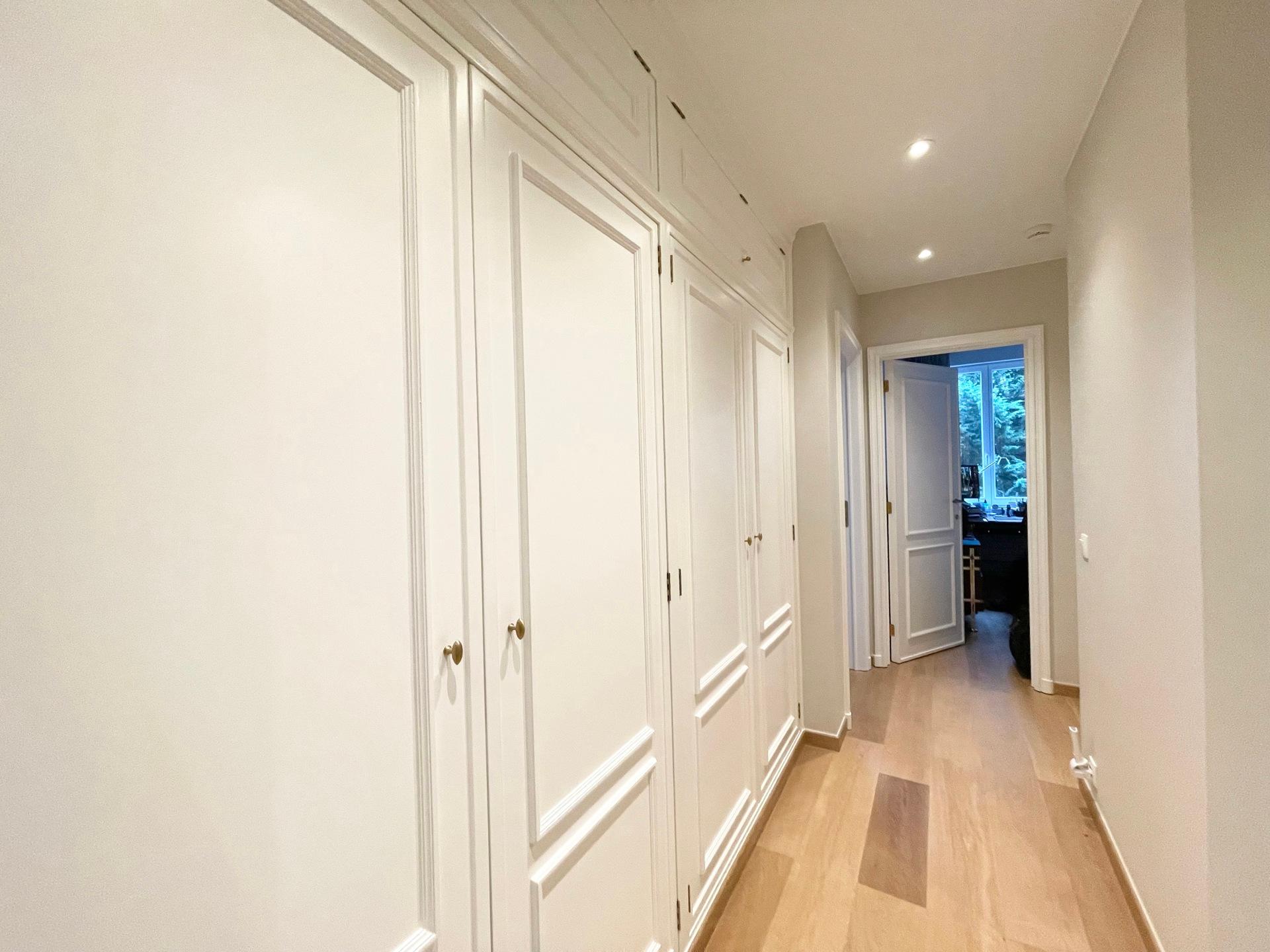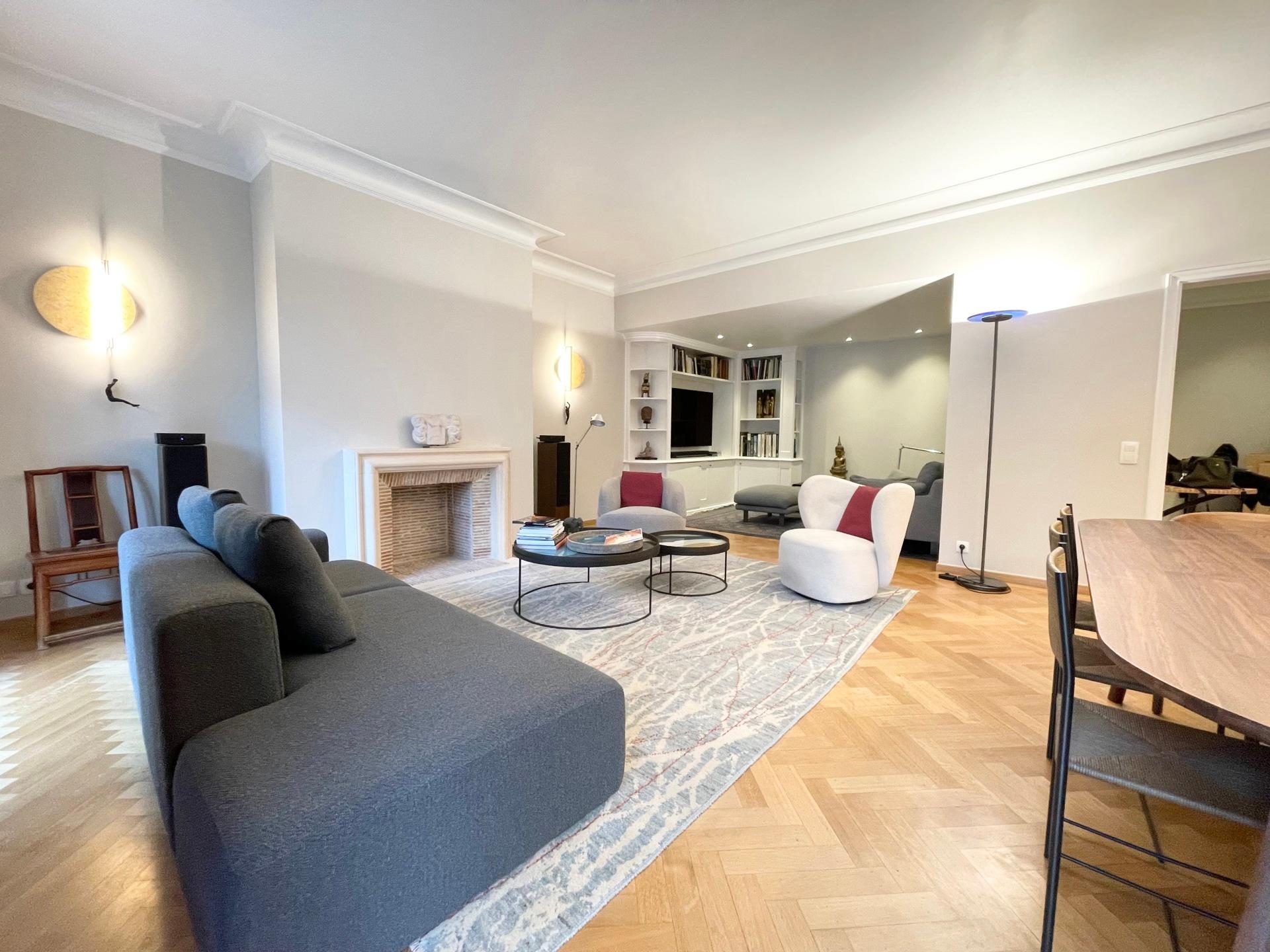 AUDERGHEM Superb apartment in a small building (2 bedrooms/1 bathroom/2 shower rooms) with terrace and garages. Located on the 1st floor, it comprises an entrance hall with cloakroom and toilet. Spacious 43m² living room with a TV area, giving access to the 16m² terrace. Fully equipped kitchen with access to a small terrace with storage room. 14m² study. 1 bedroom with cupboards and en-suite bathroom + toilet and washing machine/dryer. 1 bedroom with cupboards and en-suite shower room. Cellar with shelves. 1 closed garage + 1 parking space (+€150). Provisions for common charges, heating, hot and cold water €350/m². PEB C. Come and see it at L&P!