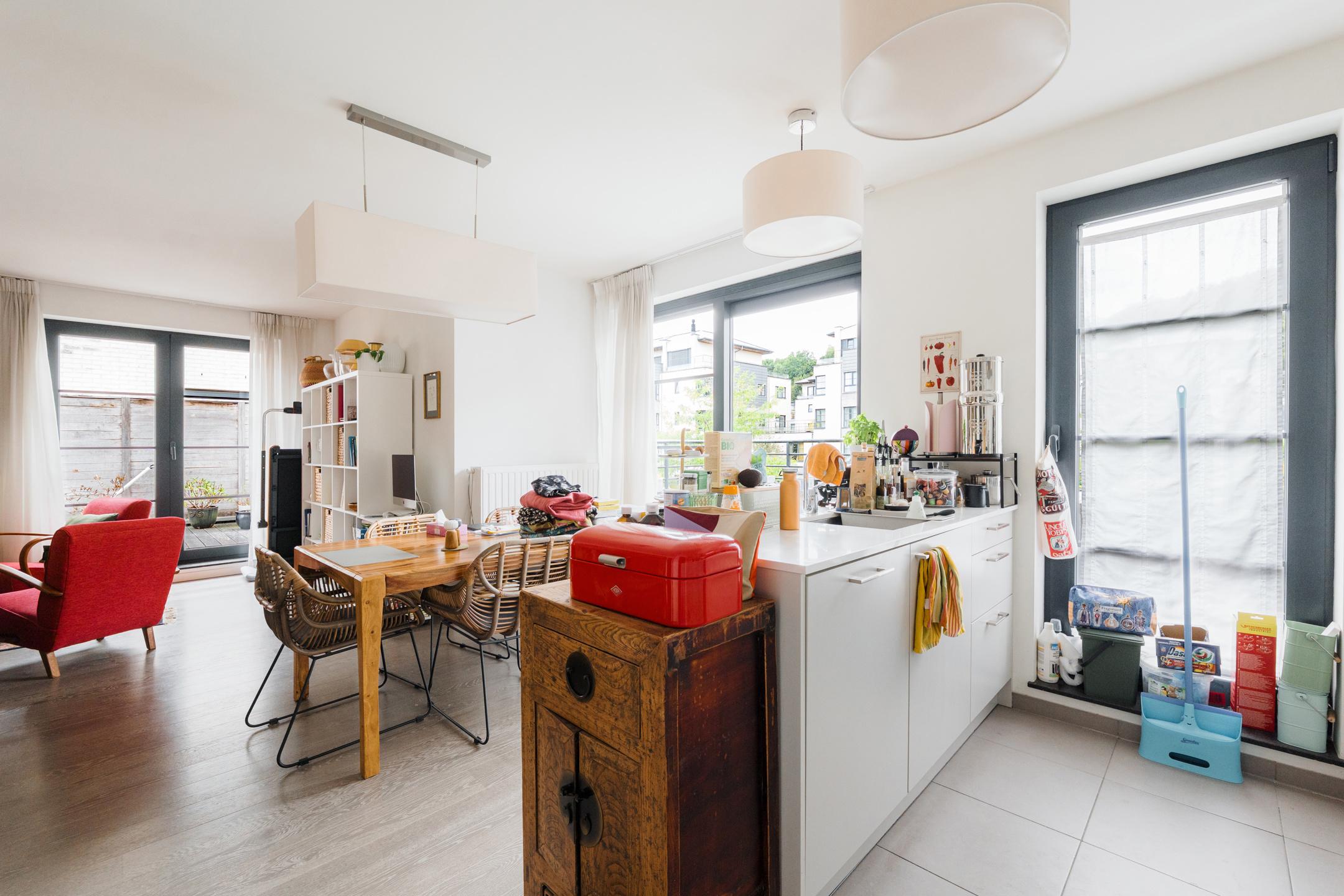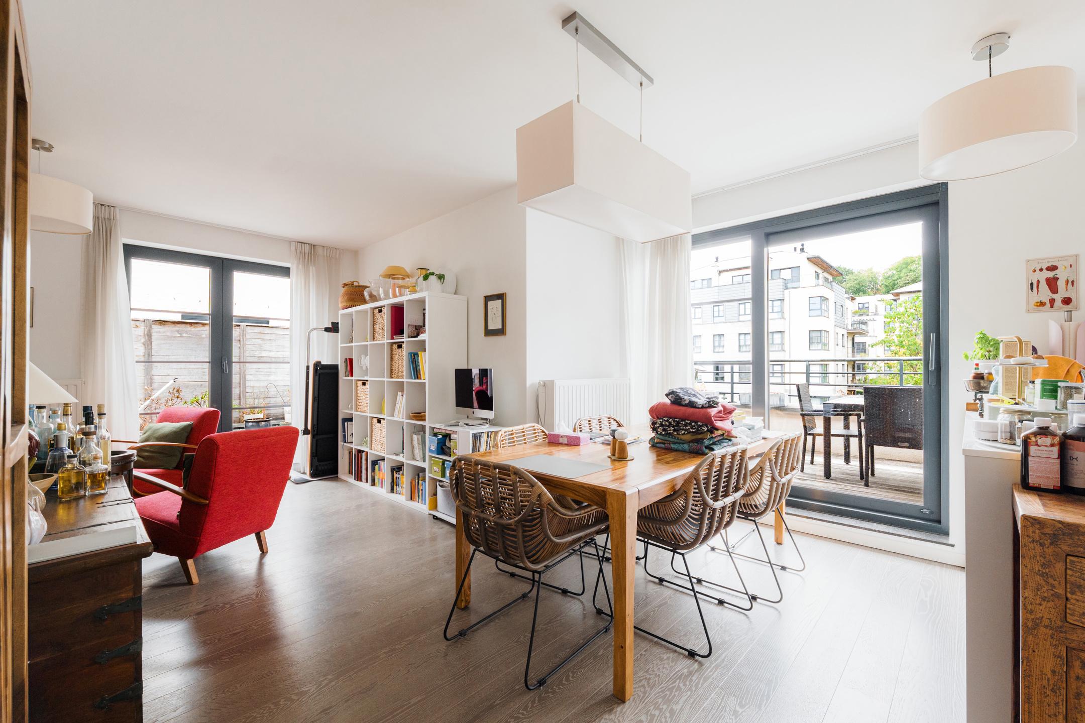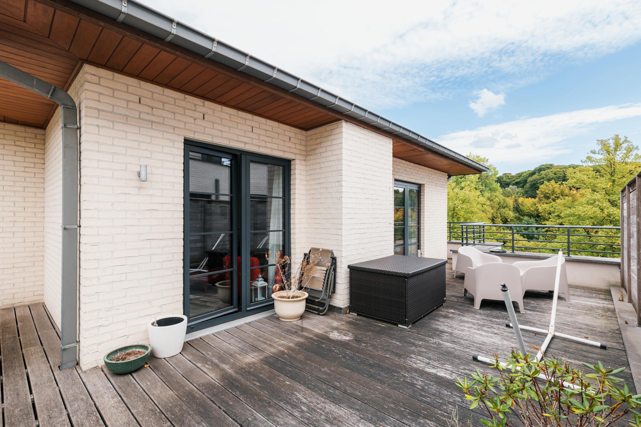 Close to the Mellaert Ponds and all amenities, in a luxury residence built in 2013, magnificent 2-bedroom/1-bathroom penthouse of ± 99 m² with 1 large terrace of 46 m². It is composed as follows: entrance hall with guest toilet, bright living room of ± 32 m² with fully equipped open-plan kitchen and access to the terrace, 2 bedrooms of ± 17 and 10 m², one with built-in wardrobes, beautiful bathroom, technical room/equipped laundry room. Also: PEB C (129 kWh/m²/year), compliant electricity, concierge service, “SieMatic” kitchen with ‘Siemens’ appliances, numerous custom-made storage spaces from the “Camber” brand, double glazing throughout, individual gas boiler, video intercom, solid parquet flooring, elevator, water softener, secure access, reinforced door, previously rented for €2,159.77/month (parking included), private cellar no. 20 and a parking space (no. 17) at an additional mandatory cost (+ €30,000), share 295/10,000 + 4 + 13, free at the time of sale. Magnificent penthouse offering all the necessary comforts with high-quality materials and equipment! Don't wait to visit.