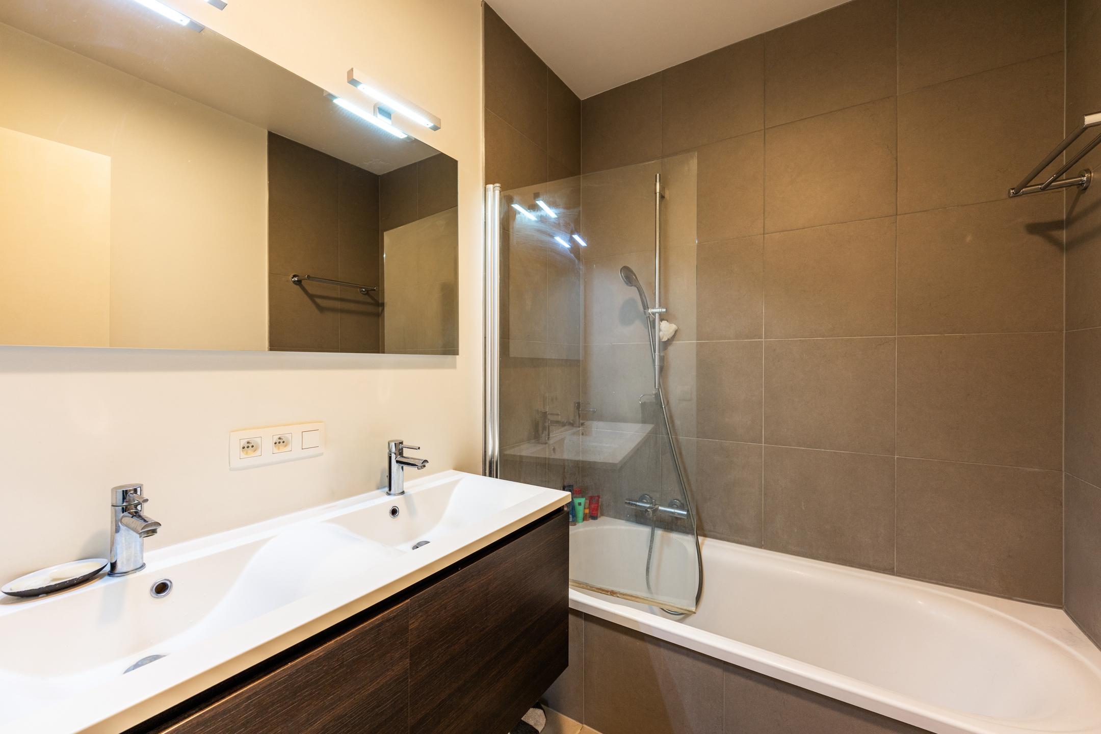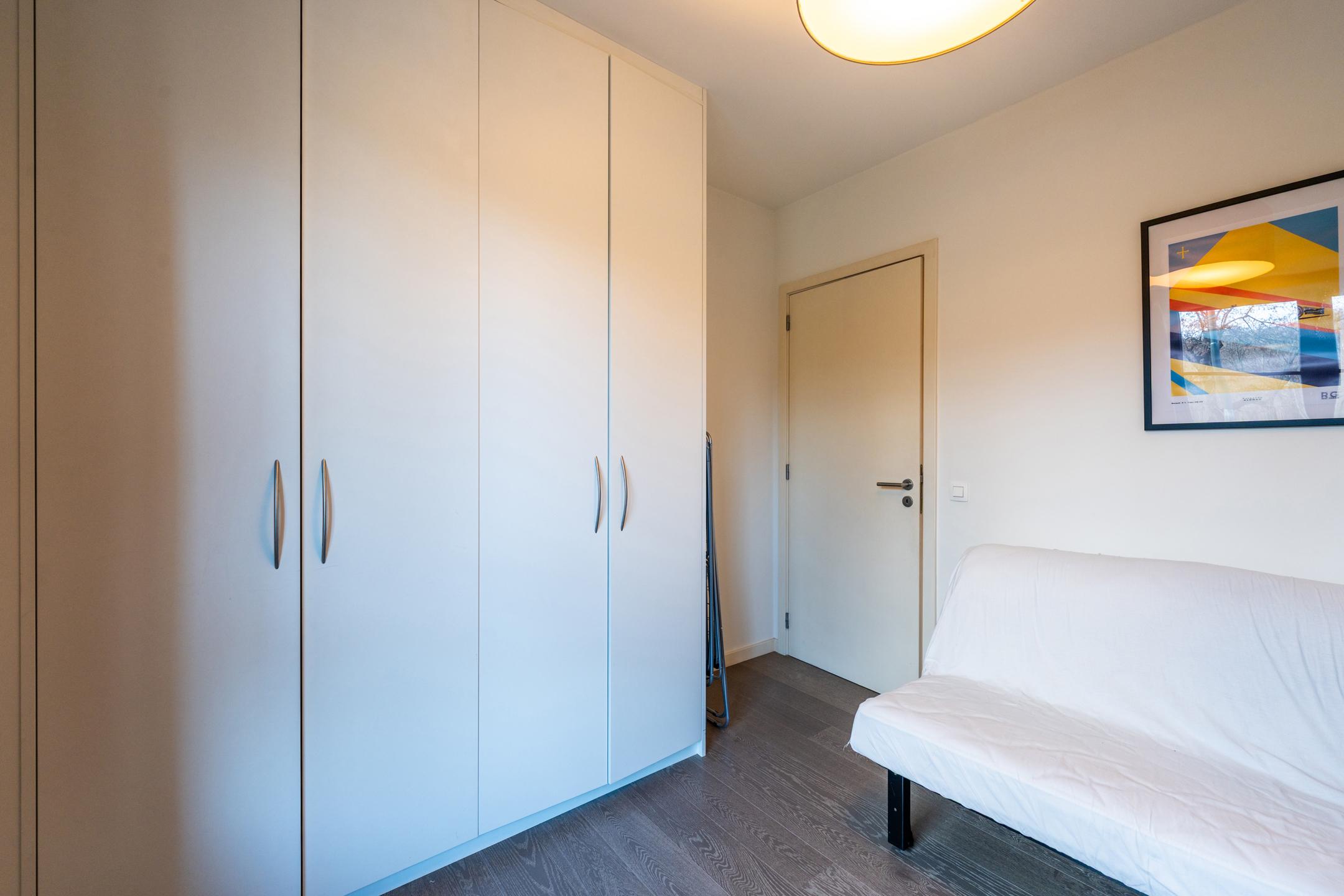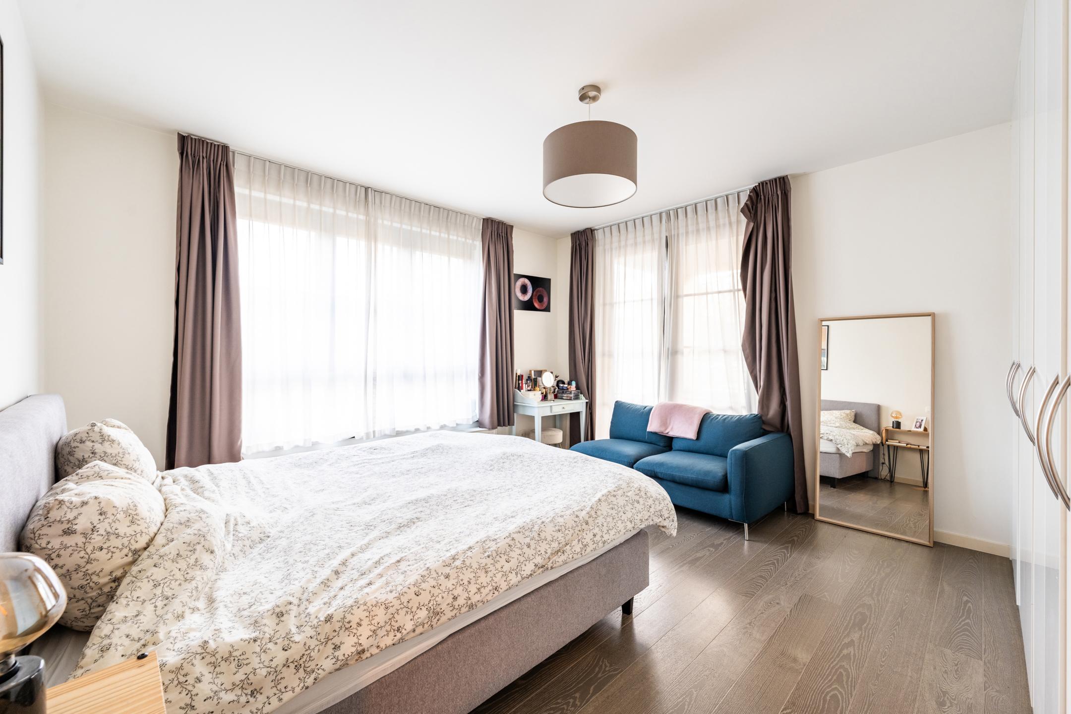In close proximity to the Mellaert Ponds and all amenities, in a luxury residence built in 2013, magnificent 2-bedroom/1-bathroom apartment of ± 106 m². It comprises: entrance hall with guest toilet and cloakroom, bright living room of ± 43 m² with fully equipped open-plan kitchen with access to the ± 6.50 m² east and south-facing terrace, 1 bedroom of 18.50 m² with built-in wardrobe, 1 bedroom of ± 11 m², beautiful bathroom, utility room/laundry room. Also: PEB C (127 kWh/m²/year), compliant electricity, concierge service, ‘SieMatic’ kitchen with “Siemens” appliances, numerous custom-made storage units from the ‘Camber’ brand, curtains/drapes/light fixtures included, double glazing throughout, individual gas boiler, video intercom, solid wood flooring, lift, water softener, secure access, reinforced door, private cellar no. 32 and a parking space at an additional mandatory cost (+ €30,000), share 283/10,000 + 5 + ?. Magnificent flat offering all the necessary comforts with high-quality materials and fittings! Currently rented at €1,513.94/month excluding charges (long-term lease). Don't wait to visit.
