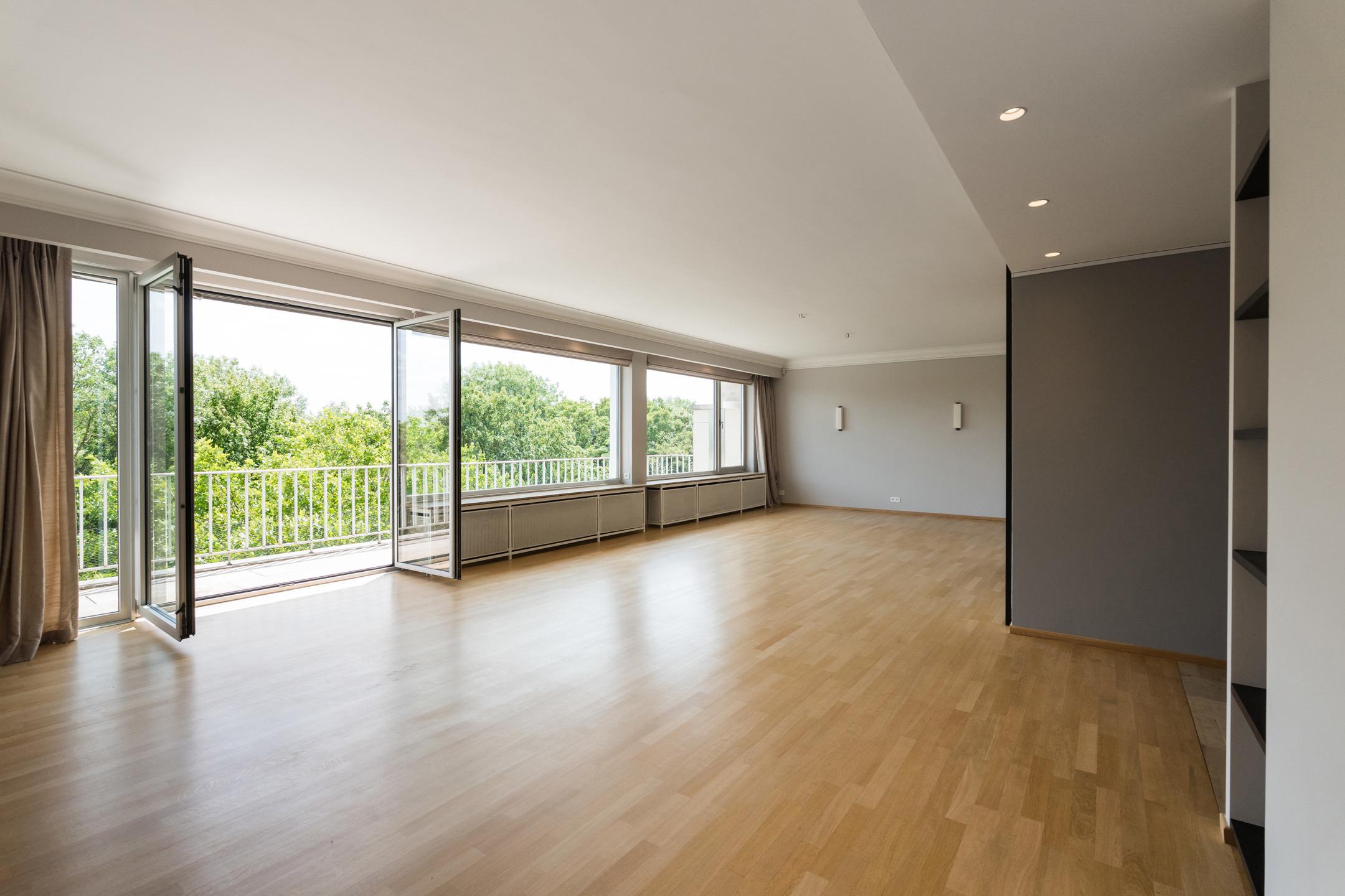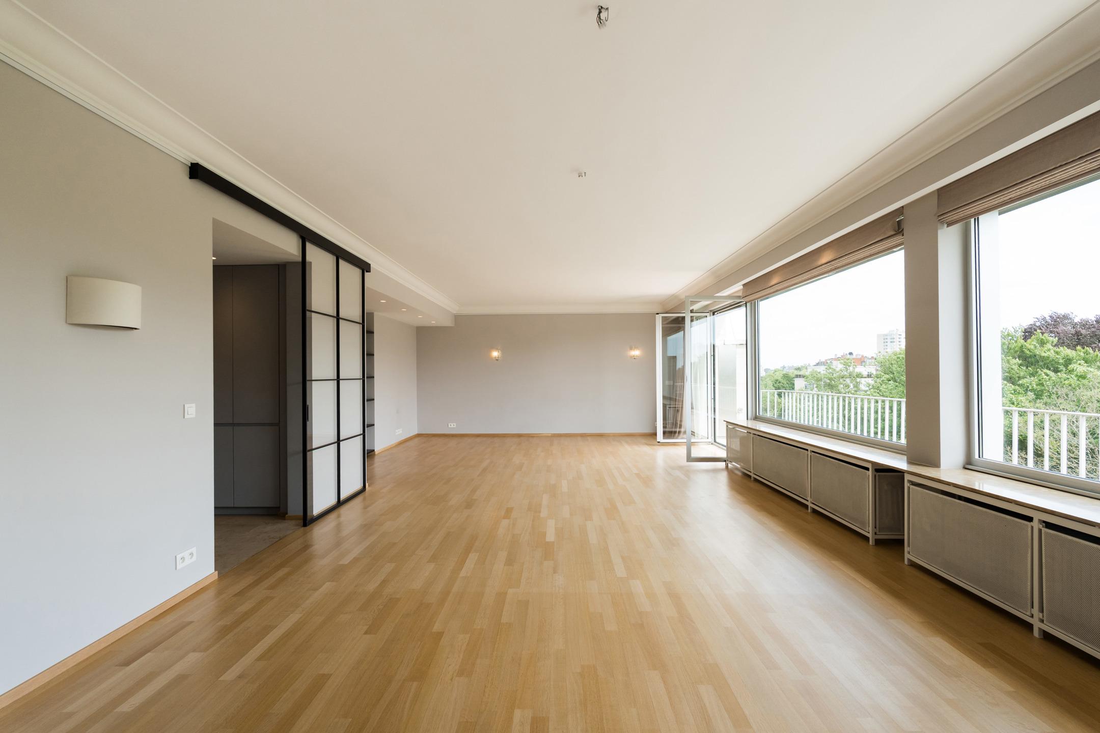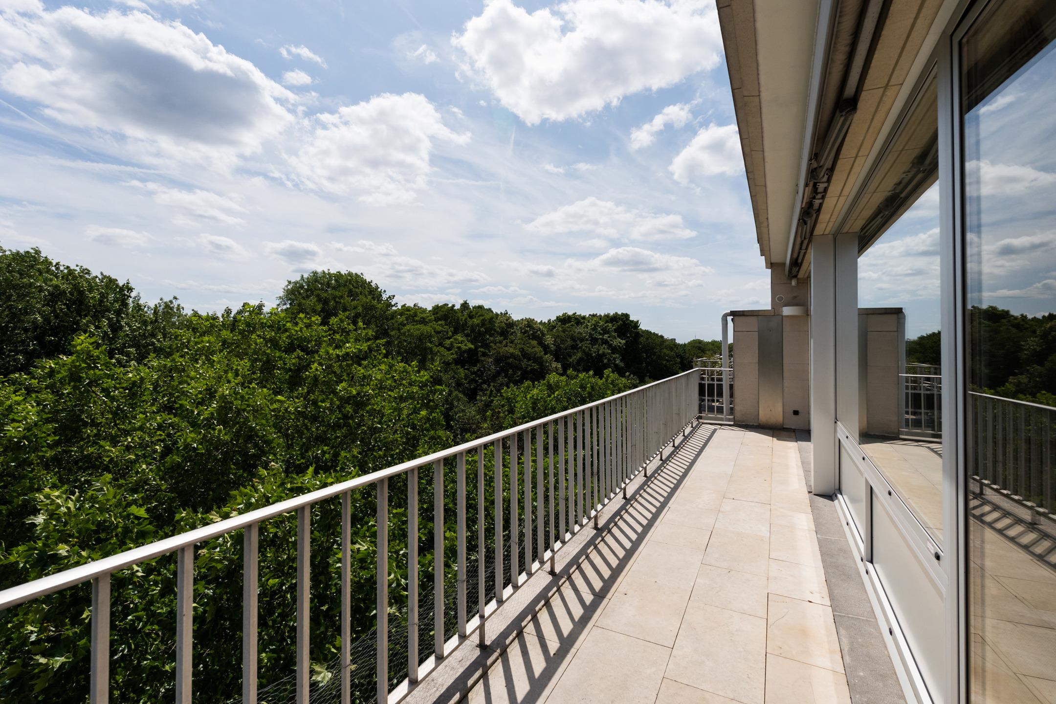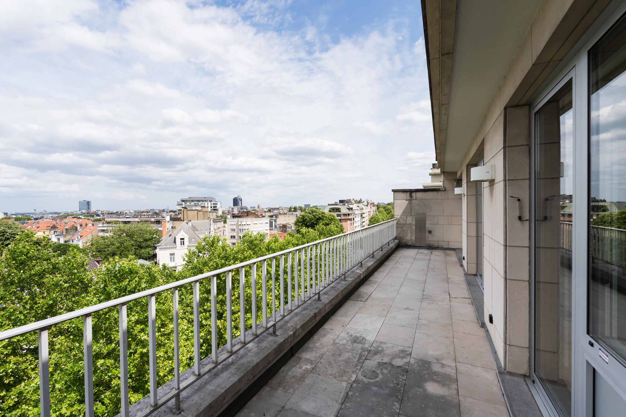 UCCLE - Avenue de Messidor near the Churchill roundabout: Magnificent PENTHOUSE APARTMENT (4bed/2sh) of approx. 185m² of living space and approx. 235m² (Gross according to EPC) with terraces (front: 17.5m² and rear: 22m²) and a GARAGE BOX AND 1 PARKING SPACE. The apartment is located on the 7th and top floor and is composed as follows: a spacious entrance hall of approx. 15m² with a separate cloakroom and a technical room. A spacious and bright reception area of approx. 61m² giving access to a front terrace of approx. 17.5m² (South-facing), a fully equipped kitchen (two sinks, numerous storage spaces, a dishwasher, a fridge and freezer, oven, hood, etc.) with a breakfast area of approx. 22.5m² and a balcony of approx. 2m², a laundry room with washing machine and dryer included. A night hall with a guest toilet with washbasin, a bedroom/office of approx. 11m², a second night hall with storage, 2 bedrooms of approx. 15m² and 12m², a shower room, a master suite of approx. 20m² with dressing room and adjoining shower room of approx. 8.5m² with wc, a rear terrace of approx. 22m² with panoramic view (North-East facing). On the ground floor: a street-front garage box and a parking space (mandatory at €35,000), in the basement: a cellar. Aluminium double glazing - EPC: F - Electricity compliant (2042) - Property manager - Elevator - Individual gas boiler. Available upon deed. A property to discover exclusively at Latour & Petit!