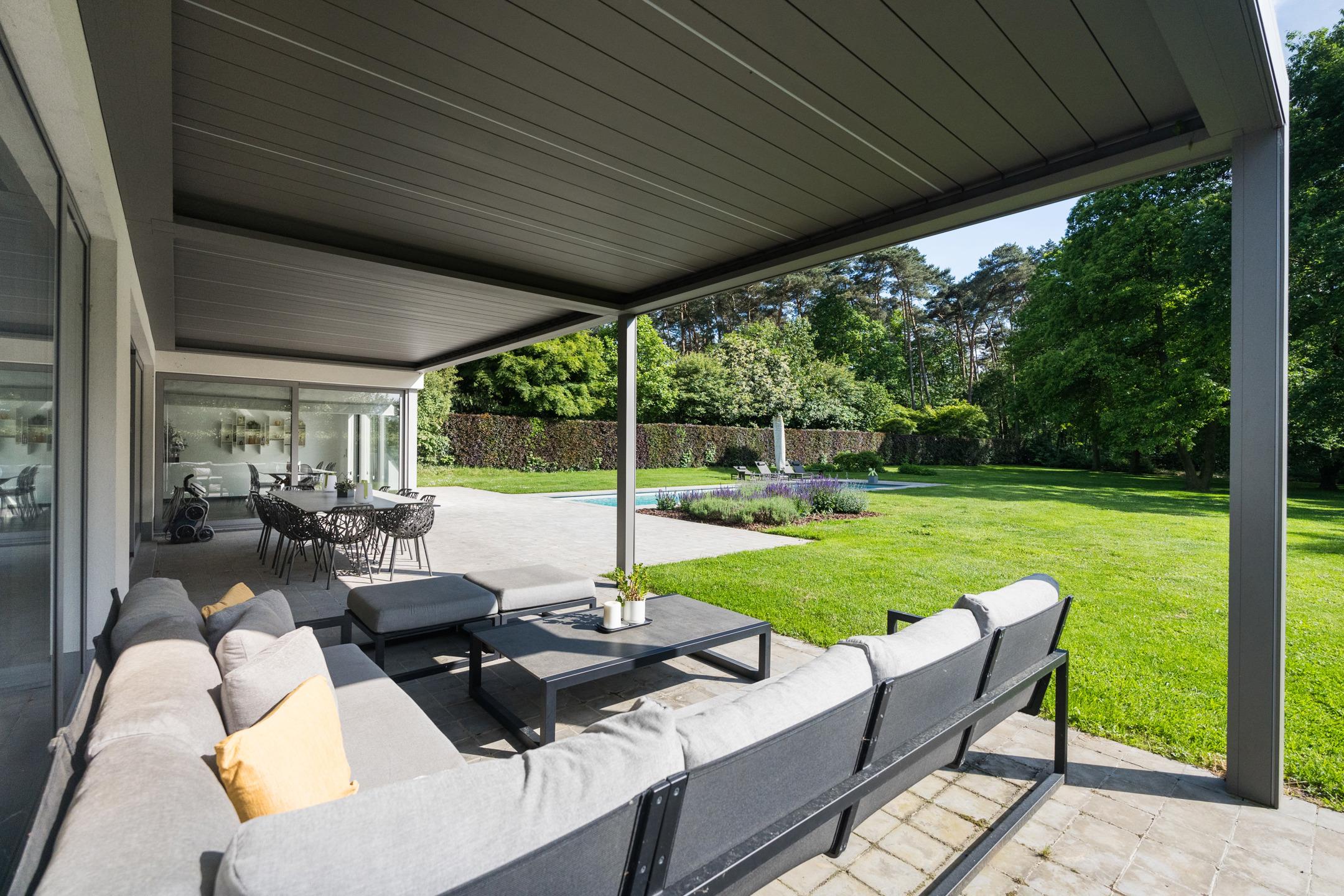Outside : ± 100 m² terrace with bioclimatic pergola, swimming pool, fenced garden, garden shed. To the front: 3-car car park, gate with video entry system.