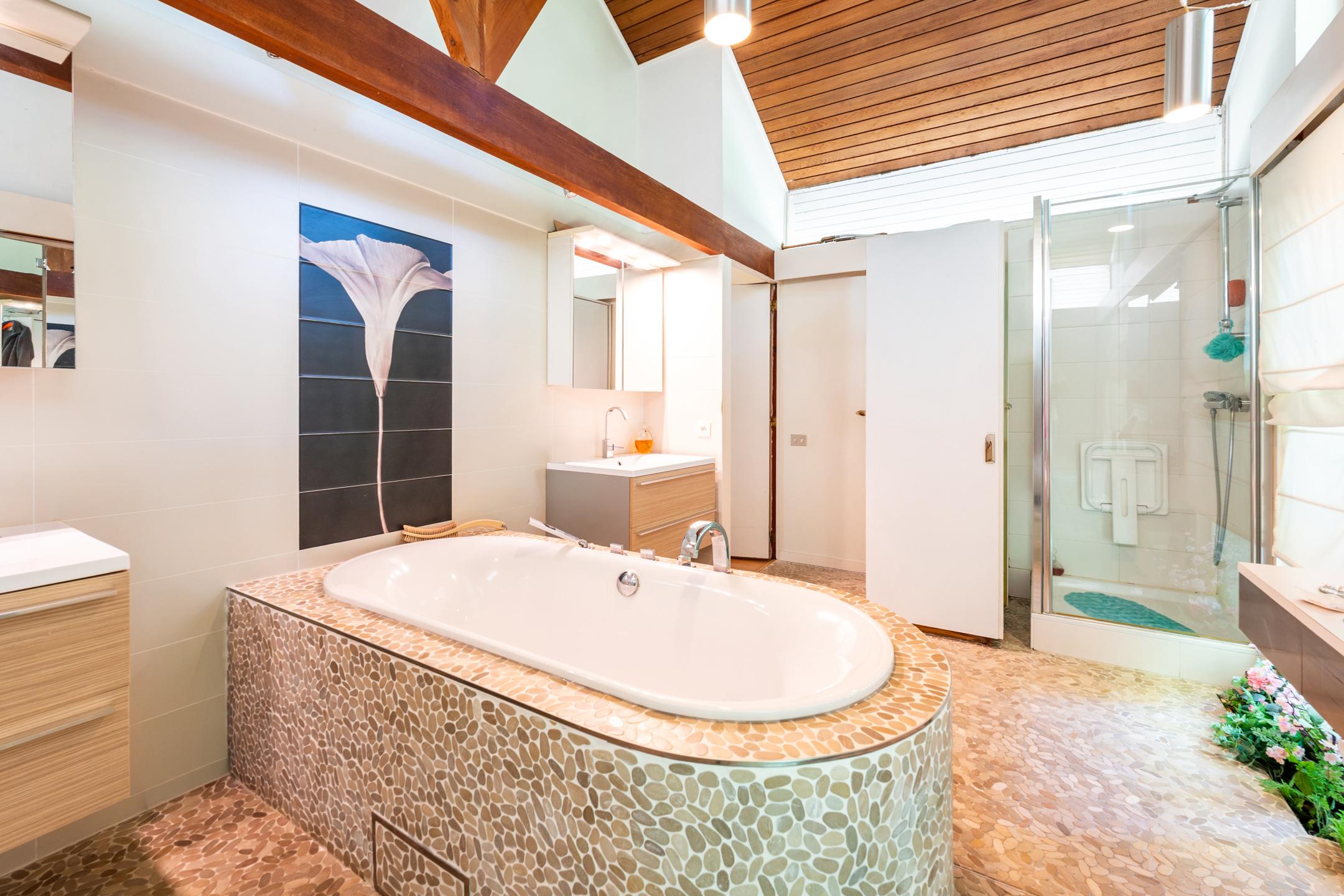 Day area : Entrance hall with cloakroom and guest toilet, living space with cathedral ceiling composed of two lounges. At the heart of the house: a sitting area around the open fire (Macassar ebony panels) connecting the lounges and the dining room, fully equipped kitchen with central island, utility room/pantry, garage for one car, secondary entrance, bedroom 1 with bathroom or office/professional practice. Entrance door handles by Jules Wabbes.