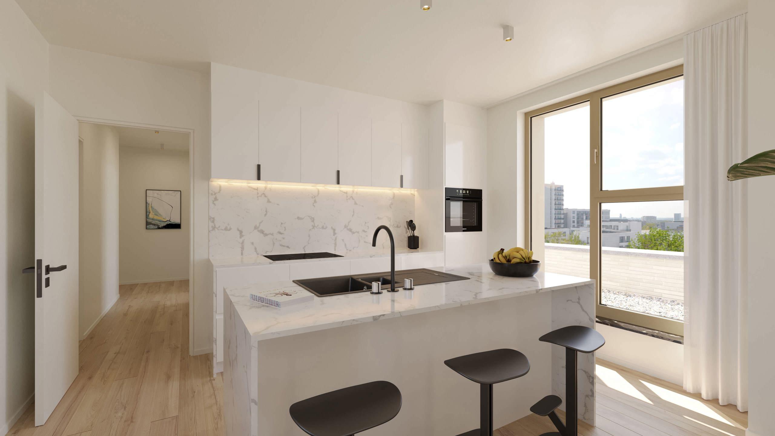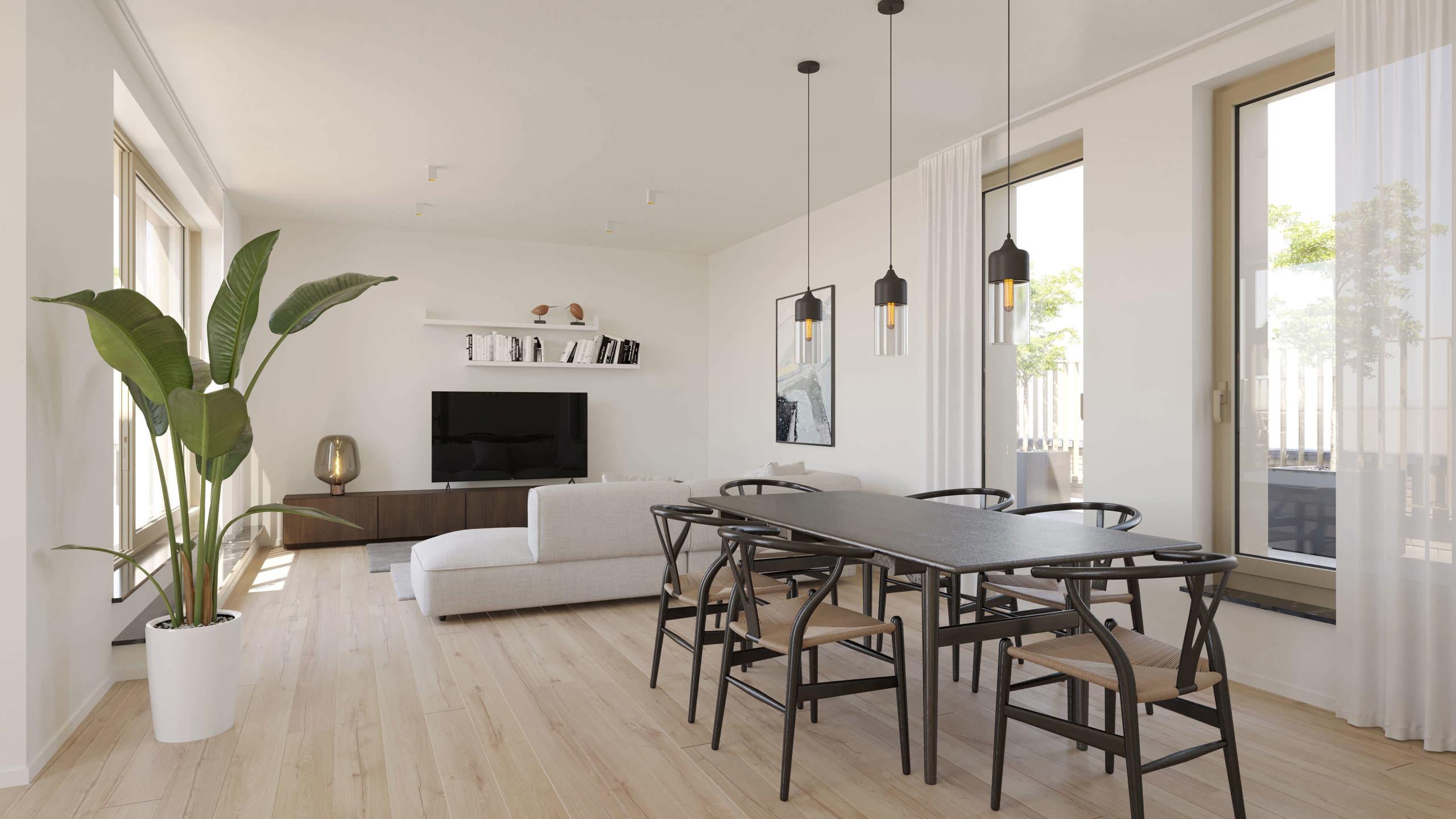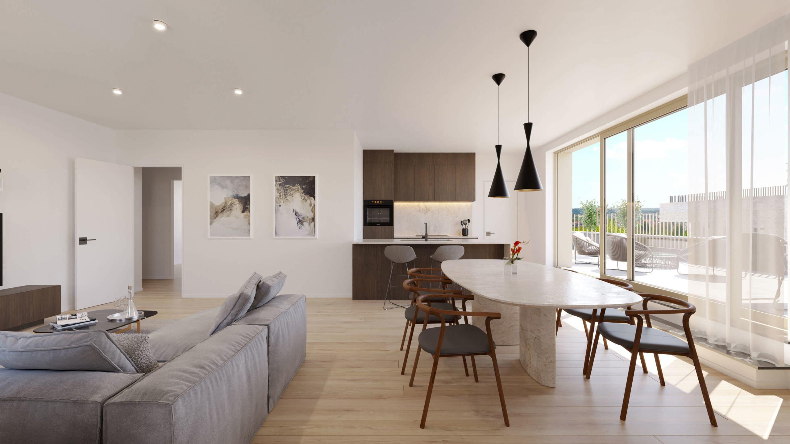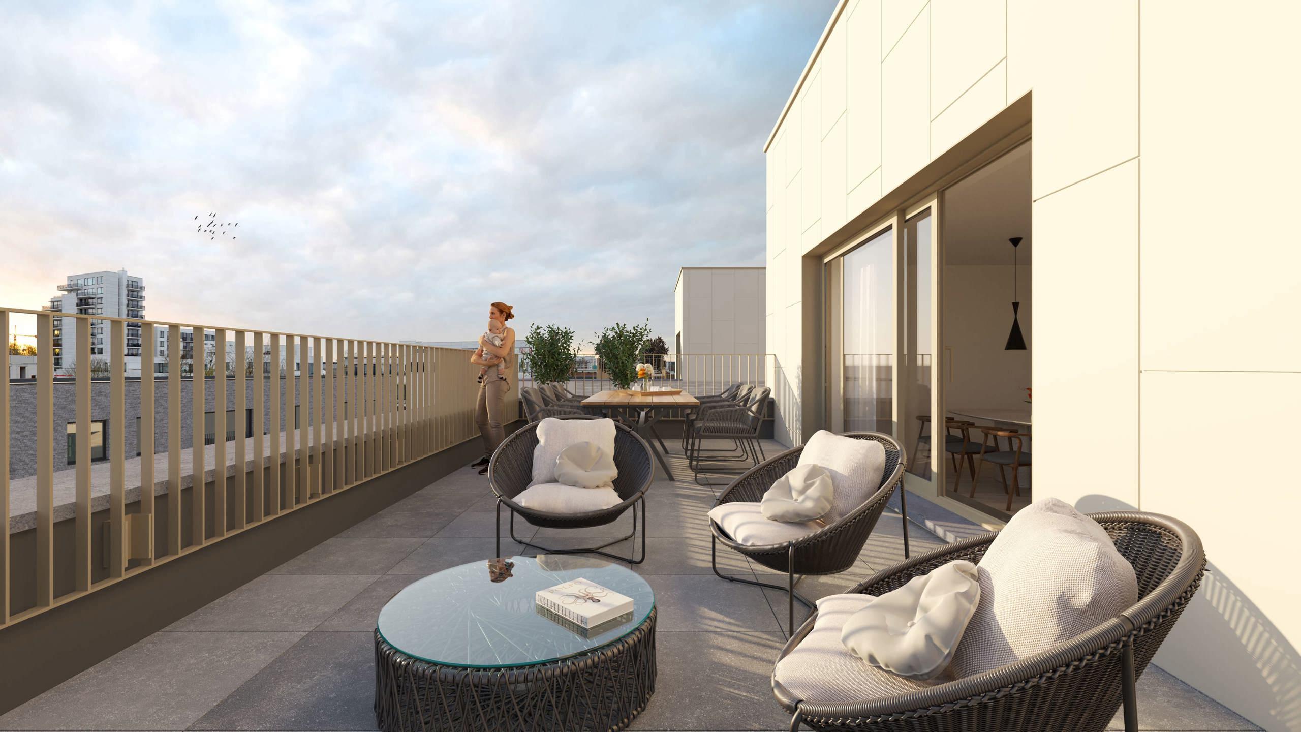 EVERE, à la lisière de Woluwe-St-Lambert, dans un quartier dynamique et en plein essor, magnifique PENTHOUSE NEUF (2ch/1sdd) de 106,9 m² avec une TERRASSE de 31,8 m² et un beau JARDIN COMMUN. Situé au 5ème étage, il se compose d'un hall d'entrée avec espace vestiaire et WC séparé. Vaste séjour de 37,6 m² avec cuisine ouverte super équipée donnant accès à la terrasse orientée sud-est. Deux chambres (14,5 m² et 9,1 m²), une salle de douche (double lavabo, douche) et une grande buanderie. Idéalement situé, l'appartement bénéficie d'un accès direct à de nombreuses facilités (OTAN, E40, Ring, aéroport, bus, tram, gare, commerces, écoles, parcs et centres sportifs), offrant un cadre de vie pratique et agréable. Performance énergétique avancée et accent mis sur la durabilité grâce à ses équipements (panneaux solaires, chauffage par le sol, pompes à chaleur, ventilation double flux, etc.). PEB A. Cave incluse et parking obligatoire en supplément. Local commun sécurisé pour les vélos et vélos-cargo. Vente du terrain sous le régime des droits d'enregistrement (12,5%) et des constructions sous le régime de la TVA (21%). Possibilité de TVA à 6%, sous conditions. A découvrir chez L&P !