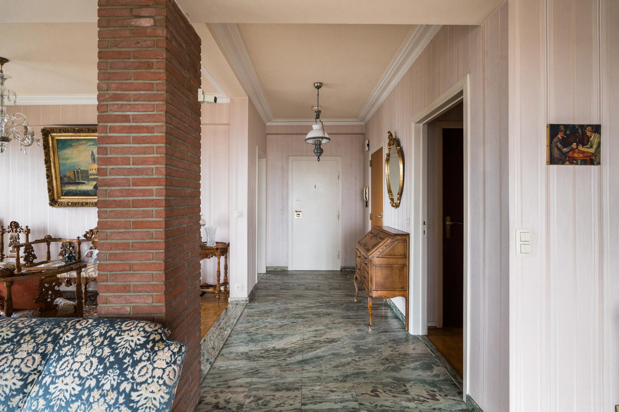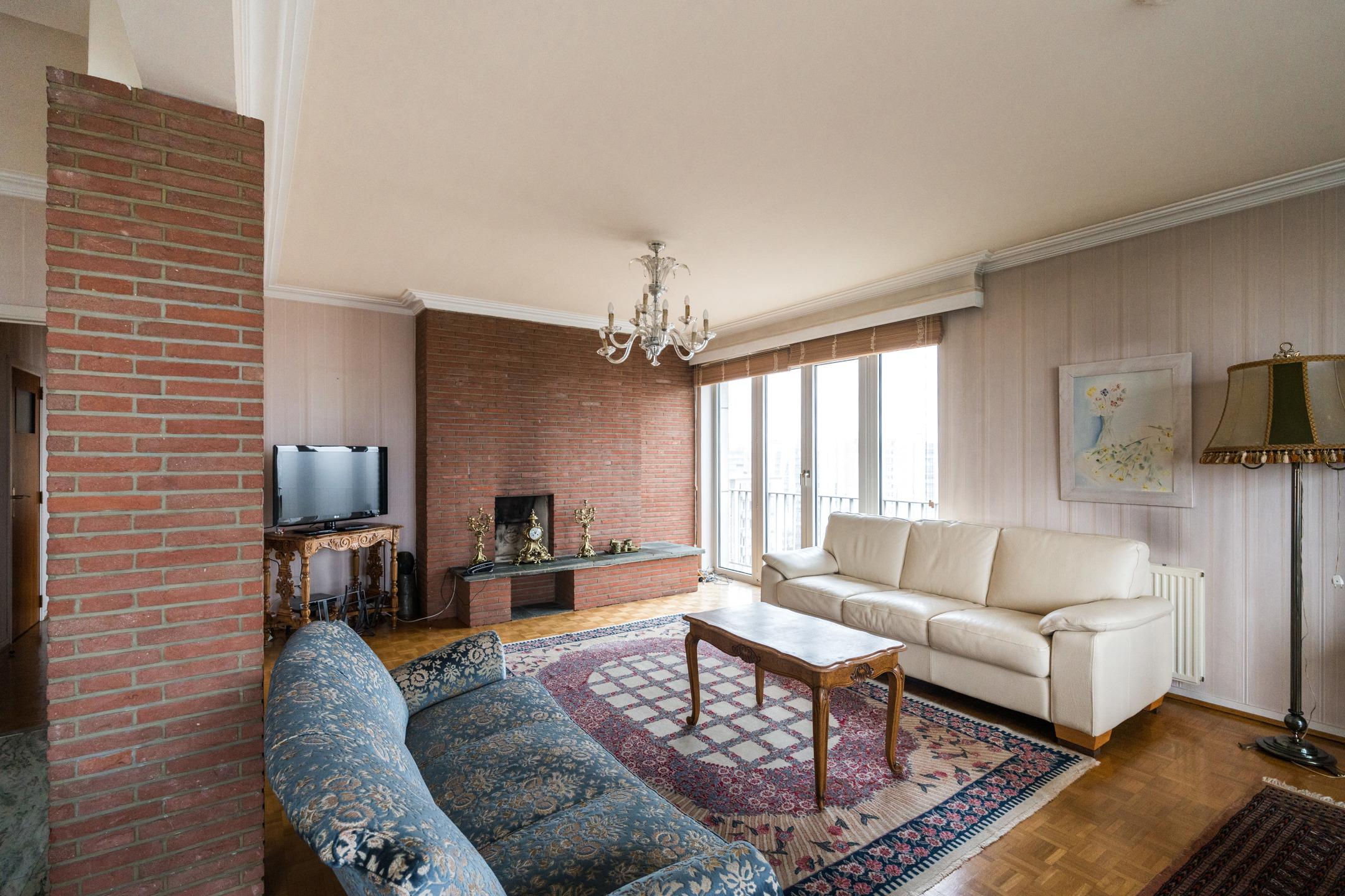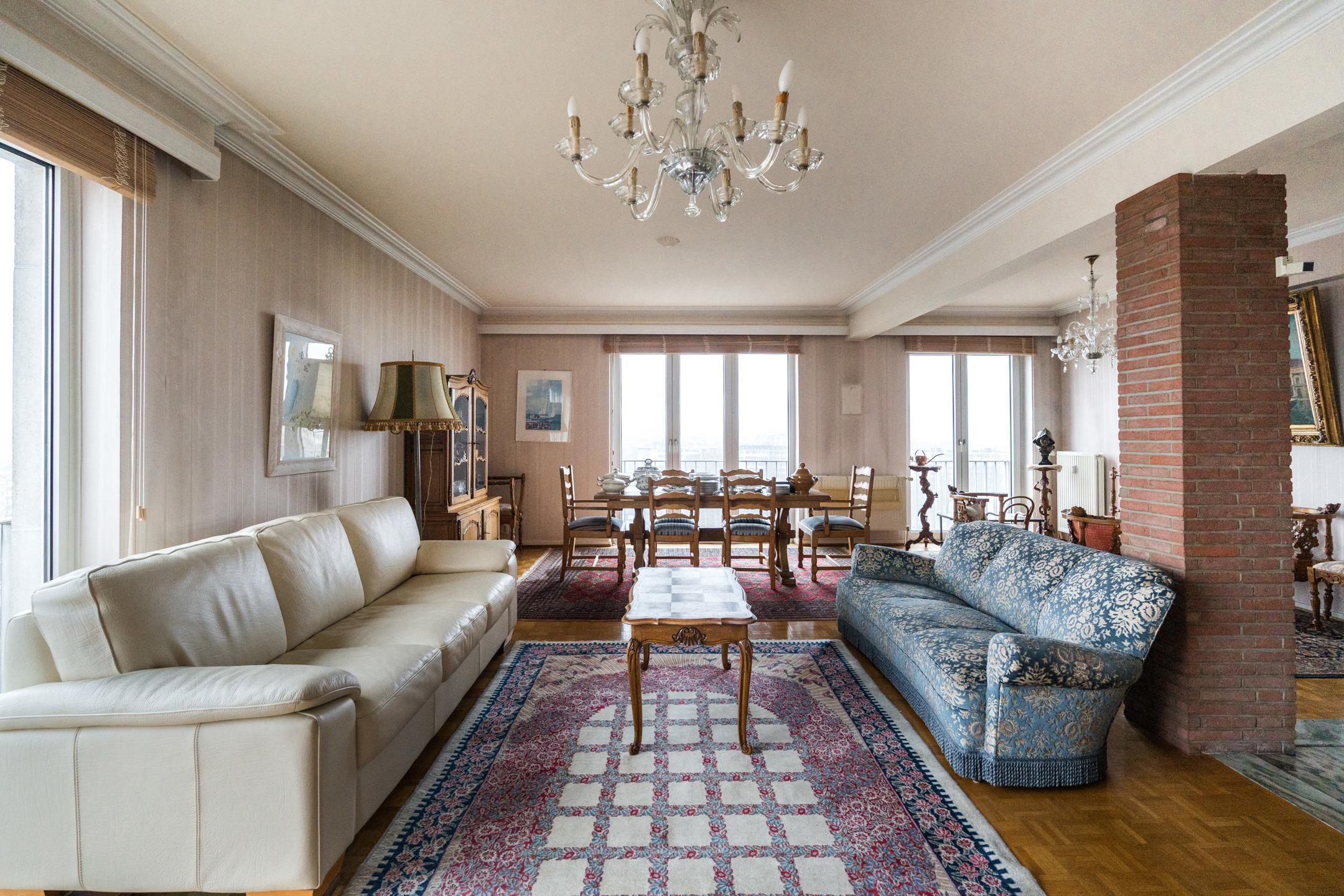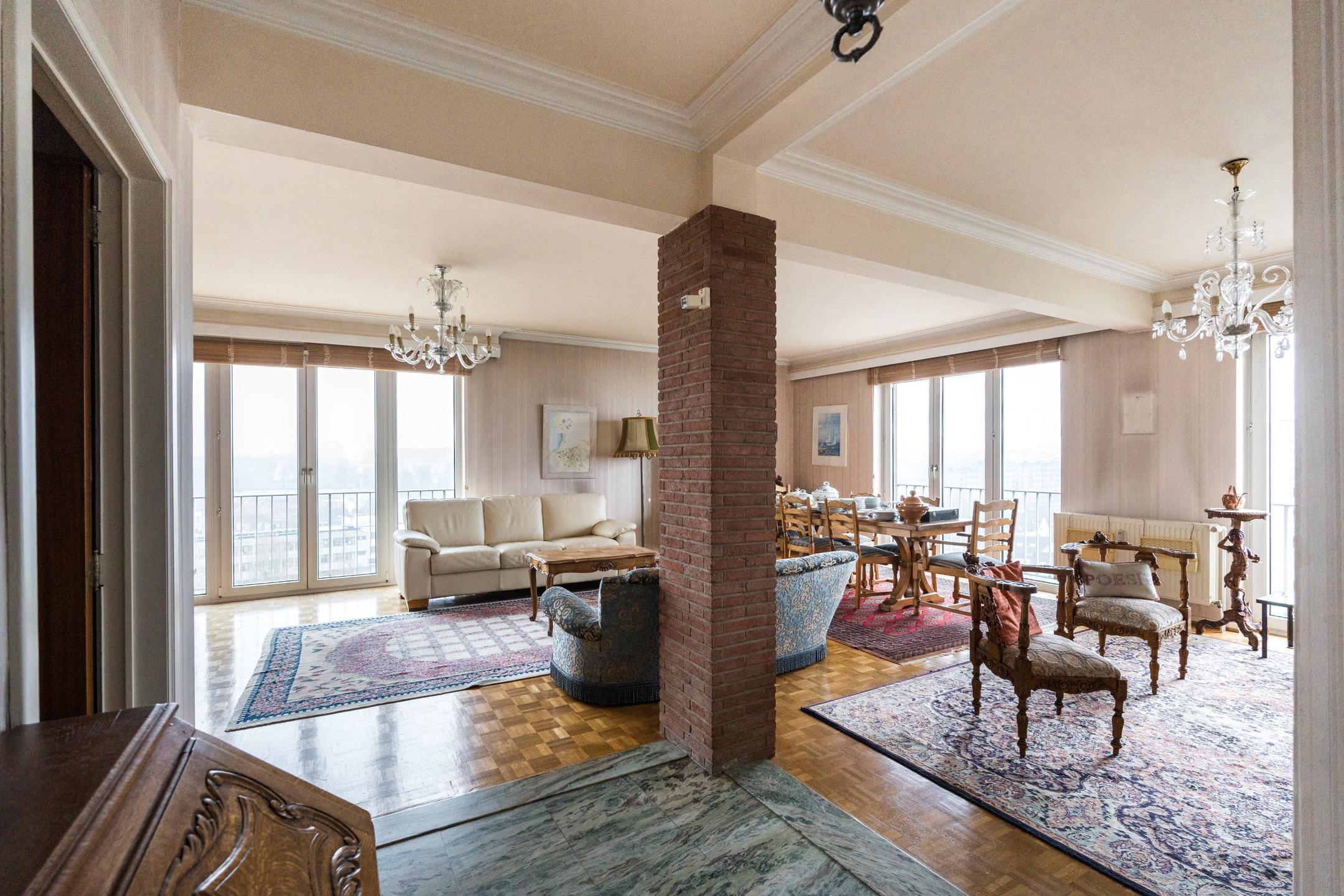 SCHAERBEEK, dans le quartier des Jardins, à proximité de la Place Meiser, de l'OTAN et de ses nombreuses facilités, lumineux APPARTEMENT (2ch/1sdb) de ± 115 m² avec emplacement de parking et cave dans un immeuble construit en 1967. Situé au 10ème étage sur 11, il est composé d'un hall d'entrée, un salon/ salle à manger de 45,5m², une cuisine équipée avec porte vers la terrasse, un hall de nuit avec débarras et wc séparé, une salle de bains (baignoire, lavabo, espace machine à laver) et 2 chambres de 11m² et 14m². Anciennement 3 chambres, le séjour a été agrandit pour offrir une belle réception de 45,5m² ! Cave et emplacement de parking (+25.000€) au sous-sol. Chaudière commune au gaz. Châssis en PVC double-vitrage. Electricité non conforme. PEB D-, 193kWh/m²/an. A découvrir sans plus tarder chez Latour et Petit !