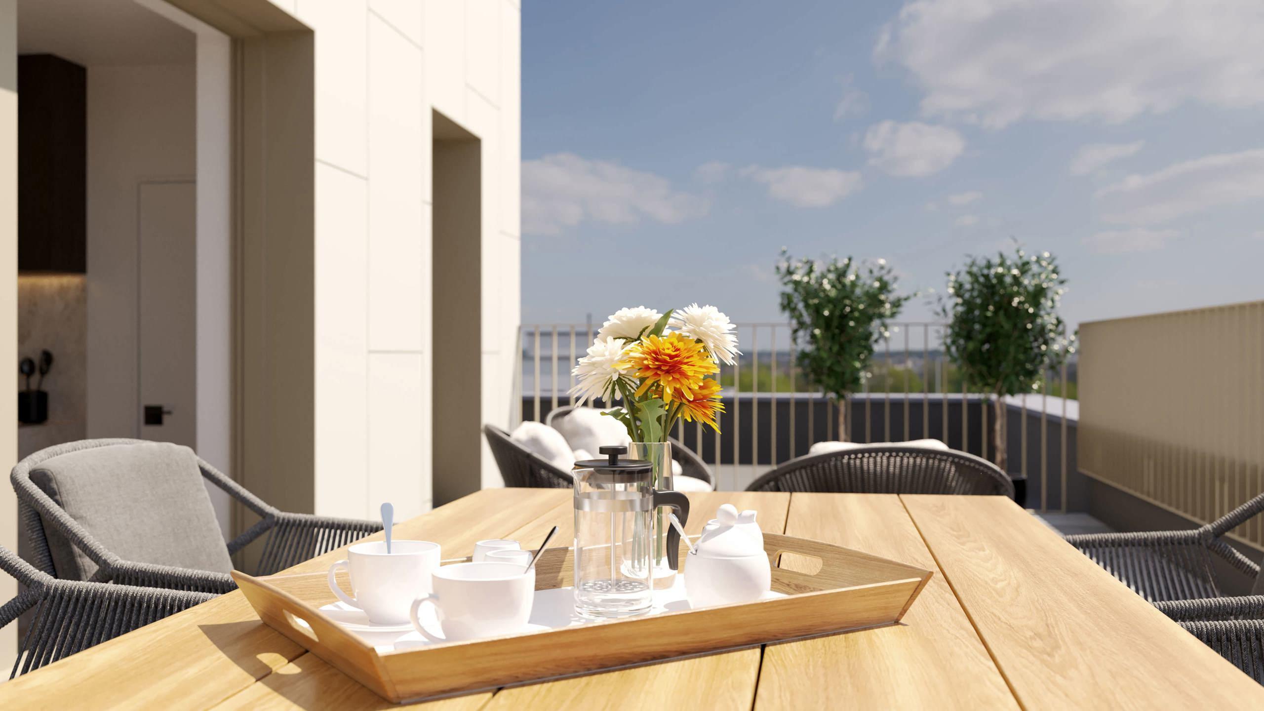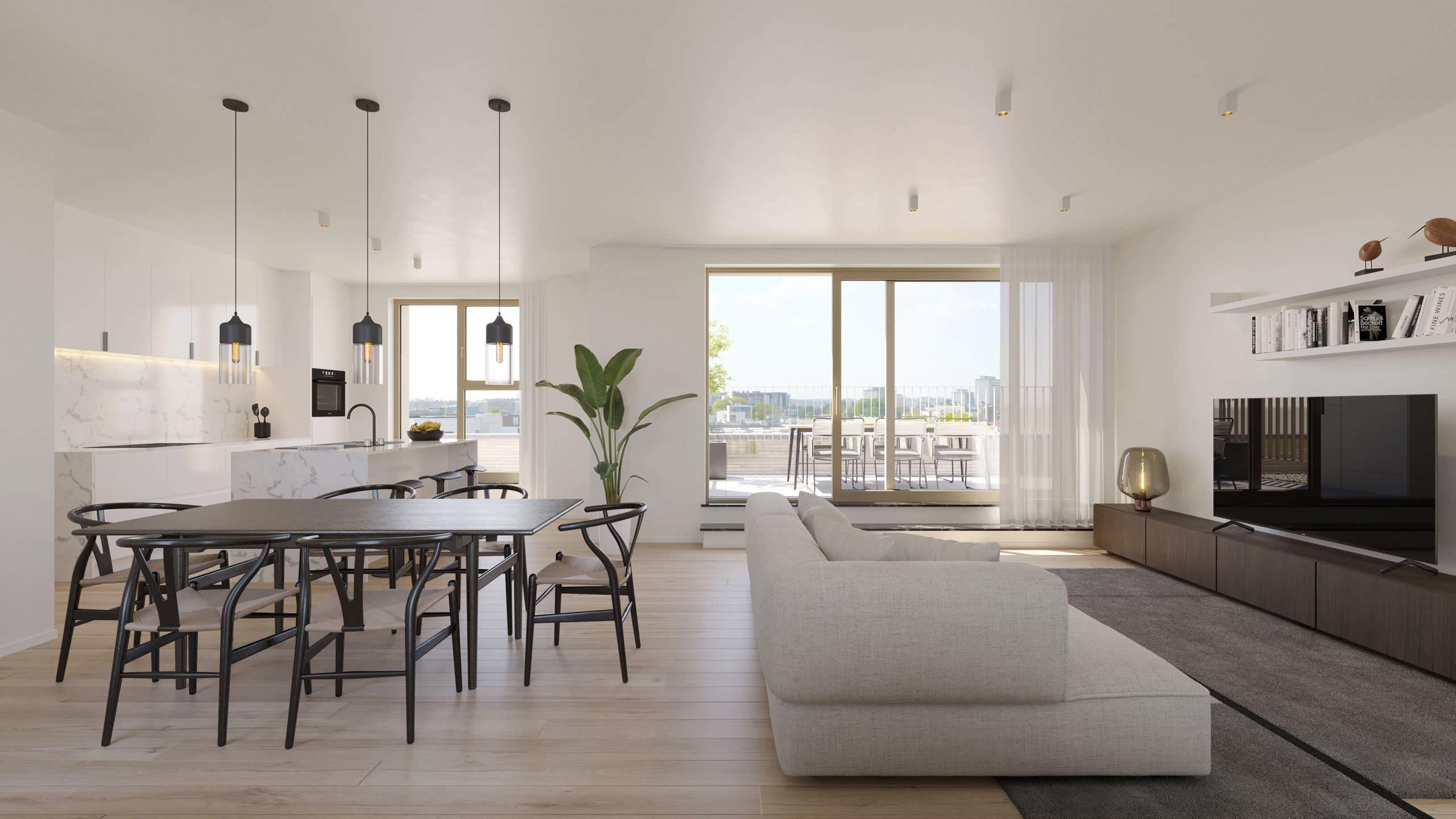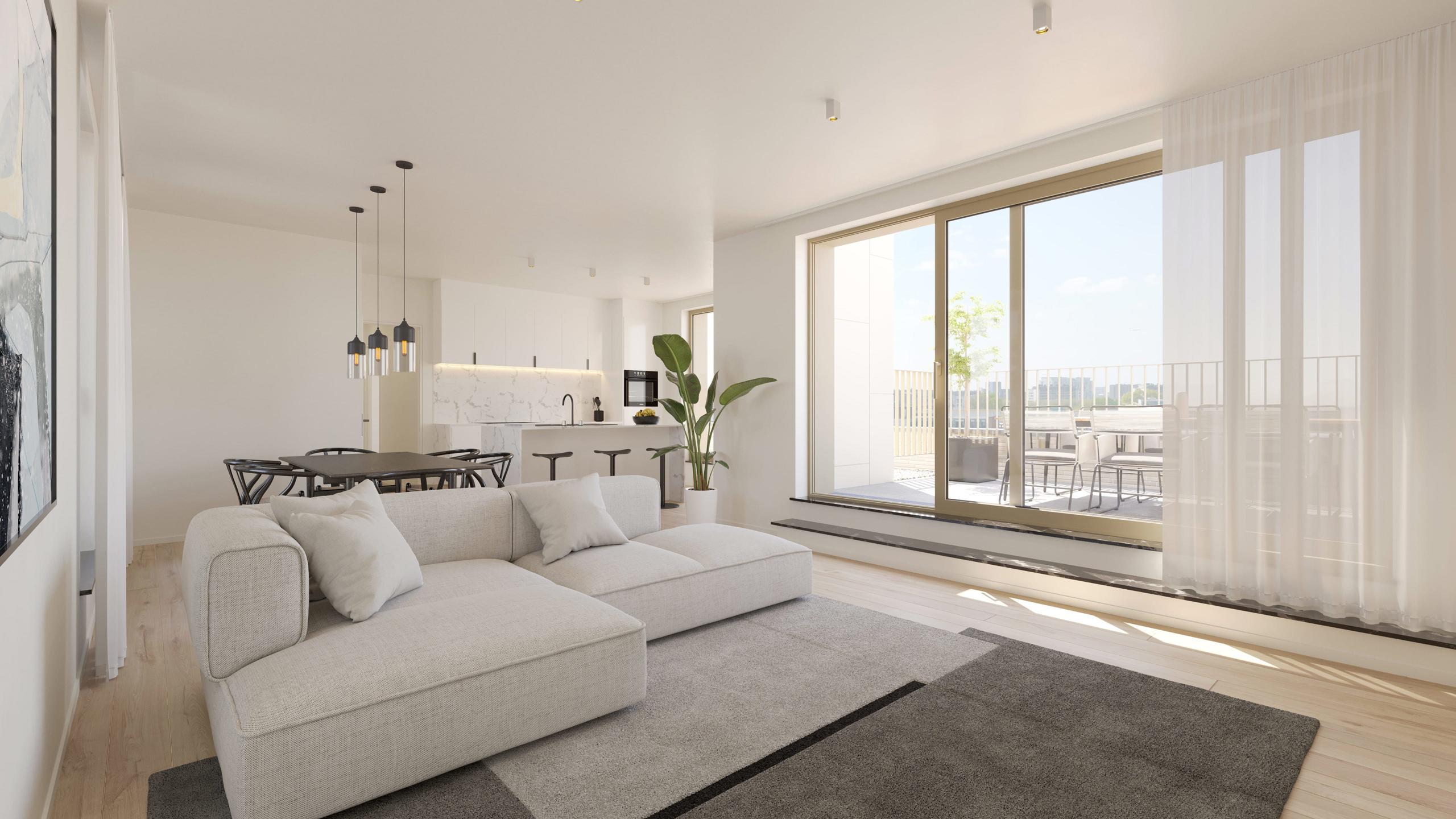 EVERE, op de grens met Sint-Lambrechts-Woluwe, in een dynamische en sterk evoluerende wijk, prachtig NIEUW PENTHOUSE (3slpk/1badk/1douchek) van 146,7 m² met een TERRAS van 35,4 m² ideaal georiënteerd op het ZUIDWESTEN en een mooie GEMEENSCHAPPELIJKE TUIN. Gelegen op de 5e verdieping, bestaat het uit een inkomhal met gastentoilet en wasruimte, een lichtrijke leefruimte van 44,7 m² met volledig uitgeruste open keuken en toegang tot het terras. Een hoofdslaapkamer (18,5 m²) die ook uitgeeft op het terras met aangrenzende badkamer (lavabo, bad, toilet), twee extra slaapkamers (12,9 m² en 12,3 m²), en een douchekamer (lavabo, douche). Ideaal gelegen, geniet dit appartement van directe toegang tot tal van voorzieningen (NAVO, E40, Ring, luchthaven, bus, tram, station, winkels, scholen, parken en sportcentra), en biedt het een praktische en aangename leefomgeving. Geavanceerde energieprestaties en nadruk op duurzaamheid dankzij de aanwezige uitrusting (zonnepanelen, vloerverwarming, warmtepompen, dubbele ventilatie, enz.). EPC A. Kelder inbegrepen en verplichte aankoop van een parkeerplaats als extra. Gemeenschappelijke en beveiligde fietsenstalling, ook voor bakfietsen. Grond verkocht onder het registratierecht (12,5 %) en gebouwen onder het btw-stelsel (21 %). Mogelijkheid van 6% BTW, onder voorwaarden. Te ontdekken bij L&P!