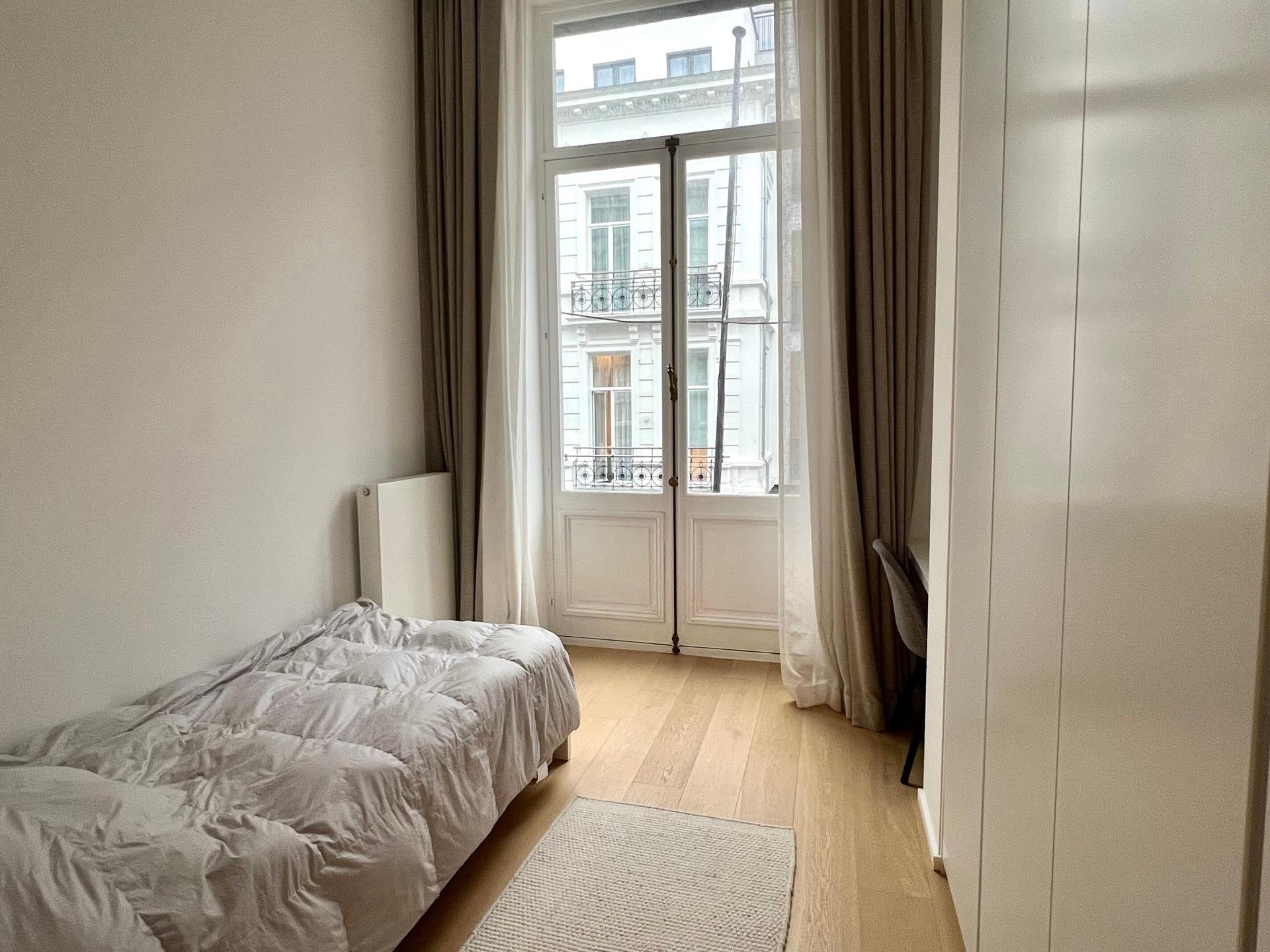 BRUSSEL – Vlakbij het Koninklijk Park, ruim appartement (2 slaapkamers/2 badkamers) van ±128 m² gemeubileerd, gelegen op de 1e verdieping van een charmant herenhuis. Het bestaat uit een inkomhal met gastentoilet, vestiaire en wasruimte, een aangename woonkamer van ±59 m² met ingerichte open keuken en toegang tot het terras op het oosten. De nachthal geeft toegang tot een eerste slaapkamer van ±20m² met aangrenzende badkamer, apart toilet, een tweede slaapkamer van ±11m² met aangrenzende doucheruimte. Voorziening voor lasten: 100€/maand (gemeenschappelijk, verzekering). EPC C. Ontdek het nu bij L&P!