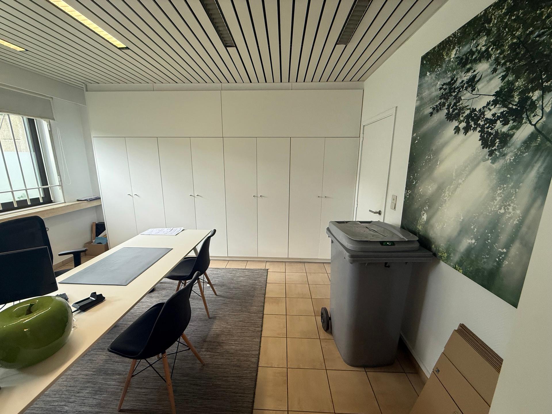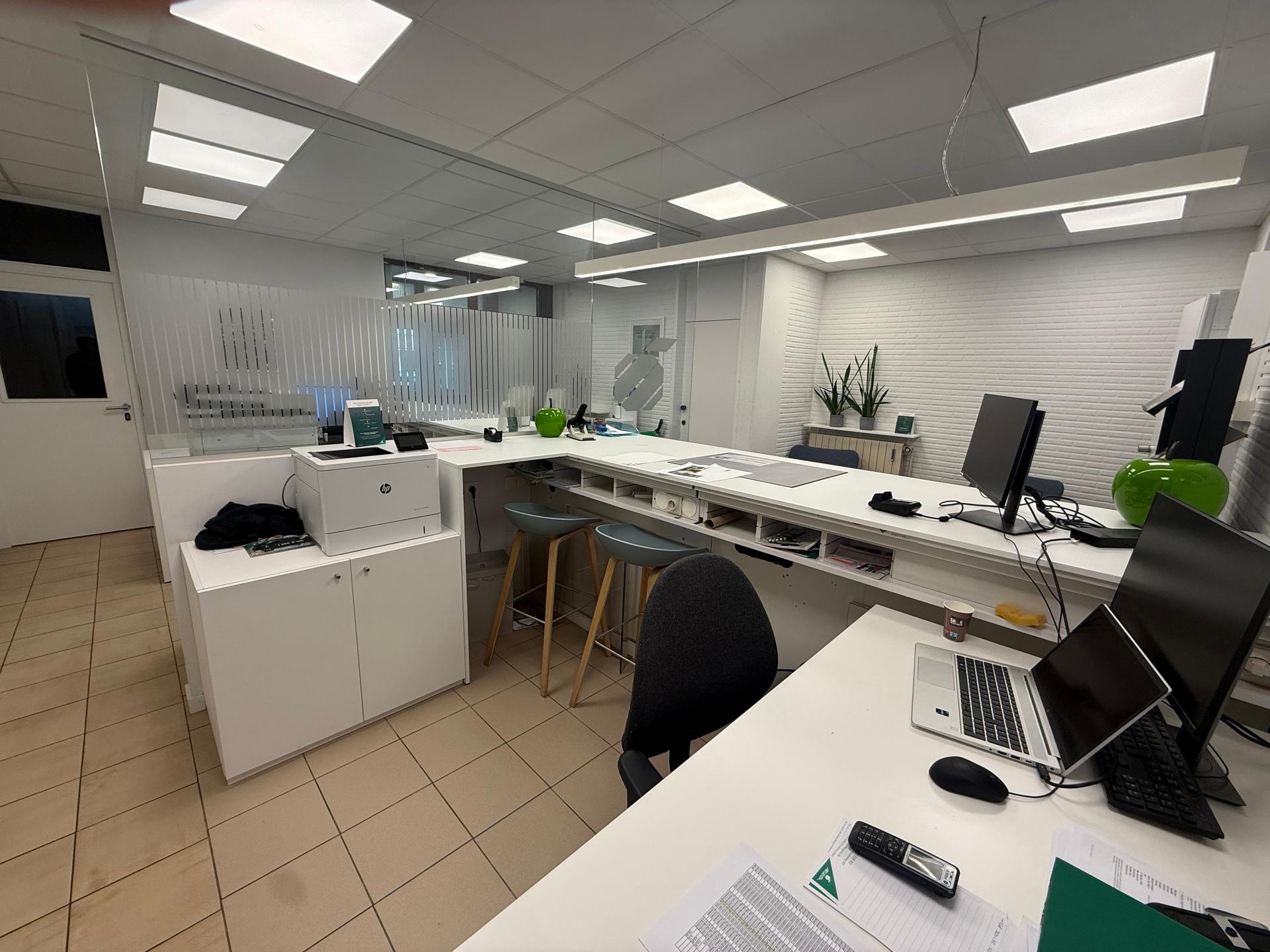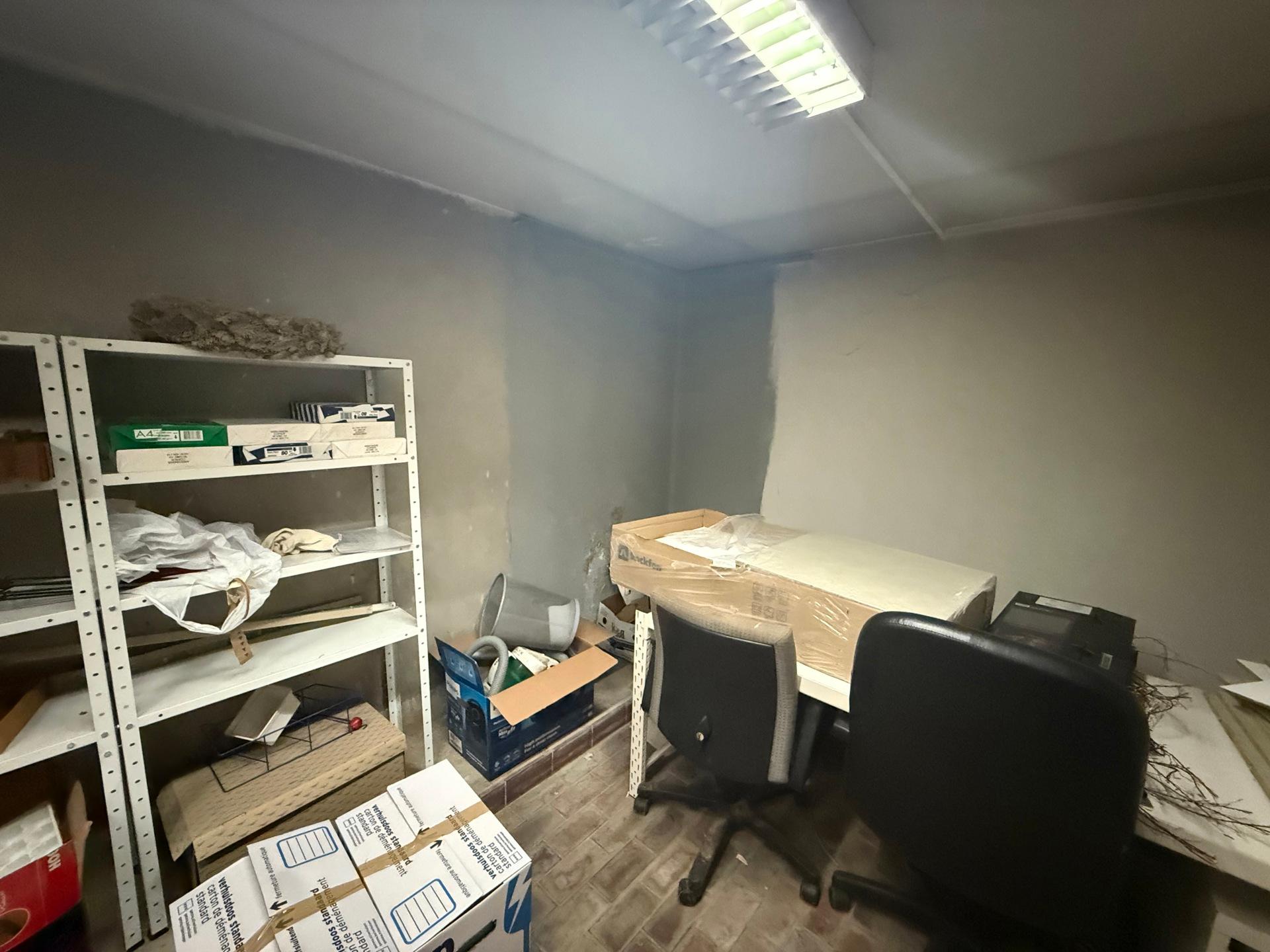 Het bestaat uit een inkom met onthaalbalie, twee aparte bureaus, een keuken en ruime kelders voor stockage.