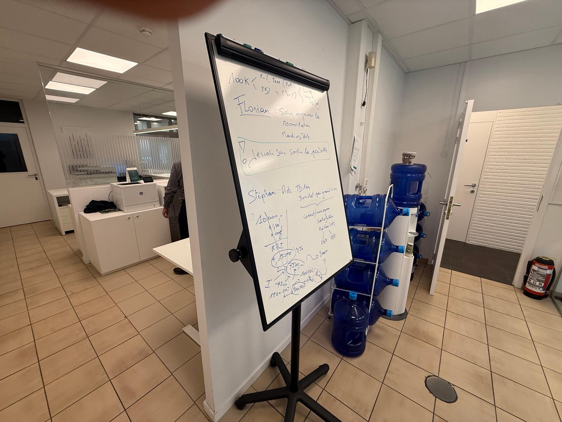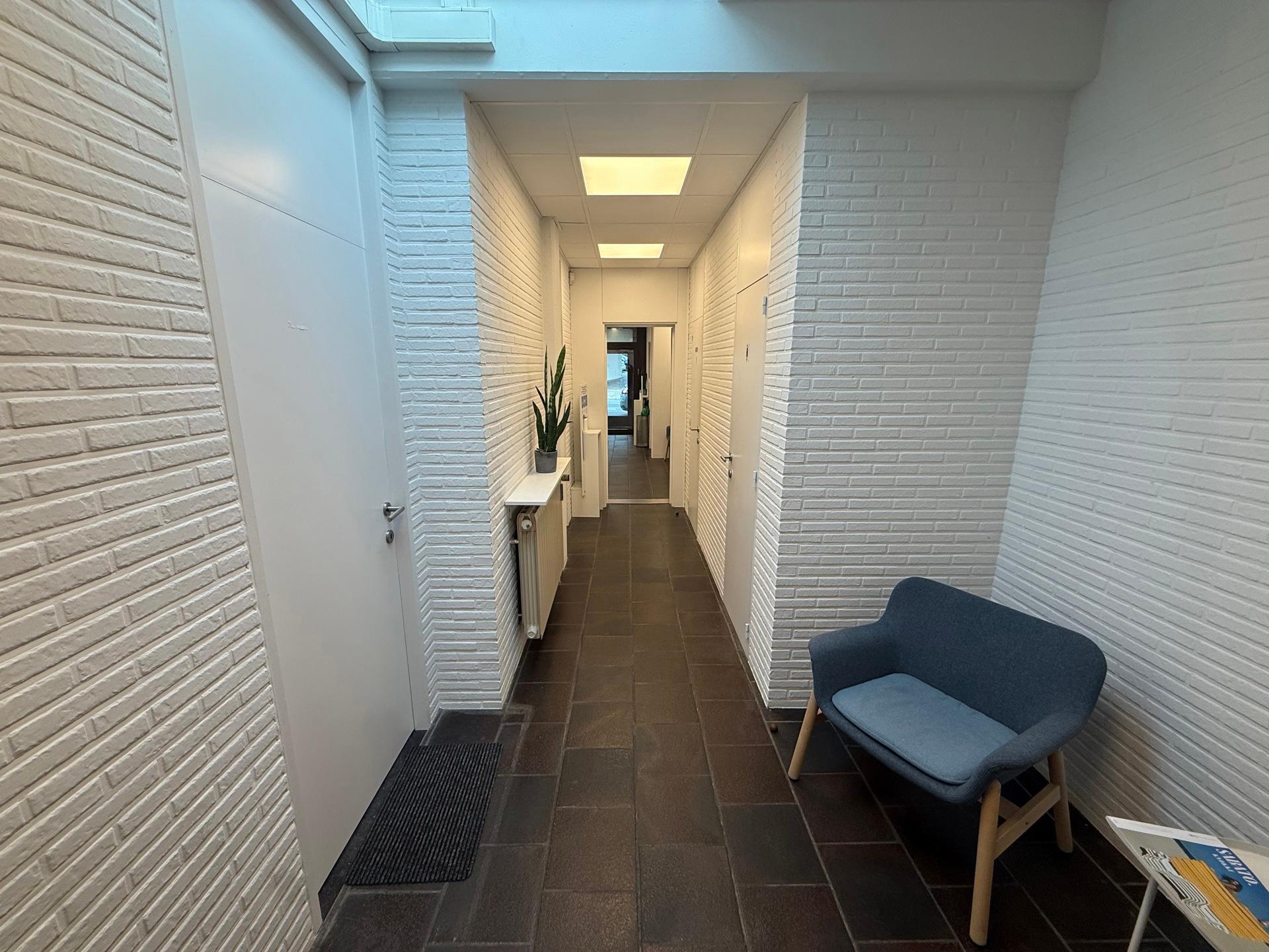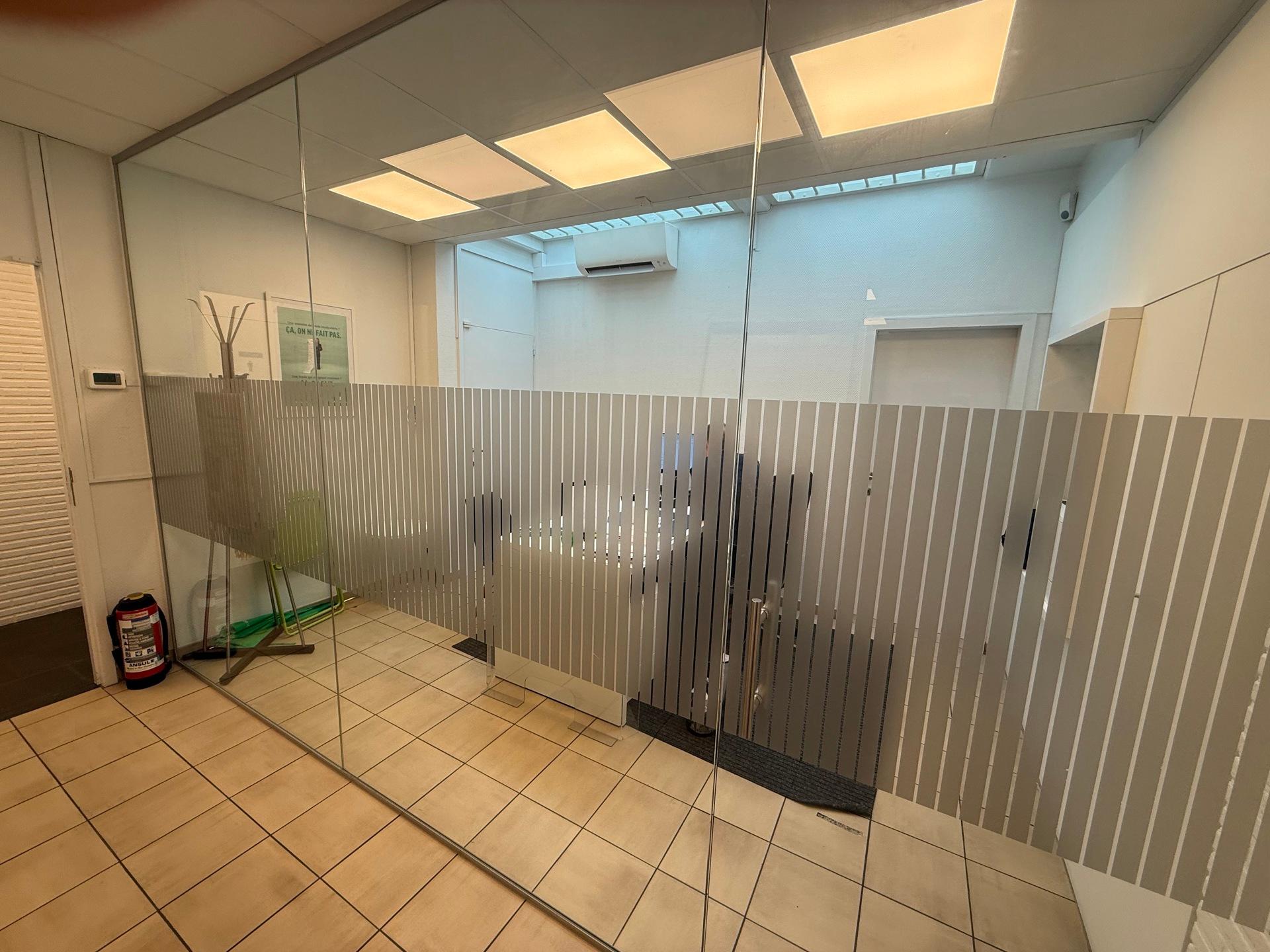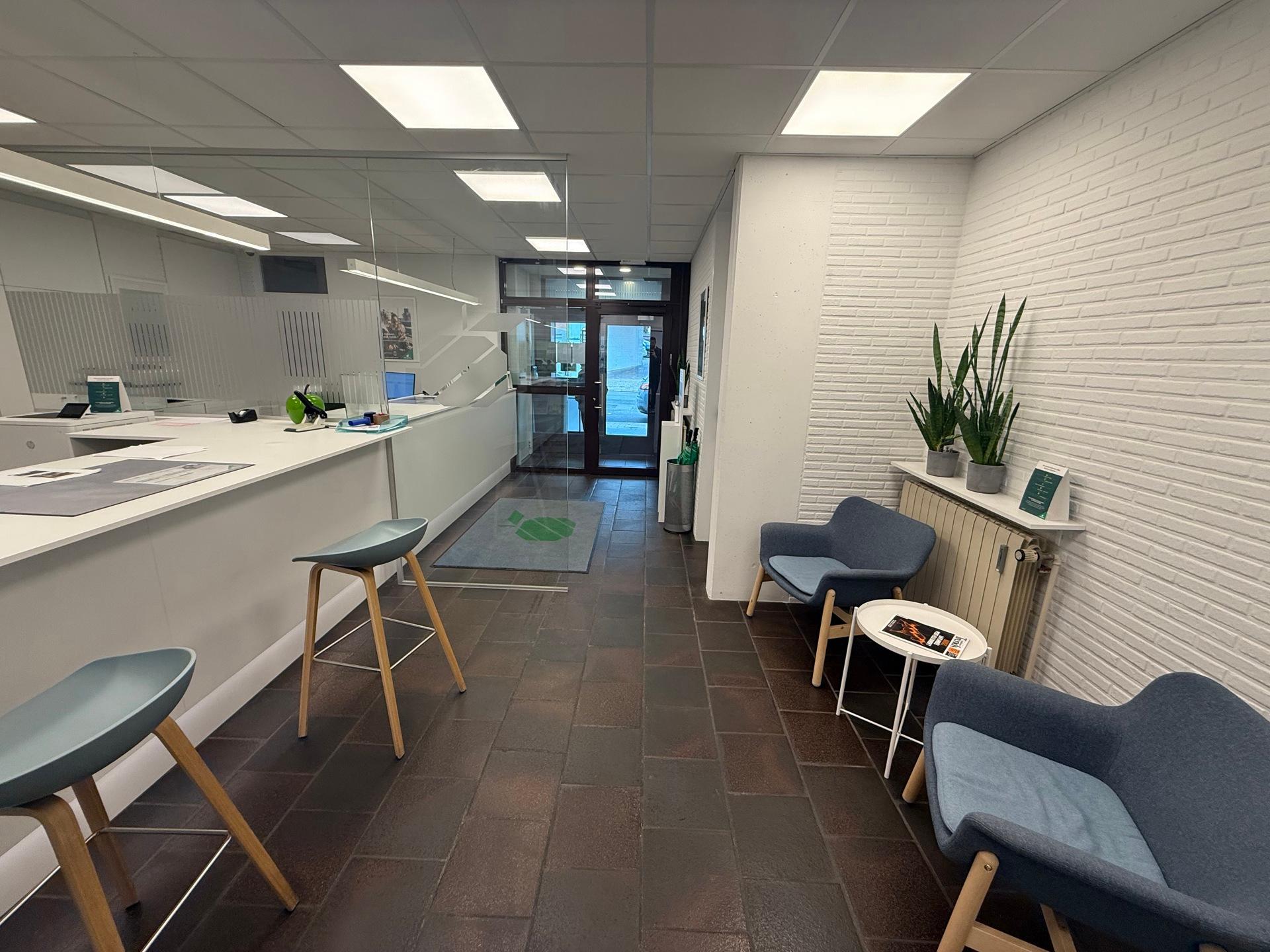 Het bestaat uit een inkom met onthaalbalie, twee aparte bureaus, een keuken en ruime kelders voor stockage.