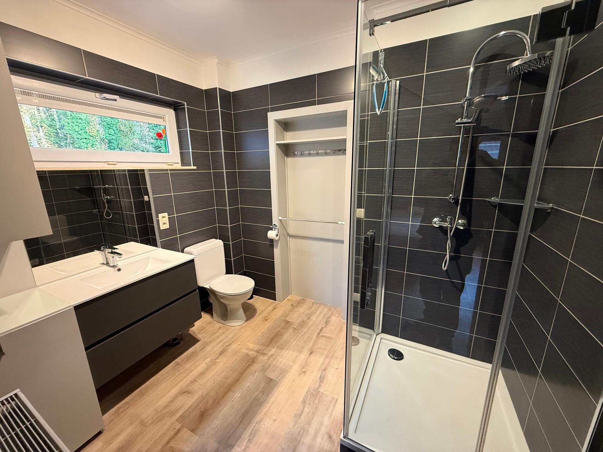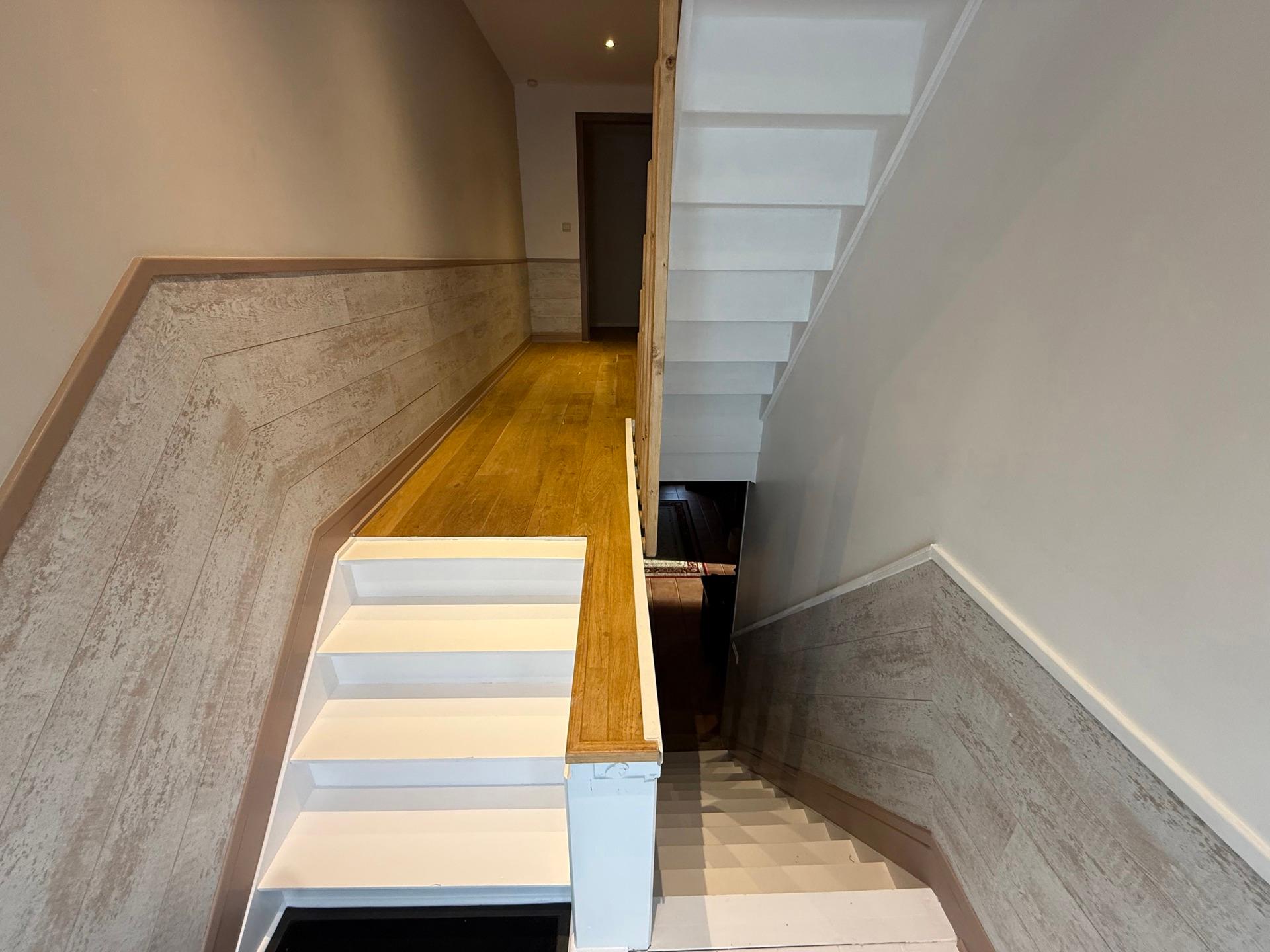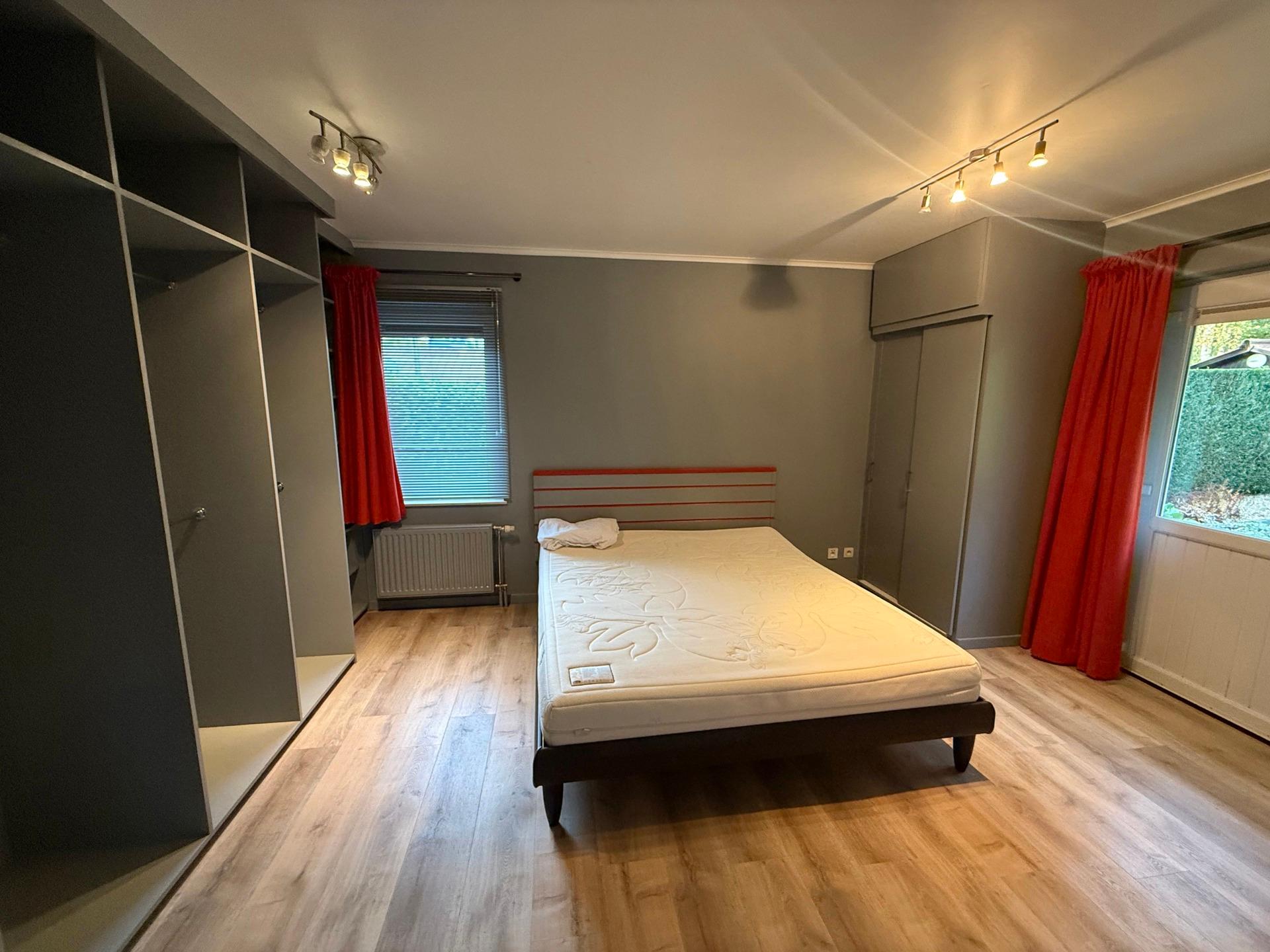 Het gelijkvloers omvat een inkomhal met gastentoilet, een ruime en zeer lichte woonkamer met open haard, een volledig ingerichte keuken met toegang tot het terras, een kelder met nieuwe gasketel en een slaapkamer met dressing en badkamer.
