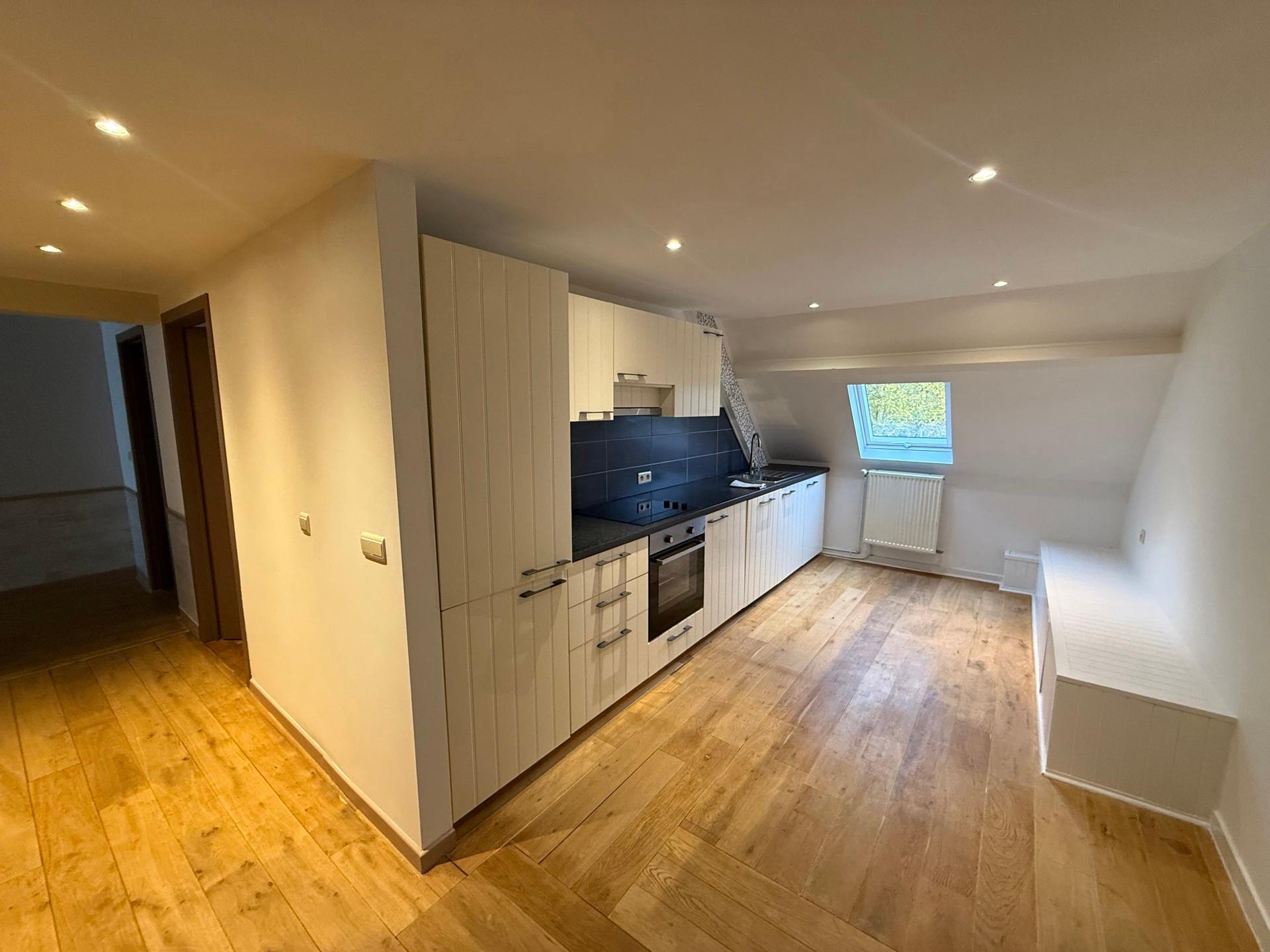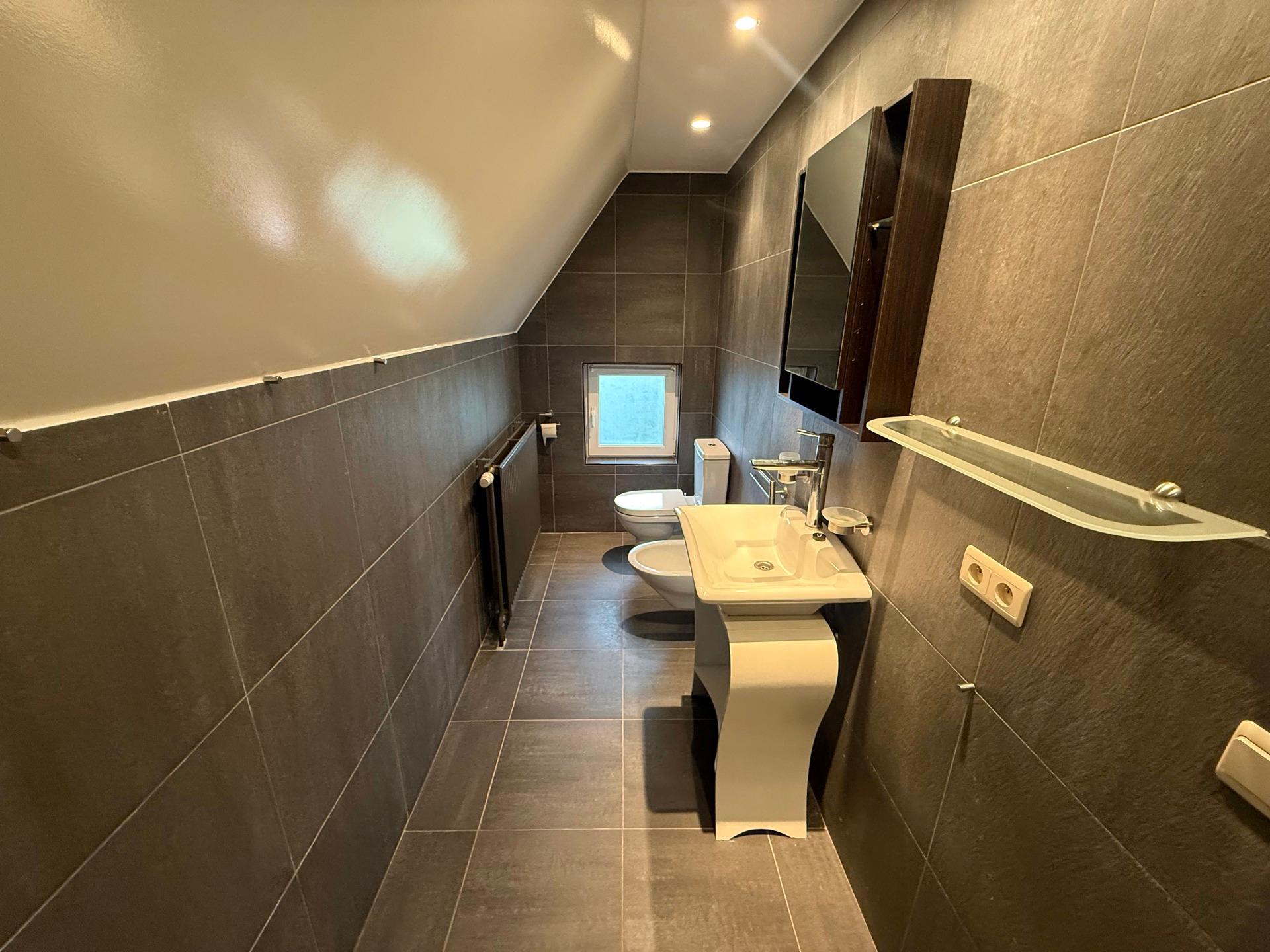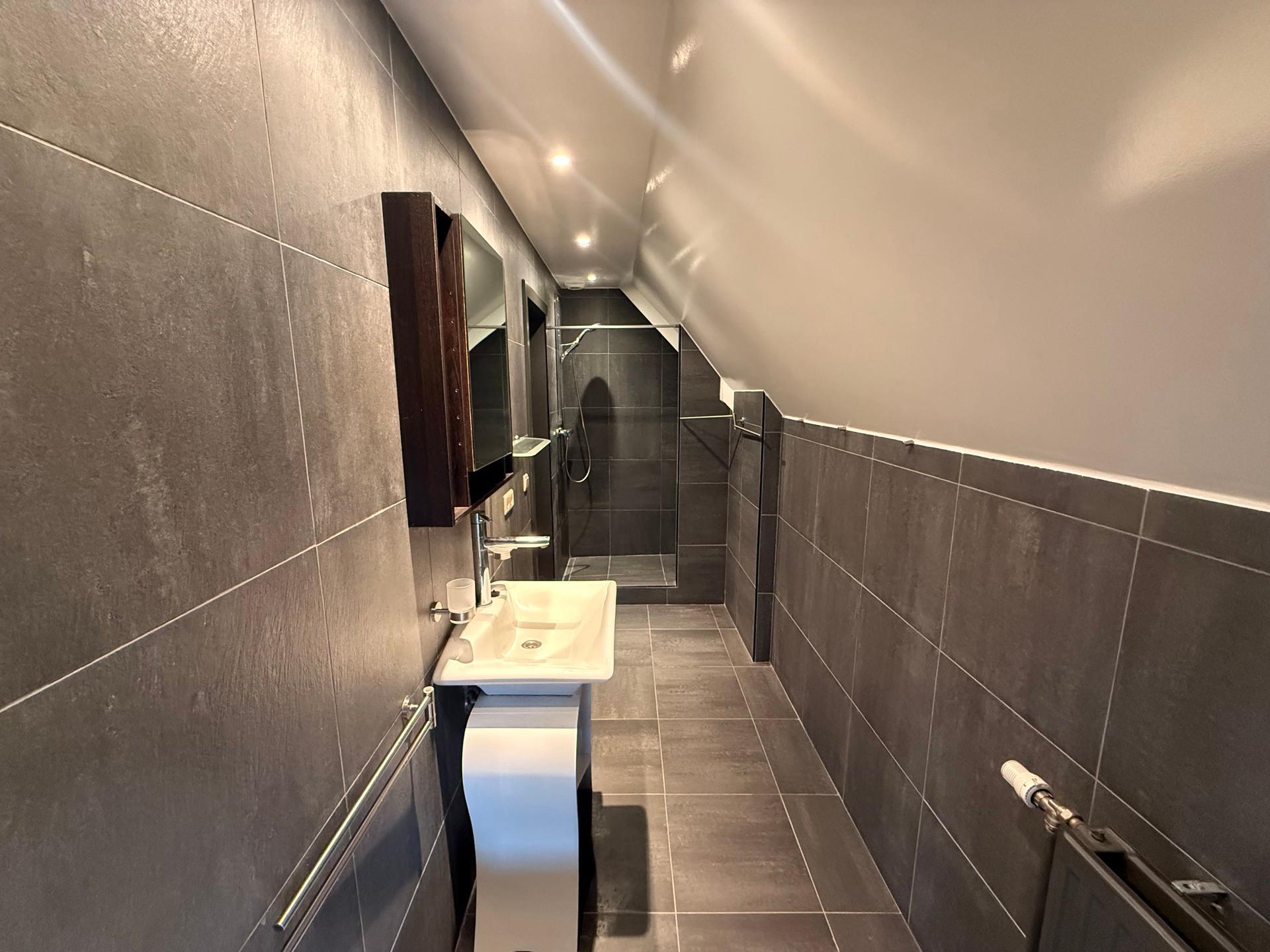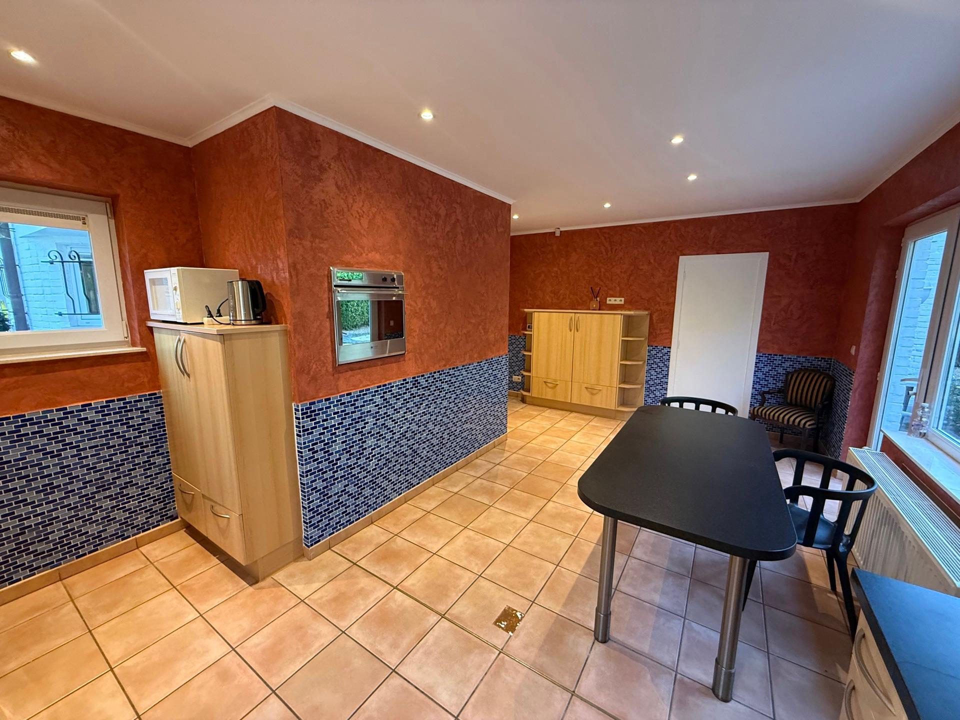 Het gelijkvloers omvat een inkomhal met gastentoilet, een ruime en zeer lichte woonkamer met open haard, een volledig ingerichte keuken met toegang tot het terras, een kelder met nieuwe gasketel en een slaapkamer met dressing en badkamer.