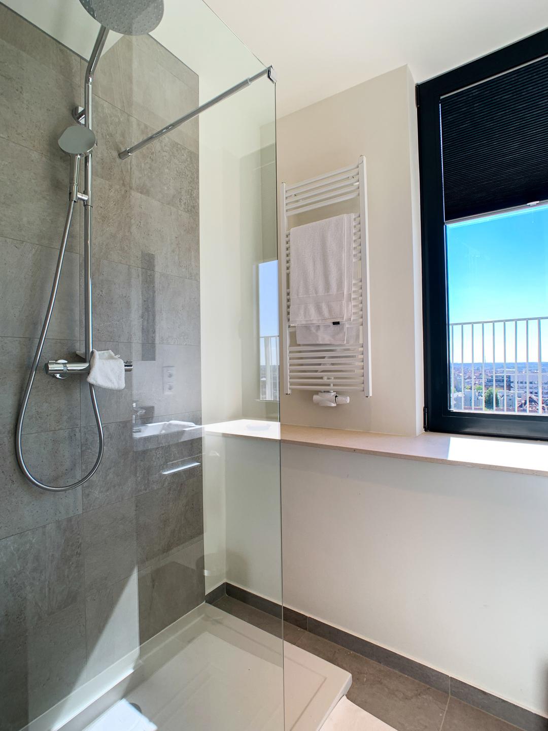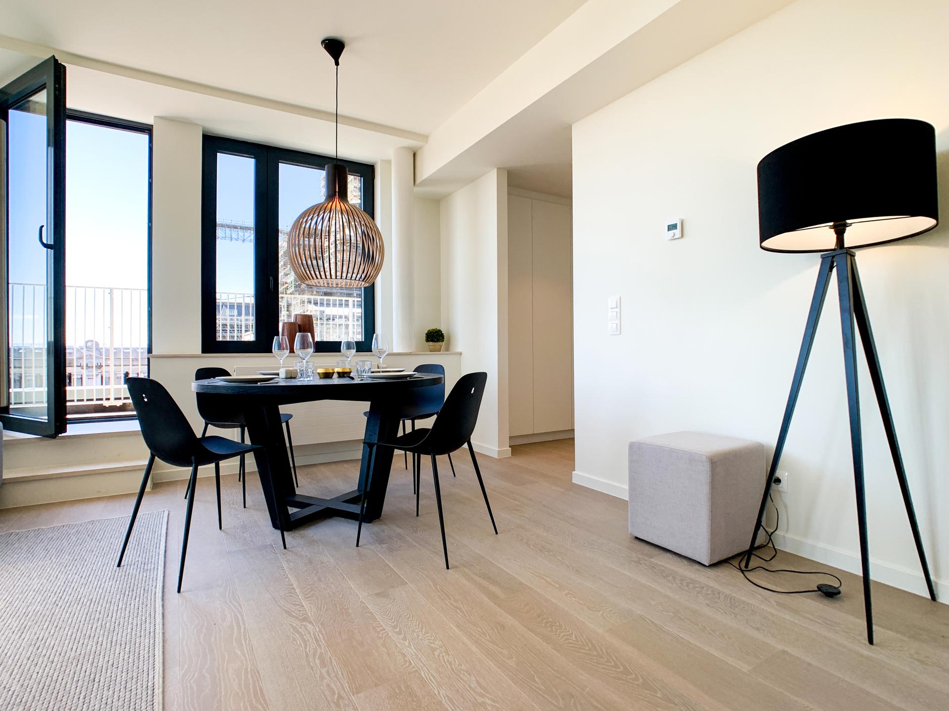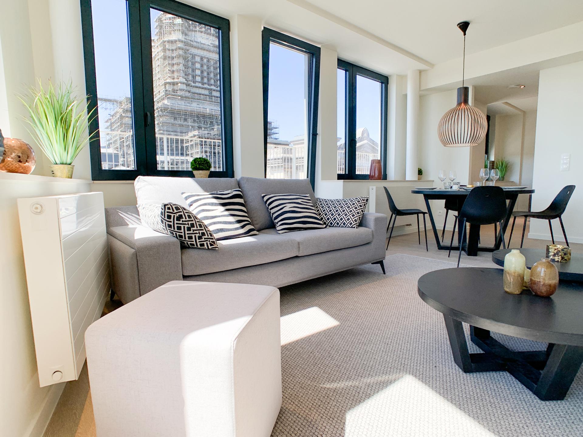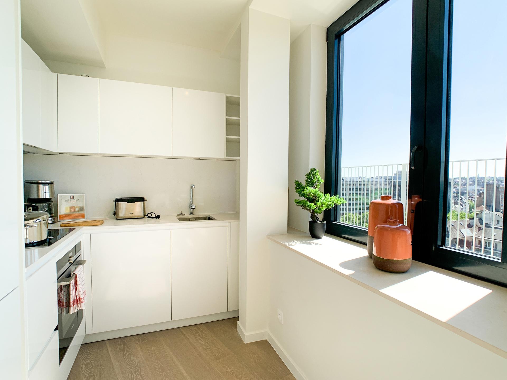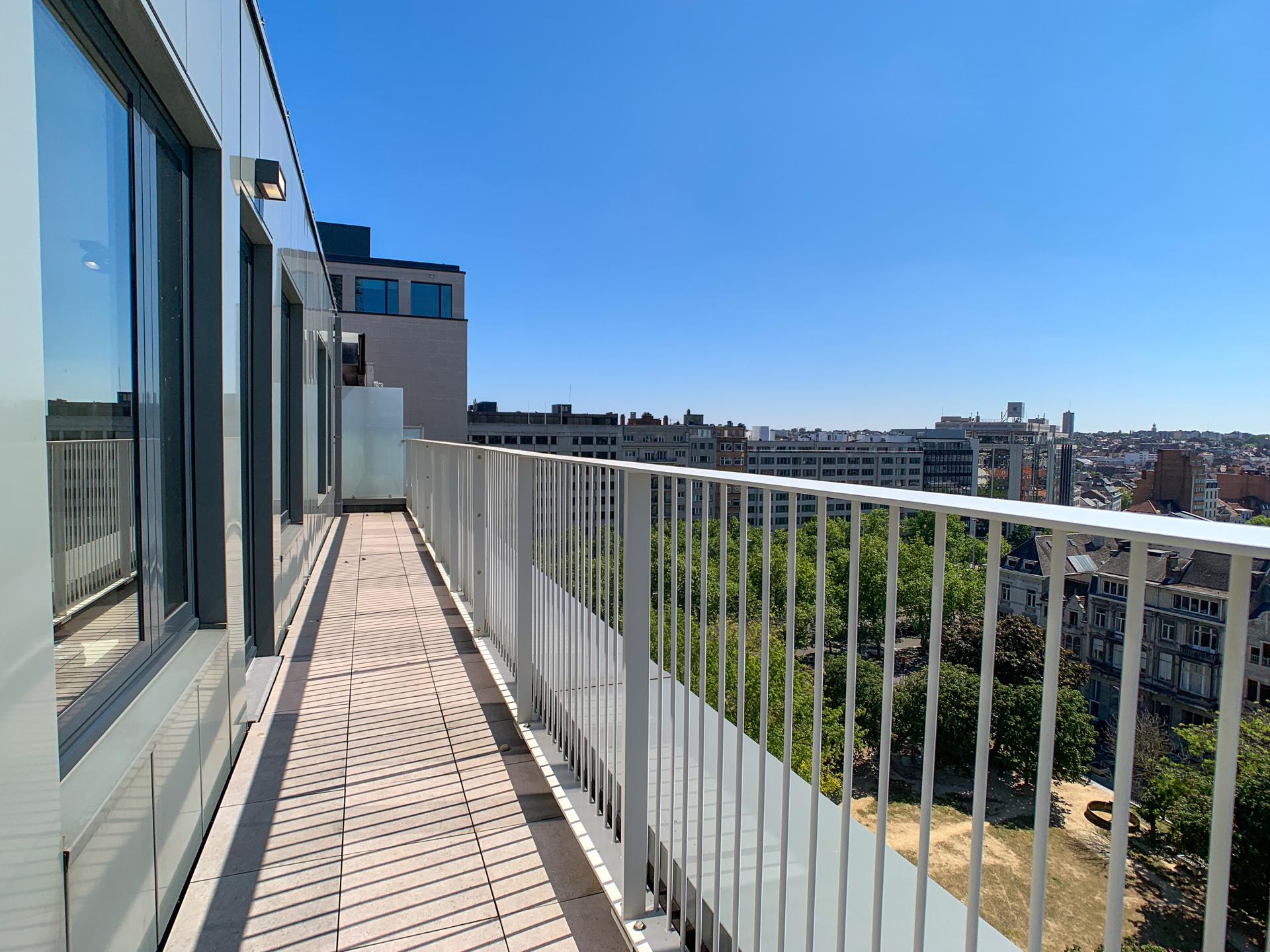BRUSSEL CITY CENTRE, tegenover het Justitiepaleis, sleutelklare PENTHOUSE flat (2bed/2bad) met 29m² TERRAS en dubbele PARKEERPLAATS. Gelegen op de 9e en laatste verdieping van een gebouw gebouwd in 2017, is het appartement, met zijn hoogwaardige afwerking, als volgt samengesteld: inkomhal met vestiaire en gastentoilet, volledig ingerichte open keuken (Bulthaup), woon/eetkamer die uitgeeft op het mooie terras van ±29m² ideaal georiënteerd (zuidwesten), 2 slaapkamers (±12 en 17m²), badkamer (ligbad) en een douchehoek voor de tweede slaapkamer. Alle meubels op de foto's zijn inbegrepen. Een kelder en een parkeerplaats maken dit aanbod compleet (€30.000 niet-optioneel). Mogelijkheid voor een tweede parkeerplaats. PEB C+! Elektriciteit conform. Voorziening van lasten: 350 euro/maand (gemeenschappelijke ruimtes, warm water, verwarming). Een woning om snel te bezichtigen met L&P!