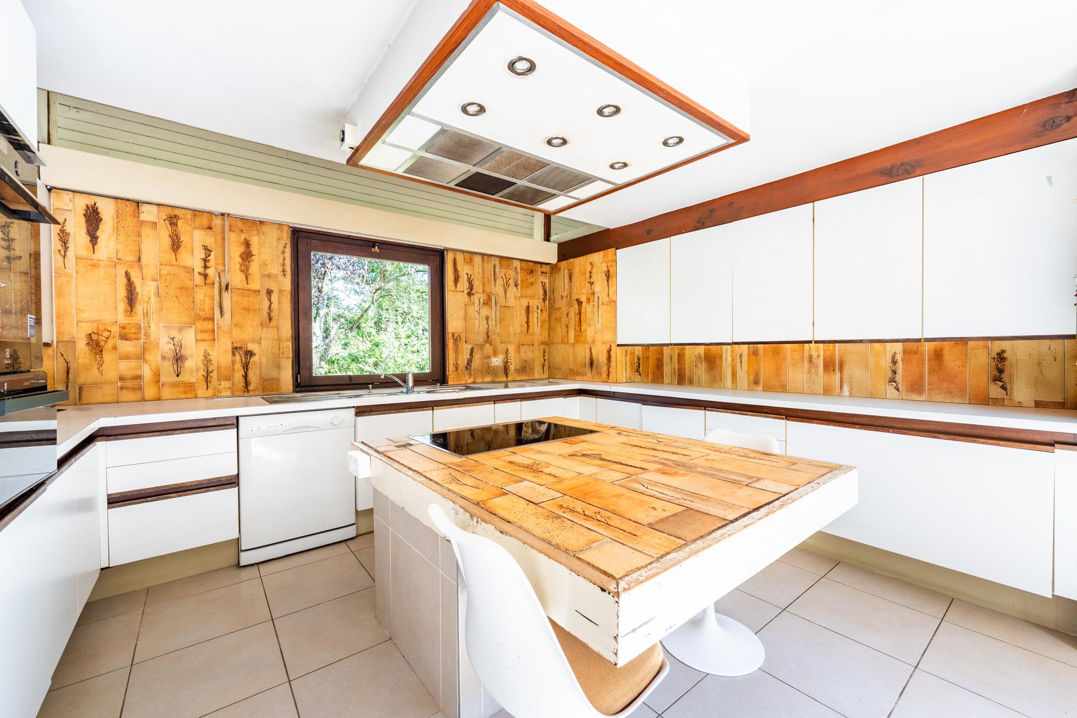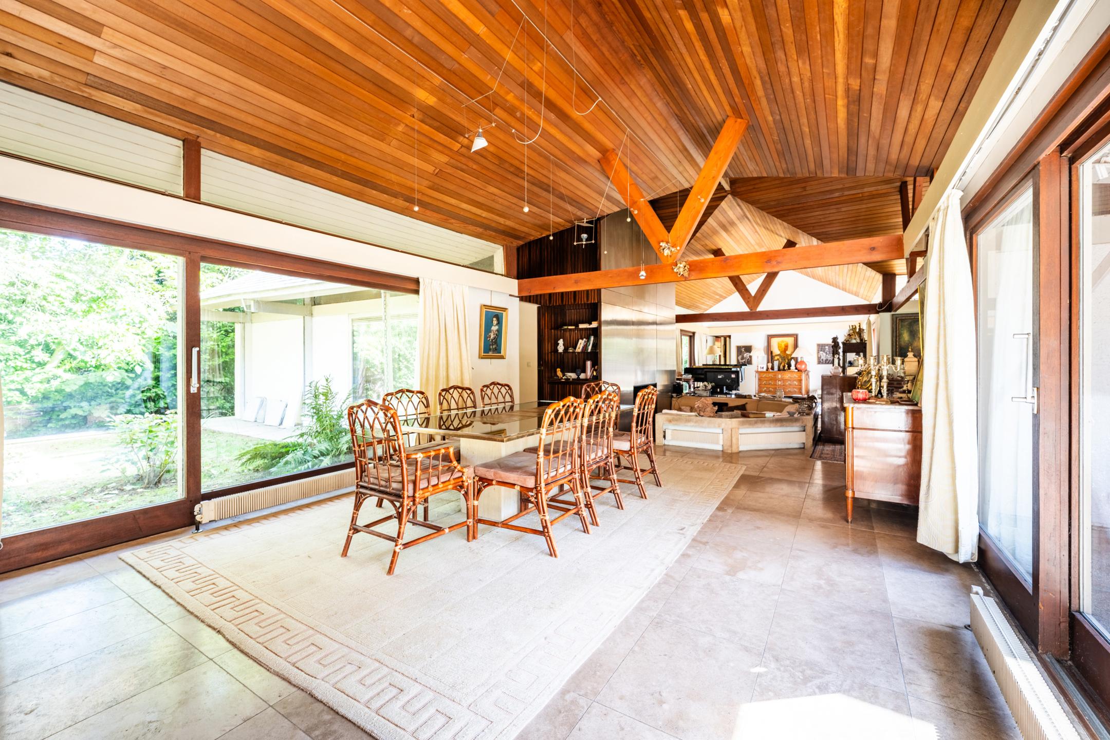 Dagzijde : Inkomhal met vestiaire en gastentoilet, leefruimte met kathedraalplafond bestaande uit twee salons. In het hart van de woning: een zithoek rond de open haard (Macassar-ebben) die de verschillende salons en de eetkamer met elkaar verbindt, ingerichte keuken met kookeiland, wasplaats/berging, garage voor één wagen, secundaire ingang, slaapkamer 1 met badkamer of ruimte voor vrij beroep. Inkomdeurkrukken gesigneerd door Jules Wabbes.