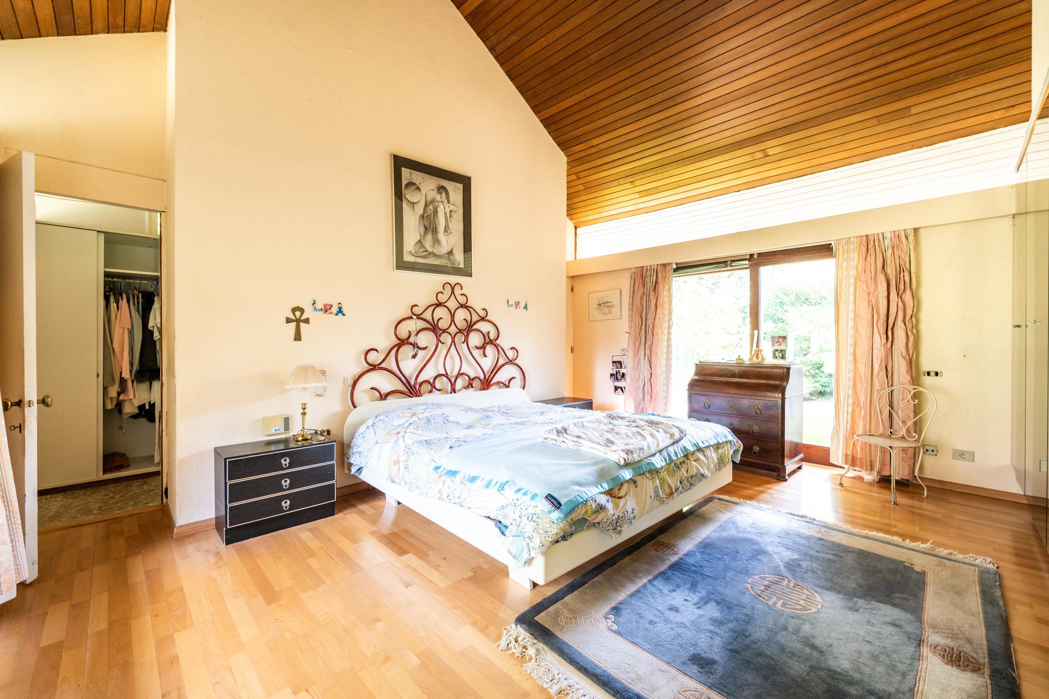 Dagzijde : Inkomhal met vestiaire en gastentoilet, leefruimte met kathedraalplafond bestaande uit twee salons. In het hart van de woning: een zithoek rond de open haard (Macassar-ebben) die de verschillende salons en de eetkamer met elkaar verbindt, ingerichte keuken met kookeiland, wasplaats/berging, garage voor één wagen, secundaire ingang, slaapkamer 1 met badkamer of ruimte voor vrij beroep. Inkomdeurkrukken gesigneerd door Jules Wabbes.