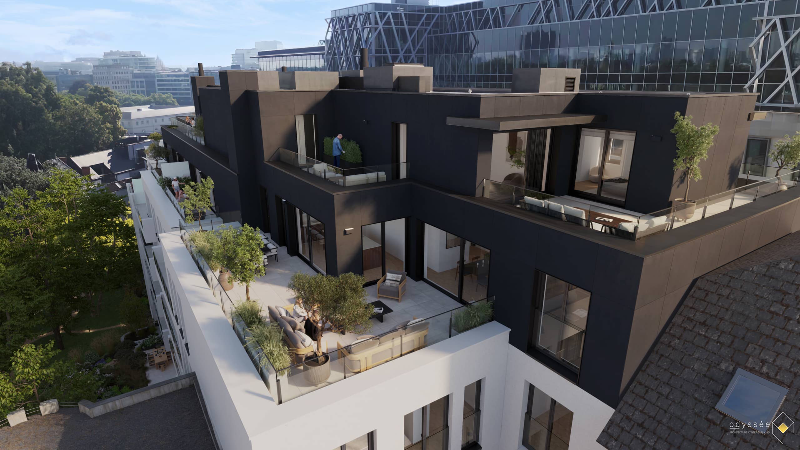 BRUXELLES - Situé à l'arrière des jardins du Palais Royal, dans un beau quartier historique à deux pas du Boulevard de Waterloo, de l'avenue Louise et de nombreuses facilités tant culturelles qu'urbaines (Sablon, Parc Royal, Bozar, commerces et restaurants de qualité, nombreux transports en commun), PENTHOUSE de PRESTIGE (3ch/1sdb/1sdd) de 156,3 m² bénéficiant de 2 GRANDES TERRASSES (41,8 m² au S-O/S-E et 16,6 m² au N-O) et d'un beau JARDIN COMMUN sécurisé. Situé au 6e étage, il se compose d'un hall d'entrée avec WC invités, espace vestiaire et buanderie, un vaste living de 49,7 m² avec cuisine ouverte super équipée s'ouvrant sur les 2 terrasses, une chambre parentale de 16,2 m² et sa salle de bain attenante (double lavabo, bain, douche, WC), deux autres chambres de 12 et 11,7 m² et une salle de douche (lavabo, douche). Les 2 premières chambres donnent accès à la terrasse principale. Niché au cœur de la ville mais à l’abri de l’agitation, l'appartement fait partie d'un immeuble offrant une architecture contemporaine et épurée, des finitions haut de gamme et une approche durable (isolation maximale, ventilation double-flux, toitures vertes, récupération des eaux pluviales,...). Local vélo commun sécurisé. Cave et parking en supplément. PEB A- à B+. Vente sous le régime de la TVA 21%. A découvrir chez L&P !