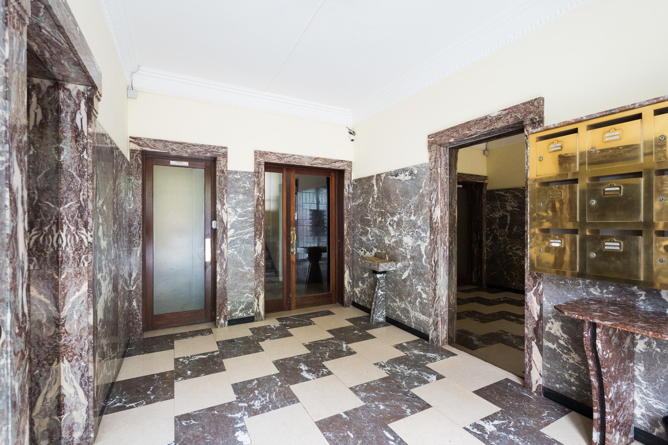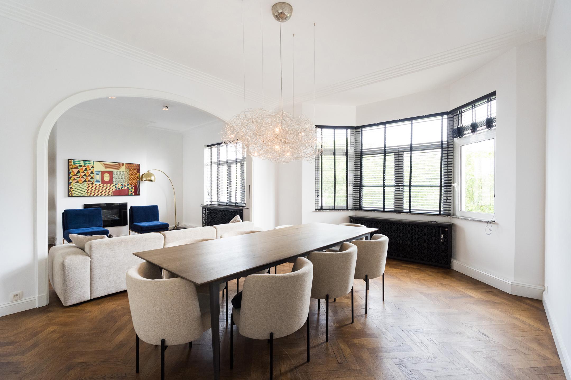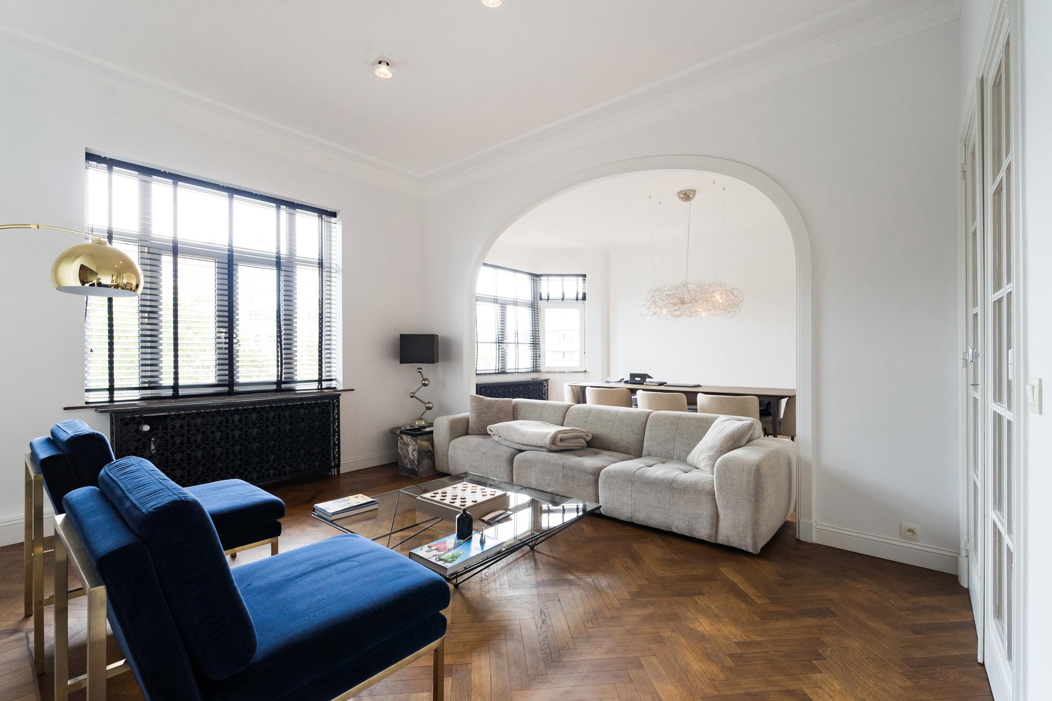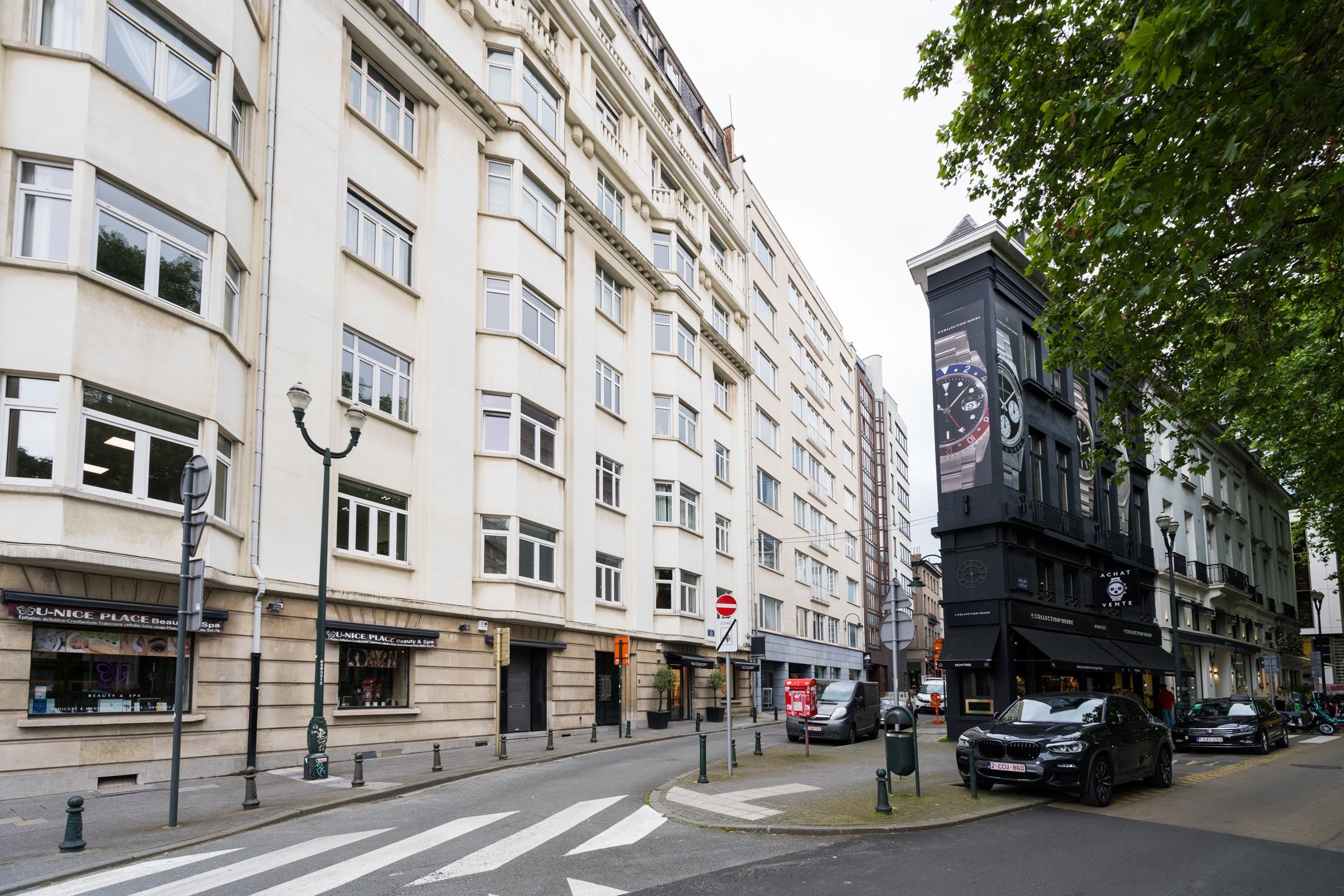 BRUXELLES-Ville, quartier Louise, superbe APPARTEMENT (2Ch/1Sdb) de ±108 m² au 5ème étage d’un magnifique immeuble Art Déco de standing de 1936. L'appartement se compose comme suit : hall d’entrée avec placard de vestiaire et WC invités, lumineuses réceptions de ±55 m² comprenant le salon et la salle à manger et offrant une vue en perspective sans vis-à-vis, cuisine séparé super-équipée avec accès au balcon, hall de nuit avec placards de rangement desservant deux chambres de ±20 m² dont une avec dressing, salle de bains (lavabo, baignoire, douche, WC). Une chambre de bonne et une cave complètent le bien. Châssis PVC double-vitrage. Porte blindée. Vidéophone. Chaudière collective au mazout. PEB G. A visiter sans tarder avec L&P!