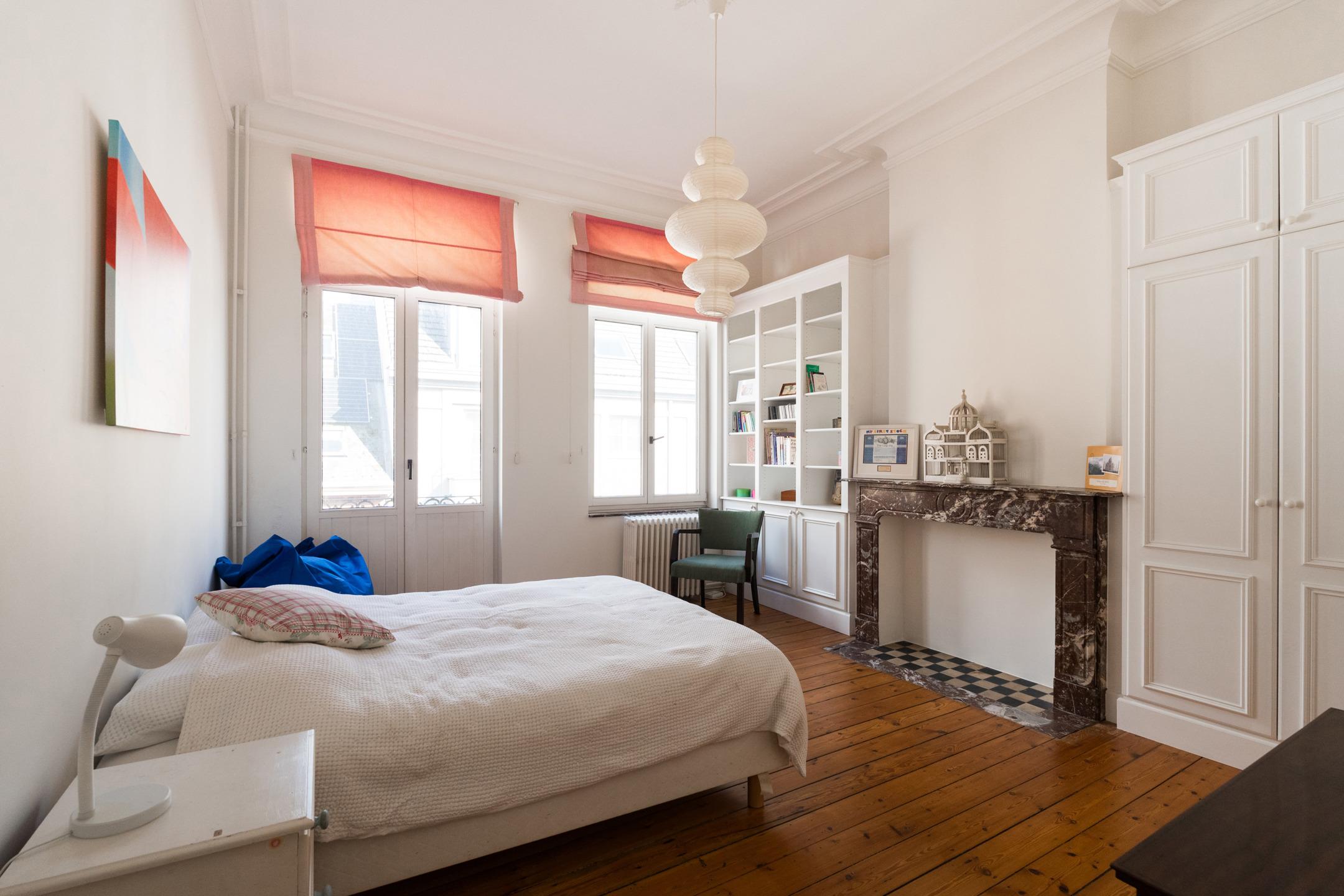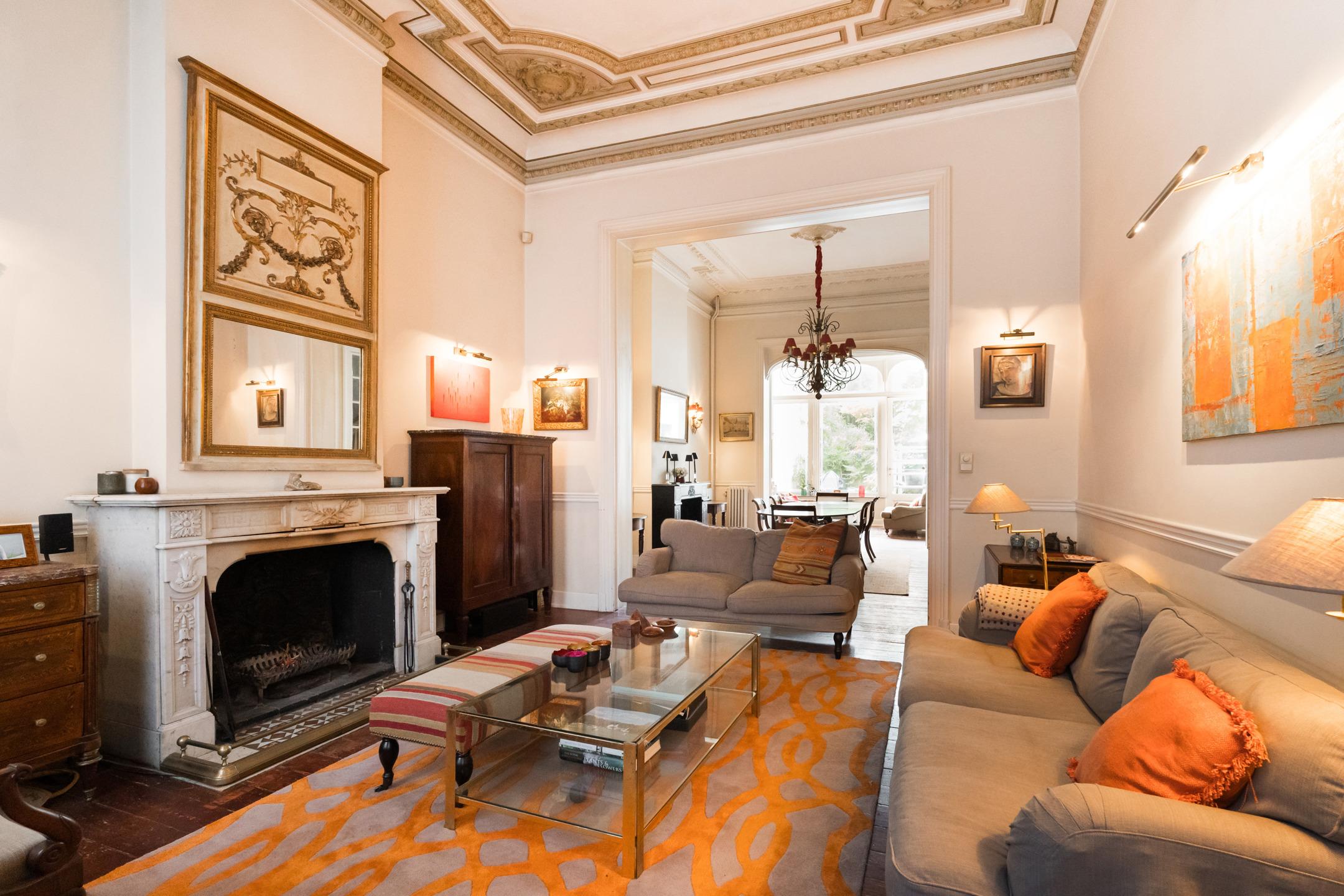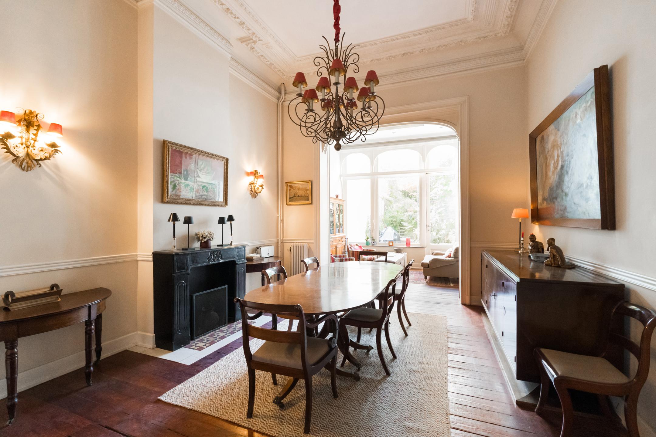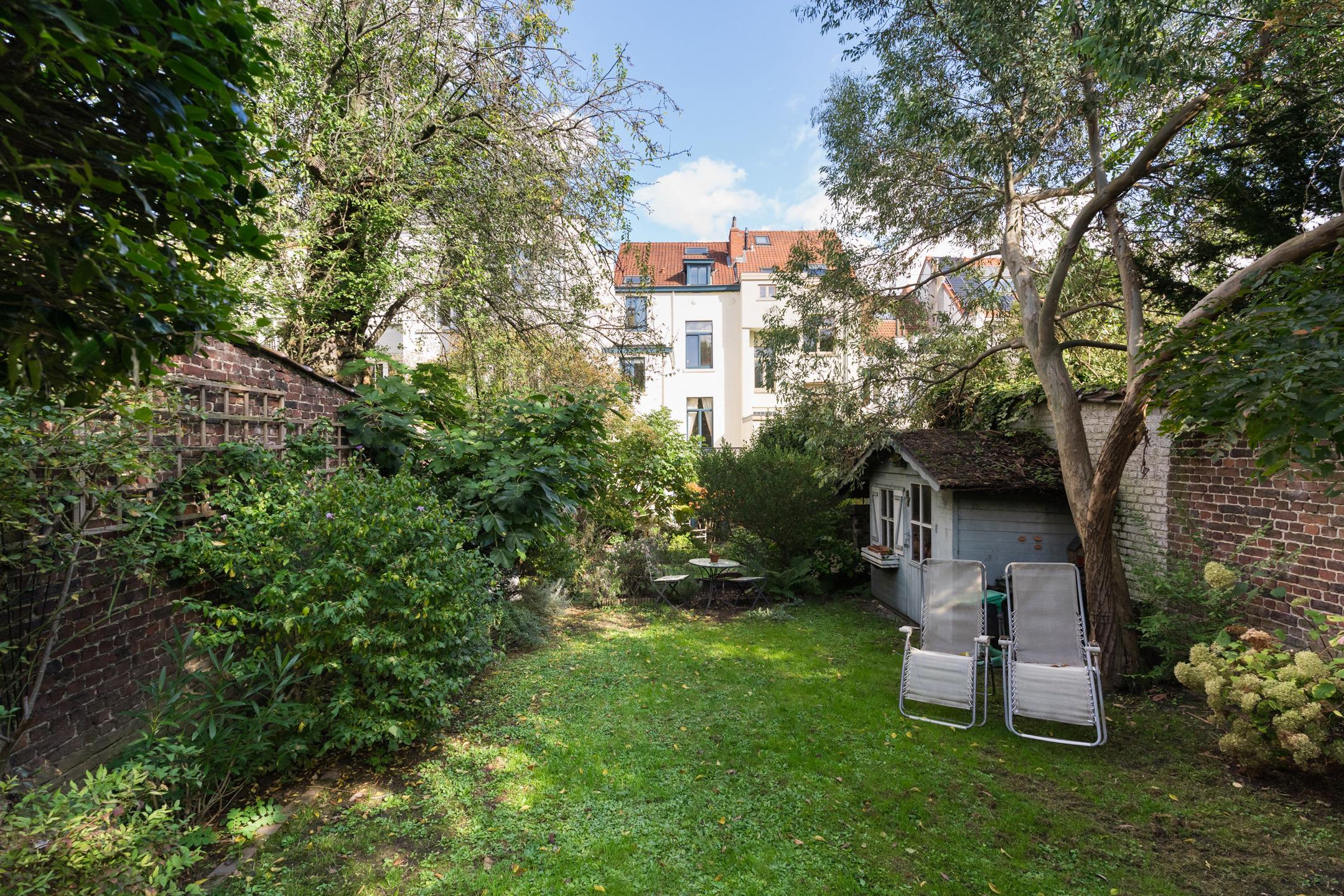 IXELLES - CHATELAIN : Superbe MAISON de Maître (5ch./3sdb./bur.) de 342 m² (selon PEB) développant 6,60 m de façade sur un terrain de 3a65ca. Elle se compose comme suit : Au rez-de-chaussée: Hall d'entrée, superbes réceptions de ± 55 m² comprenant un salon avec feu ouvert fonctionnel, salle à manger de ± 20 m² et un second salon donnant accès à la terrasse et au jardin paysagé sans vis-à-vis de ± 200 m² orientés Sud-Ouest, cuisine équipée séparée. A l'entresol : wc et agréable bureau. Au premier étage: Chambre n°1 de ± 50 m² comprenant un dressing, une salle de bains ainsi qu'une terrasse. Chambre n°2 de ± 13.5 m² en entresol. Au deuxième étage : Chambre n°3 et 4 de ± 22 et 20 m², salle de bains, wc séparé. Au troisième étage : chambre n°5 de ± 21 m² et salle de bains. Studio d'appoint de ± 37 m² comprenant un séjour avec cuisine ouverte et une mezzanine, cet espace est idéal en tant que "Guest room" ou pour "Jeune fille au pair". Au niveau inférieur : Pièces polyvalentes de ± 40 m² actuellement aménagées en buanderie, un cellier, diverses caves et wc. Egalement : Double vitrage en bois - Chaudière au gaz à condensation (2021) - R.U. en cours - PEB F - Possibilité de louer un parking. La maison se présente dans un excellent état général, la plupart des éléments d’époque ont été conservés (parquet, menuiseries, ferronnerie, marbres, moulures et vitraux). Coup de cœur assuré, à découvrir avec L&P.
