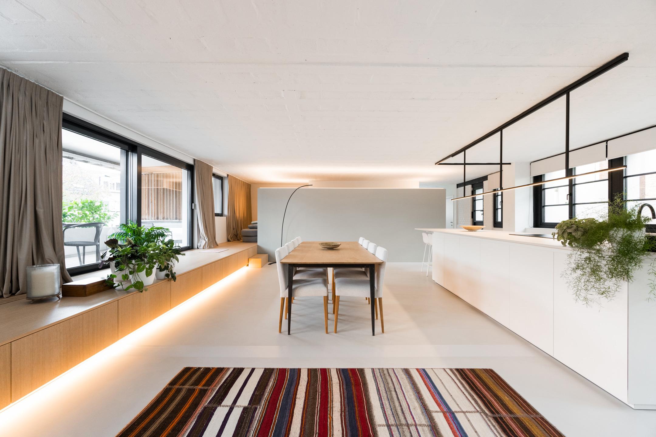A proximité immédiate du célèbre site de Tour&Taxi, des transports en commun et commerces, au 1er étage d’un clos privatif en retrait de la voirie, superbe loft (3ch./1sdd./1sdb) contemporain de ± 304 m² (selon PEB) entièrement rénové par l'architecte Filip Deslee. Il se compose comme suit ; Hall d’entrée, vestiaire équipé avec placards encastrés, bureau de ± 22 m² (ou troisième chambre), wc séparé avec lave-mains, chambre n°1 de ± 17 m² avec salle de douche attenante, ± 30 m² d'espace polyvalents menant aux réceptions de ± 100 m² et comprenant séjour, salle à manger, cuisine américaine hyper-équipée, arrière cuisine. Belle terrasse couverte de ± 10 m² orientée Sud-Est et équipée de volets à vent. Chambre n°2 de ± 17 m² avec son dressing et sa salle de bains. Buanderie et second wc séparé. Également ; PEB B-, porte blindée, vidéophone, chaudière individuelle au gaz à condensation, double vitrage aluminium performant, vaste cave, emplacement de parking extérieur et sécurisé également pour visiteurs. R.U. en cours. Le loft a été entièrement rénové dans un style unique et aménagé de meubles encastrés sur mesure. Un bien extraordinaire à découvrir en exclusivité avec L&P !