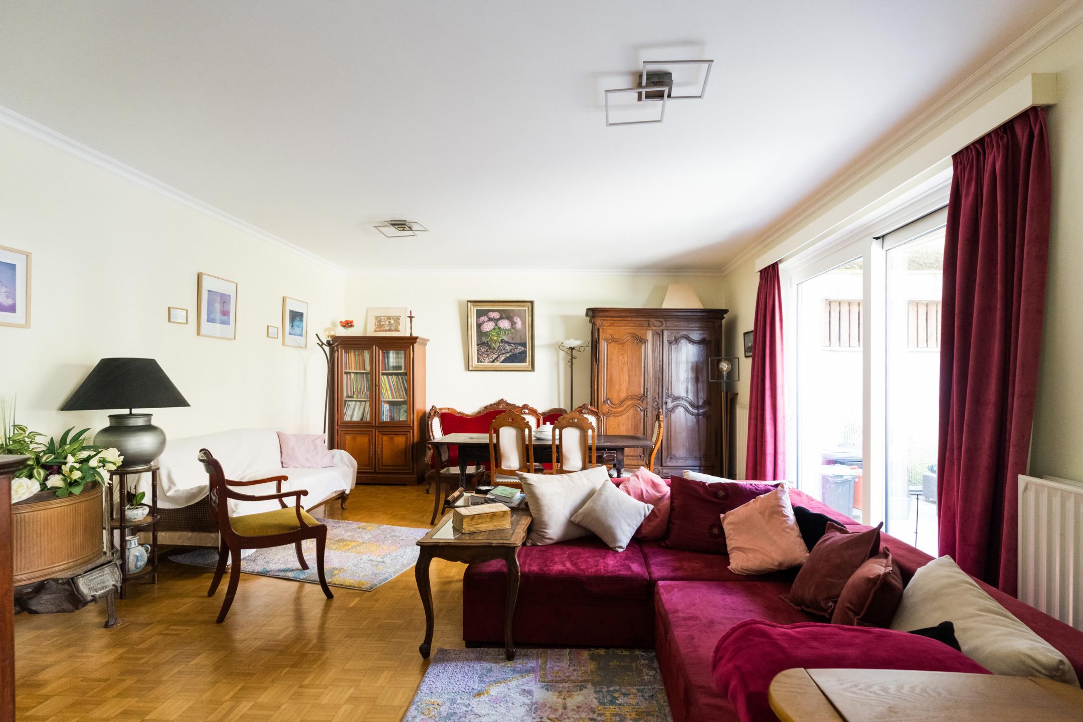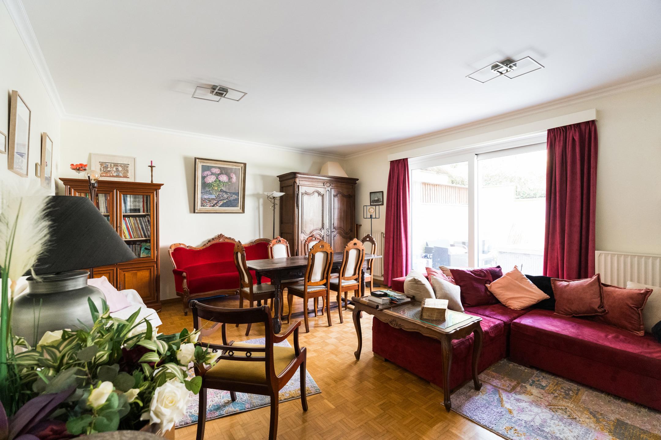 Excellente situation à proximité du Woluwe Shopping Center et autres commerces. Il a une très bonne accessibilité aux transports en commun (connexion rapide au centre-ville et ring - E40 BXL-Liège et à l'aéroport de Zaventem. Beau rez-de-chaussée de ± 126 m² (selon PEB) - à rafraichir, 2 Chambres/2SdB avec 2 belles terrasses de ± 18 et 7 m² et un parking en supplément obligatoire. Il se compose comme suit : hall d'entrée avec wc "visiteur", beau séjour de ± 31 m² avec accès à la grande terrasse de ± 18 m² orientée Ouest, grande cuisine de ± 17 m² équipée, 2 halls de nuit, 2 belles chambres de ± 18 et 15 m² avec accès à la terrasse de 7 m² orientée Sud-est, 1 Sdb + wc, 1 Sdd, espace buanderie/chaufferie, cave n°12 et emplacement de parking n° 24 en supplément obligatoire (+ 25.000 €). Egalement : PEB E (231 kWh/m²/an), électricité conforme, renseignements urbanistiques sur demande, châssis double vitrage de 2021, chaudière individuelle au gaz (2011), alarme, vidéophonie neuve. Quartier résidentiel calme et recherché ! A visiter sans attendre !