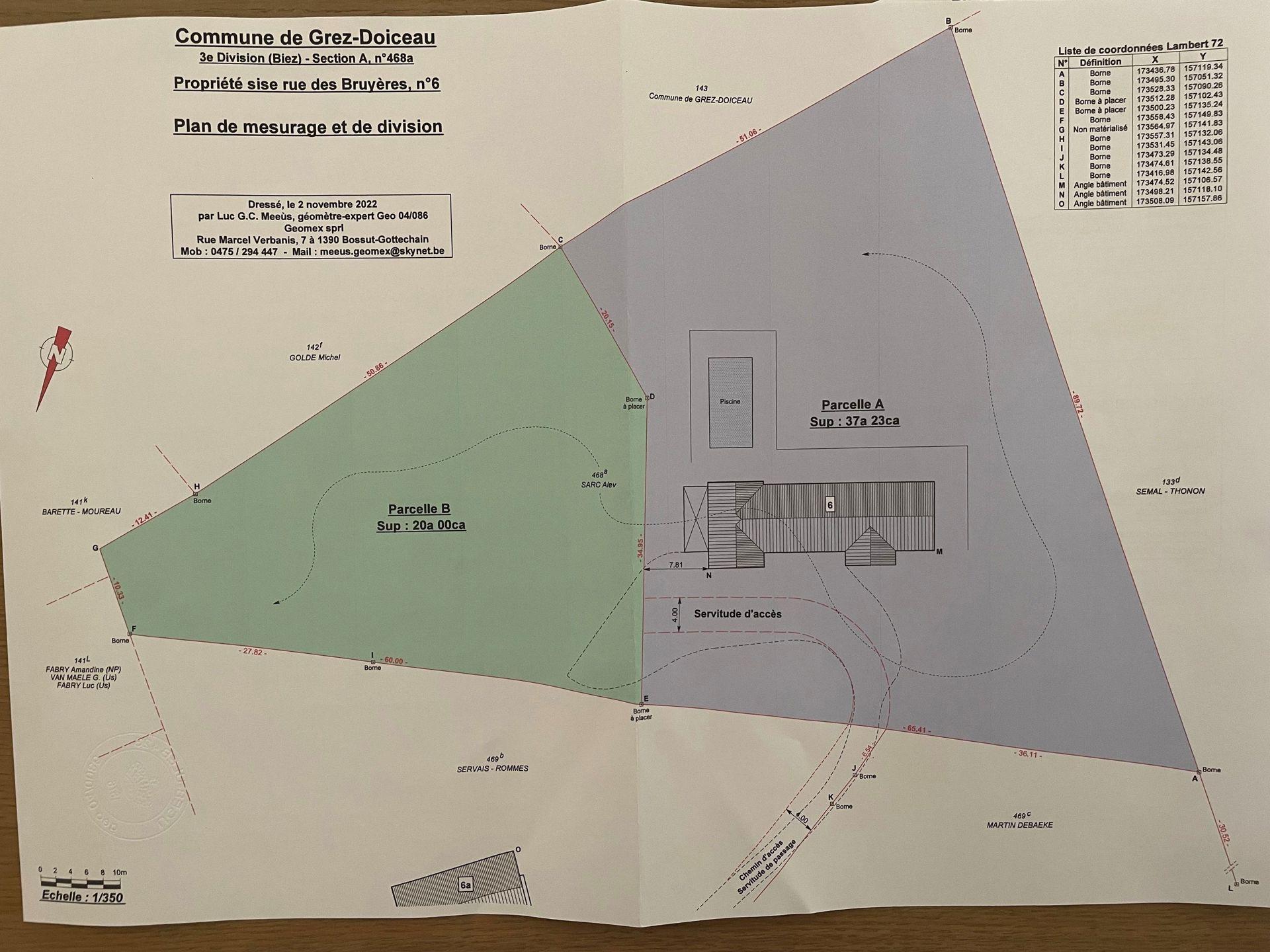 GREZ DOICEAU, sur les hauteurs du hameau de Biez, chaleureuse VILLA (6ch/5sdb/bureau) située dans un environnement d'exception ! Bâtie sur un terrain de fond de près de 37 ares, elle totalise 430m² dont +/- 360m² habitables. Dans sa configuration actuelle, elle se compose d'une vaste partie unifamiliale (+/-240m² habitables), d'un bel appartement annexe (actuellement loué - 70m²-2ch/1sdb), garages et caves. Les abords sont soigneusement aménagés avec de vastes terrasses, une belle piscine, serre, car port et zone de stationnements avec servitude de passage pour le terrain voisin. PEB D (264kWh/m²/an) et E (appartement), électricité conforme. Un bien aux caractéristiques uniques, à découvrir avec L&P.