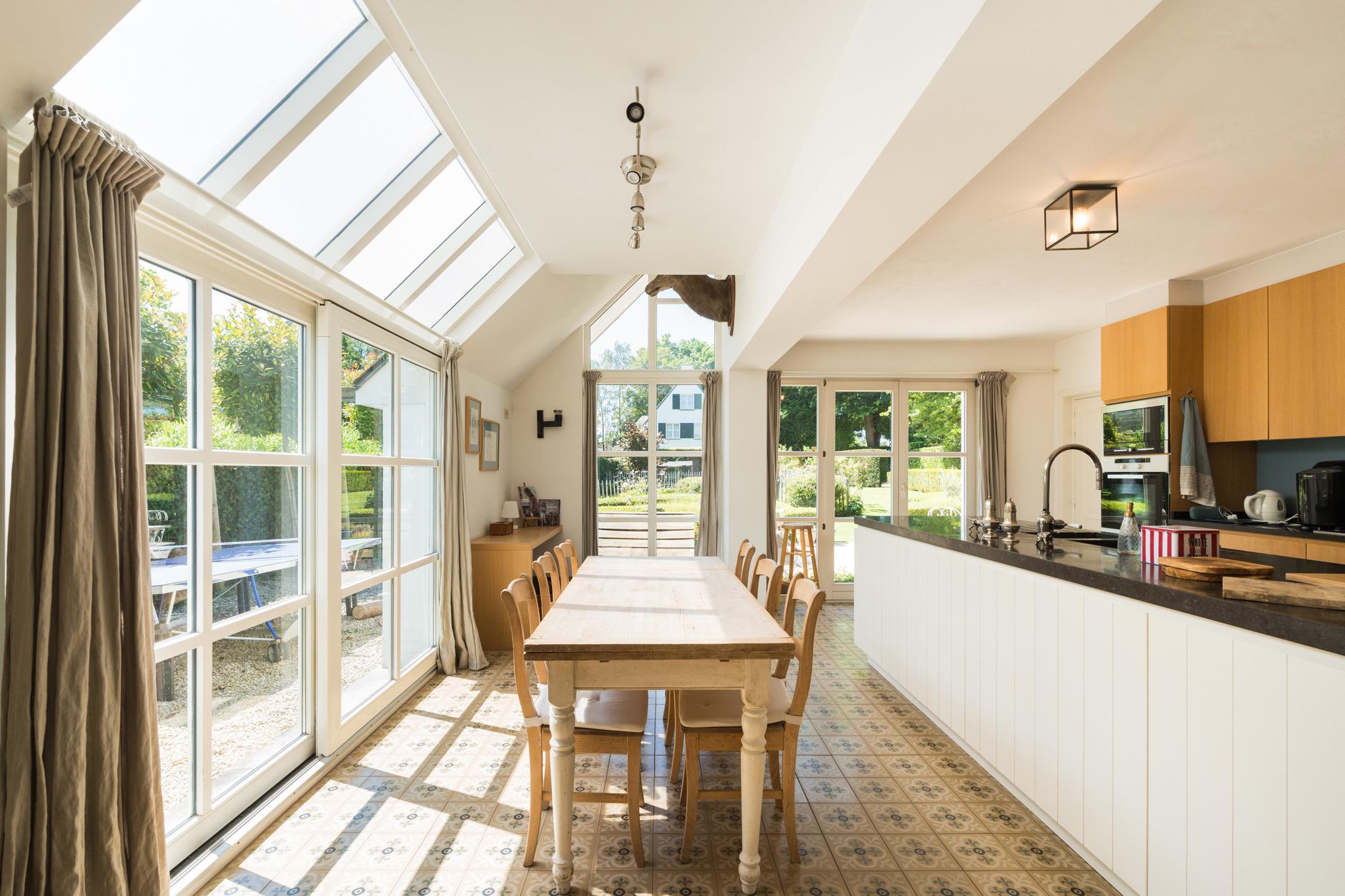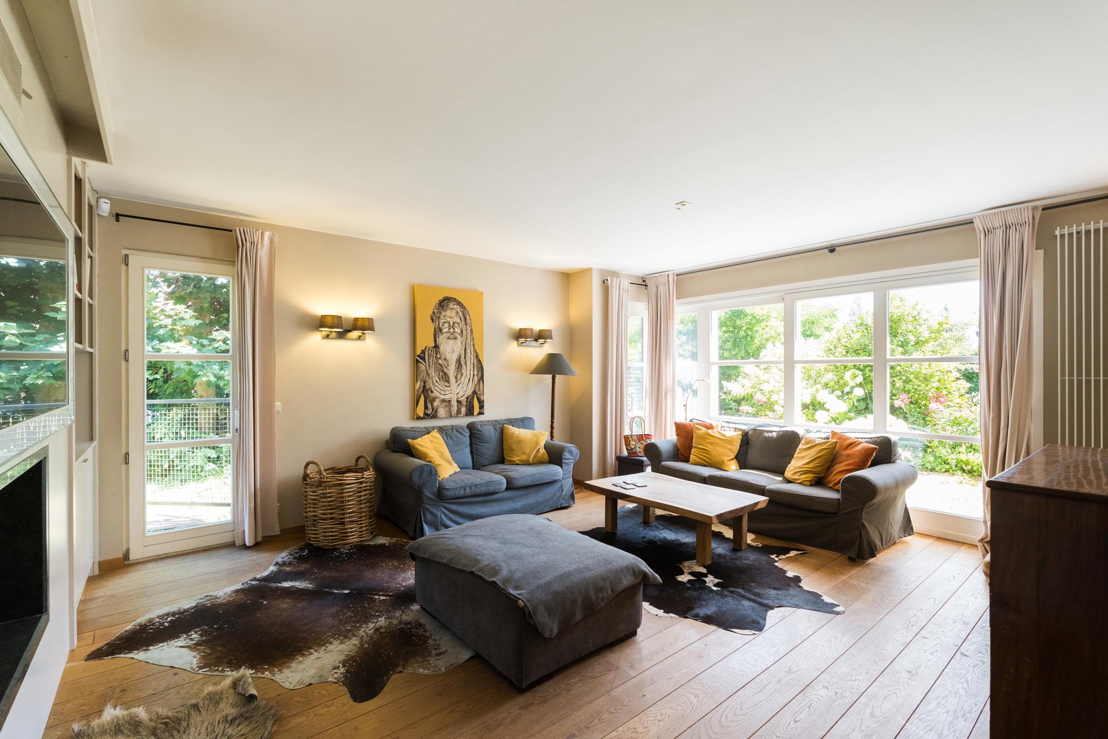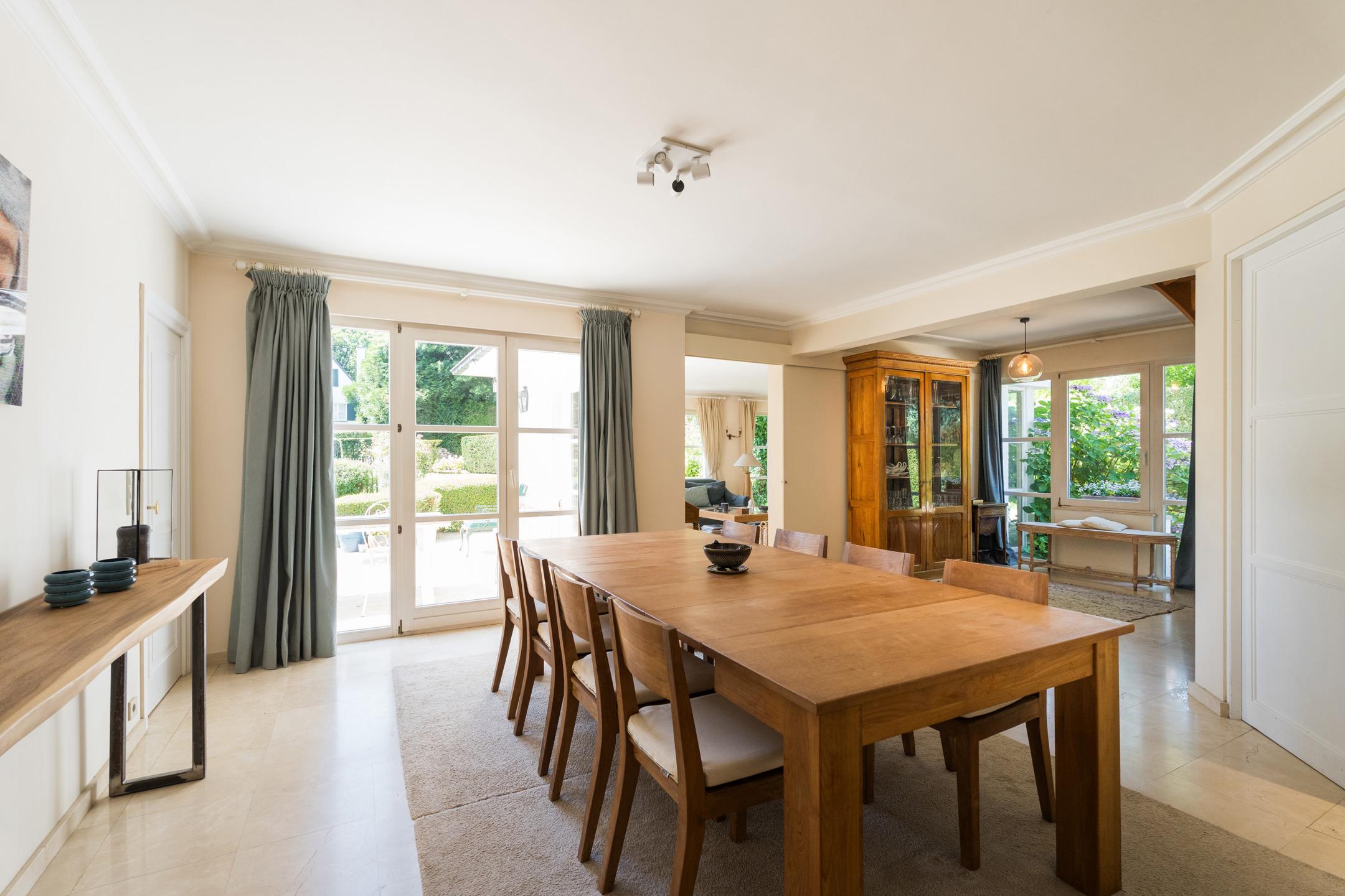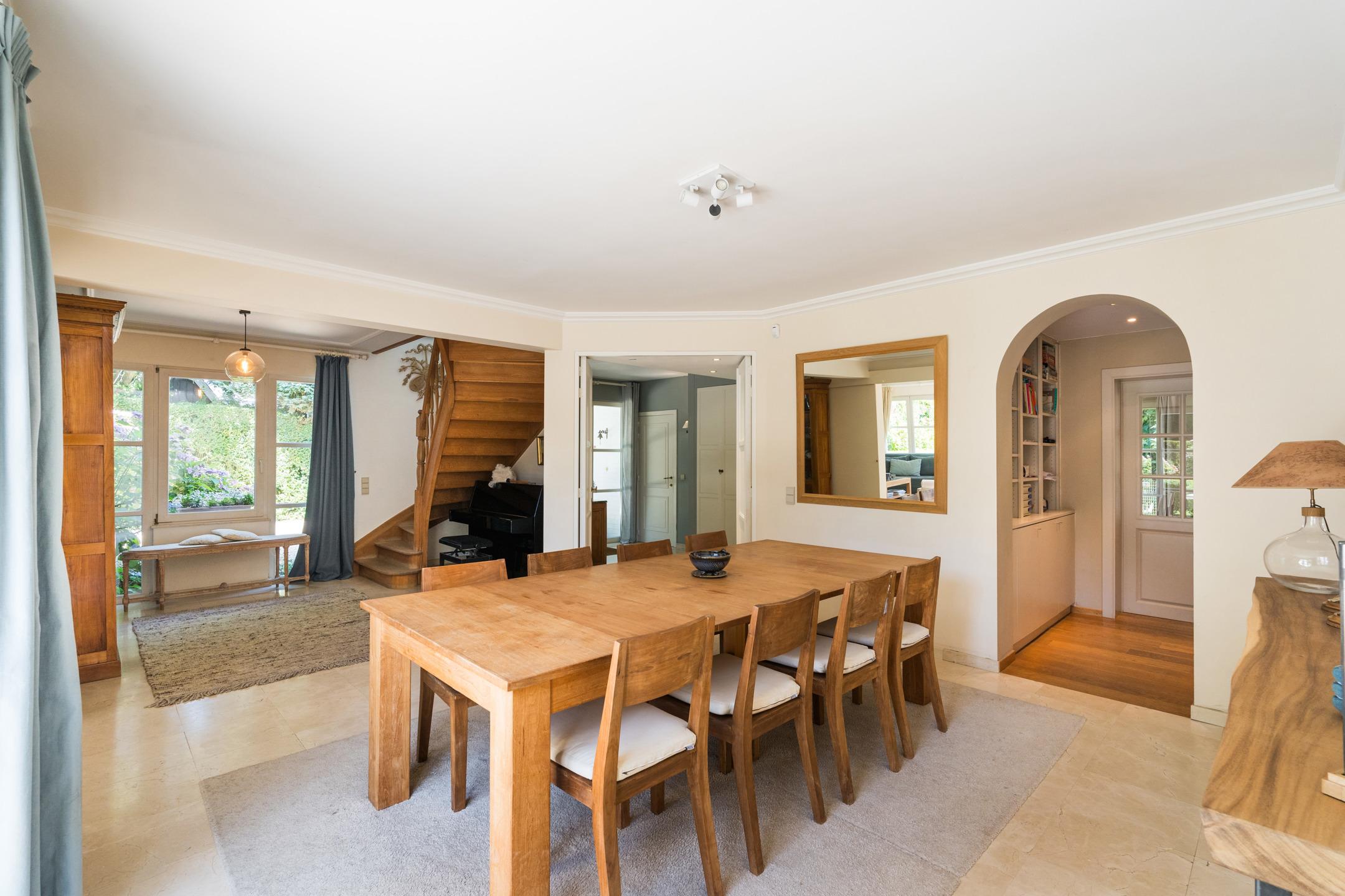 Au rez-de-chaussée : Hall d’entrée avec vestiaire et toilette invités, salle à manger, un premier salon avec feu ouvert au bois, une cuisine avec coin déjeuner, second salon avec feu au bois et bibliothèque intégrée, débarras. Accès au garage pour une voiture avec coin buanderie.